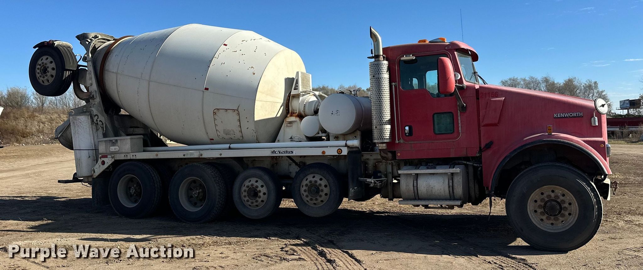 2006 Kenworth W900 ready mix truck. Miles: 348,027 on odometer, Hours: 25,088 on meter, VIN: 1NKWL00X26J125405, Unit #: 21156. Engine Cummins ISM 350V, Displacement: 10.8L, Cylinders: 6, Fuel type: Diesel. Transmission Allison, Automatic. Chassis Axles: 5, Pusher axle Steerable, Tag axle Steerable, Differential lock: Full, Suspension: Spring over walking beam, Brakes: Air, PTO. Interior AC, Heat, Heated mirrors, Power windows, Power locks, Cruise control, Auxiliary controls. Features Mixer McNeilus, Discharge: Rear, In-cab controls, Water tank capacity: 150 gallons, Chute Extensions: 3, Chute type: Steel.. Tires Front: 425/65R22.5, Rear: 11R22.5, Lift axle: 11R22.5. Notes Dash warning indicator: Check engine, Windshield chipped or cracked. Minnesota title. Title distribution may be delayed up to 14 days from verification of funds. Knife River. Little Falls, MN 56345