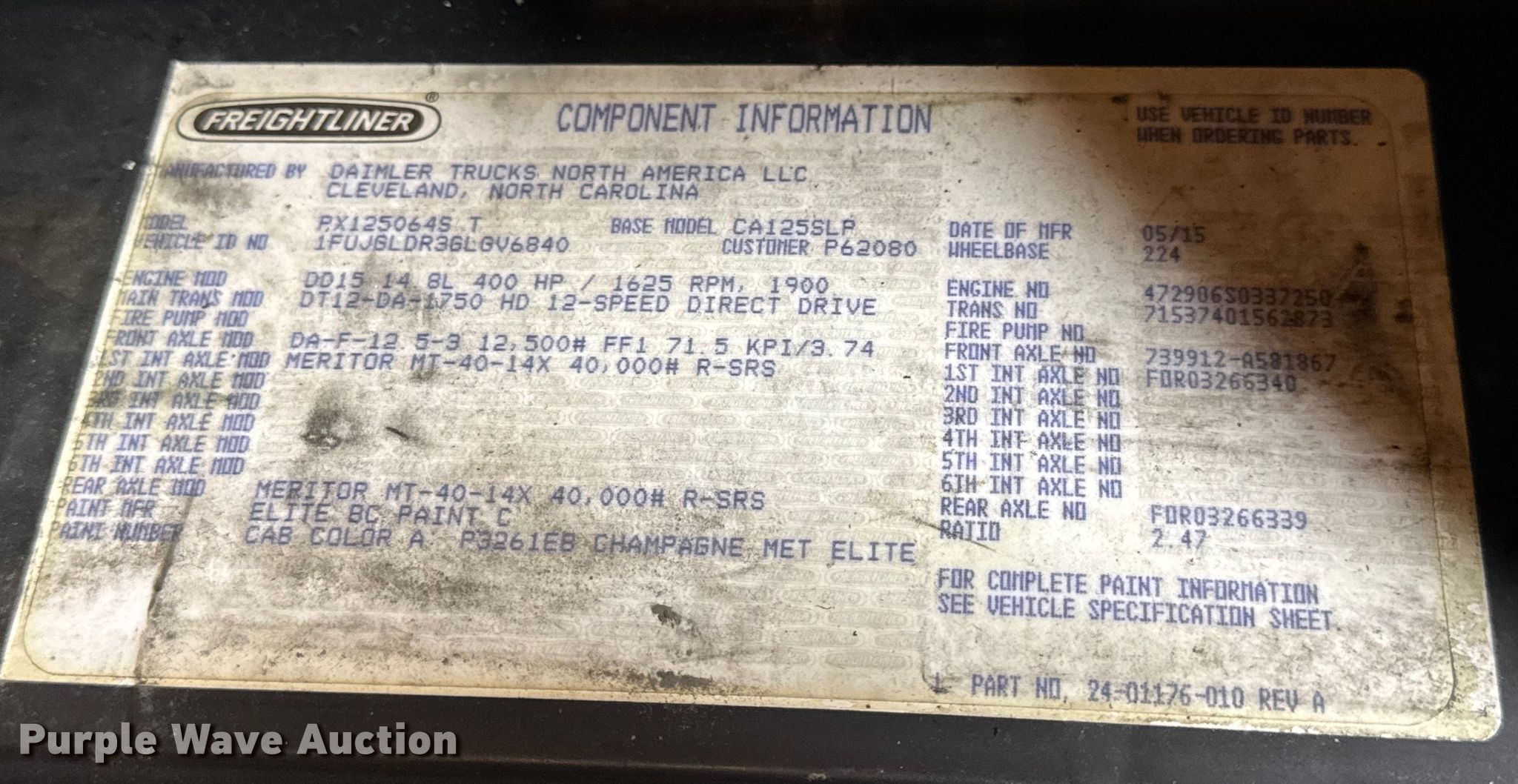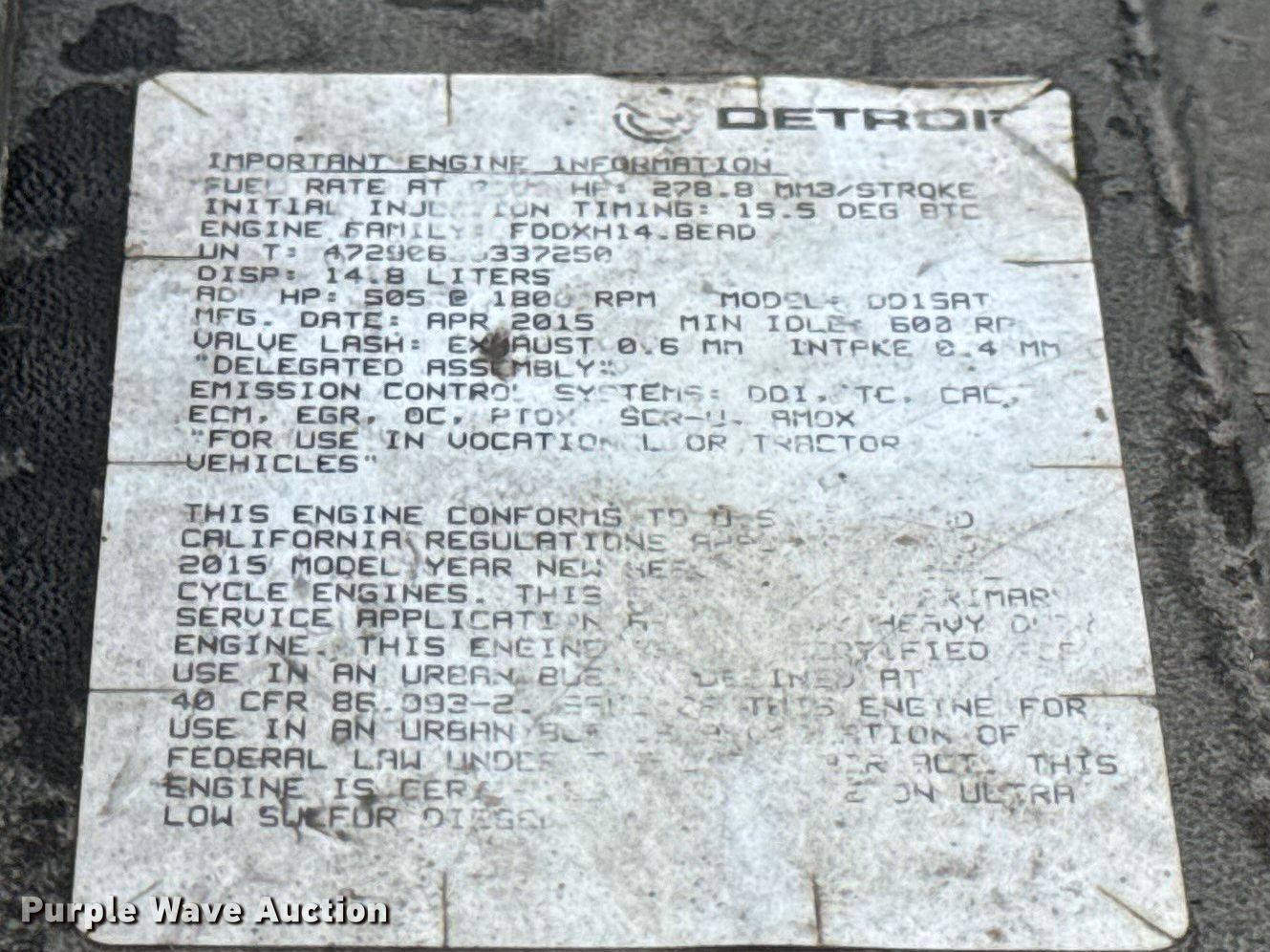 2016 Freightliner Cascadia semi truck. Miles: 787,381 on odometer, Hours: 29,959 on meter, VIN: 1FUJGLDR3GLGV6840. Engine Detroit Diesel DD15, Displacement: 14.8L, Cylinders: 6, Fuel type: Diesel. Transmission Automated manual. Chassis Axles: Tandem, Differential lock: Inter-axle, Suspension: Air, Brakes: Air, GVWR: 52,000 lbs FAWR: 12,500 lbs, IAWR: 20,000 lbs, RAWR: 20,000 lbs. Interior AC, Heat, Heated mirrors, Power windows, Cruise control, Air ride cab, Sleeper Sleeper length: 64", Beds: Double bunk, Rear climate control. Features Deck plate: Aluminum, Fifth wheel type: Air operated, Sliding, Fuel tank: Dual. Tires Front: 295/75R22.5, Rear: 275/80R22.5. Notes Dash warning indicator: Check engine, ABS, Coolant level. Missouri title. Title distribution may be delayed up to 14 days from verification of funds. Palmatory's Truck & Trailer Service. Moberly, MO 65270