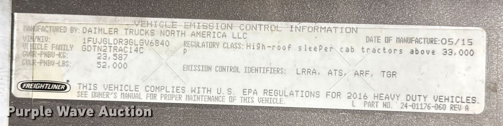 Take a look at this used 2016 Freightliner Cascadia semi truck being sold on December 31st, 2025 in the Wednesday December 31 Truck and Trailer Auction made by Freightliner. Take a look at all of the item information below or take a look at similar auctions for Trucks.