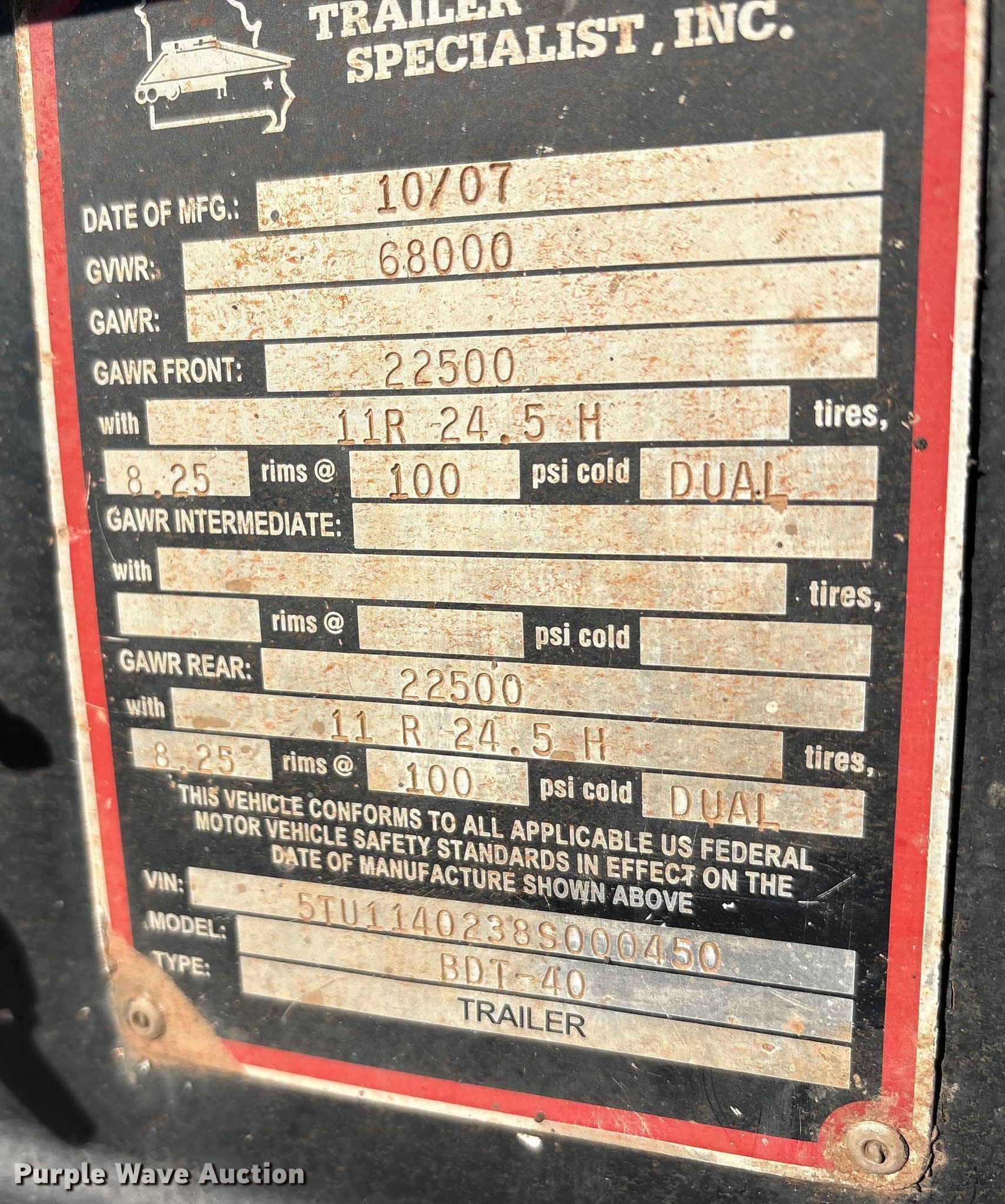 Purple Wave is selling a used Bottom Dump Trailer in Oklahoma. This item is a 2008 Construction Trailer Specialist BDT-40 bottom dump trailer with the following: VIN: 5TU1140238S000450