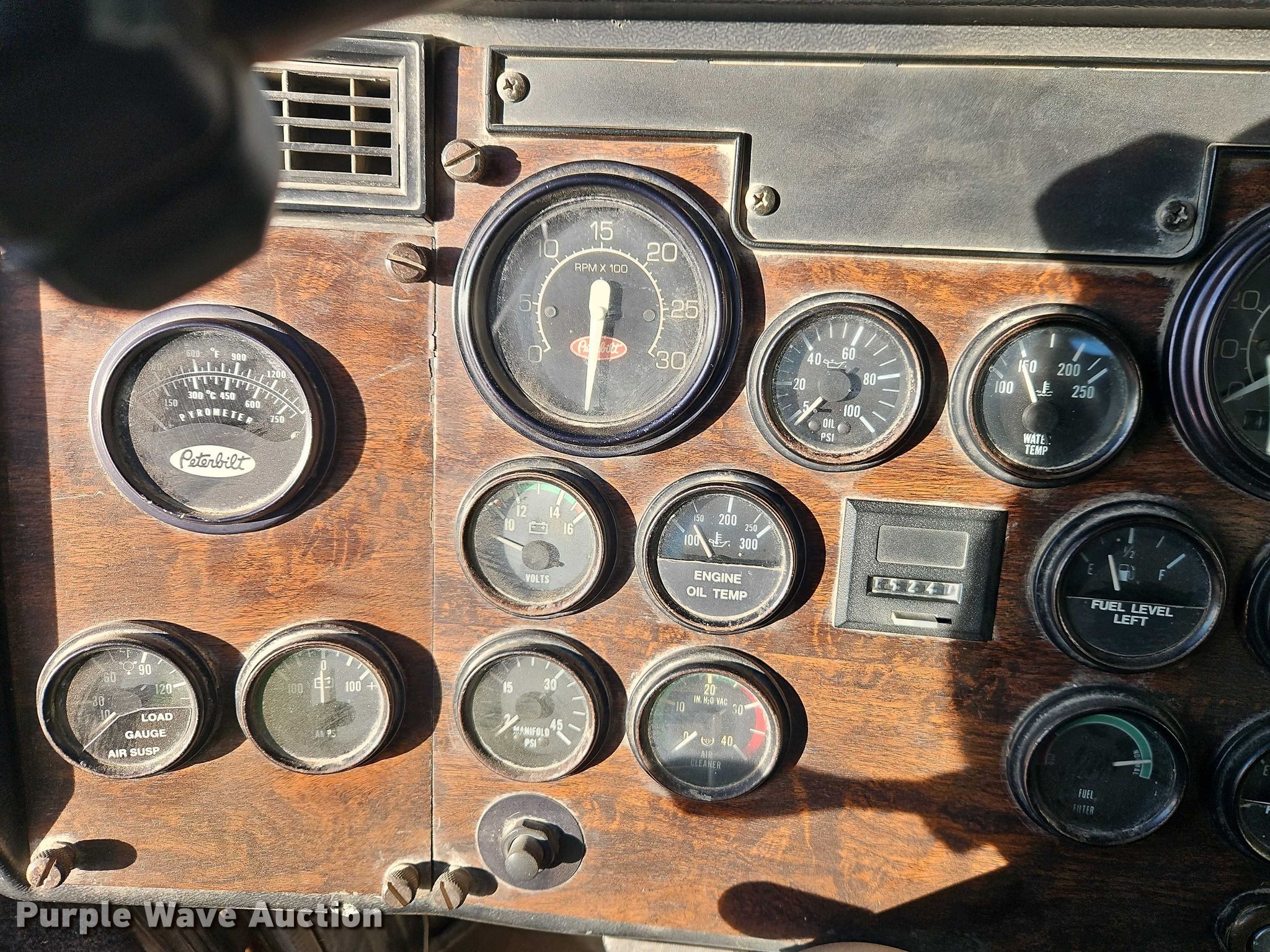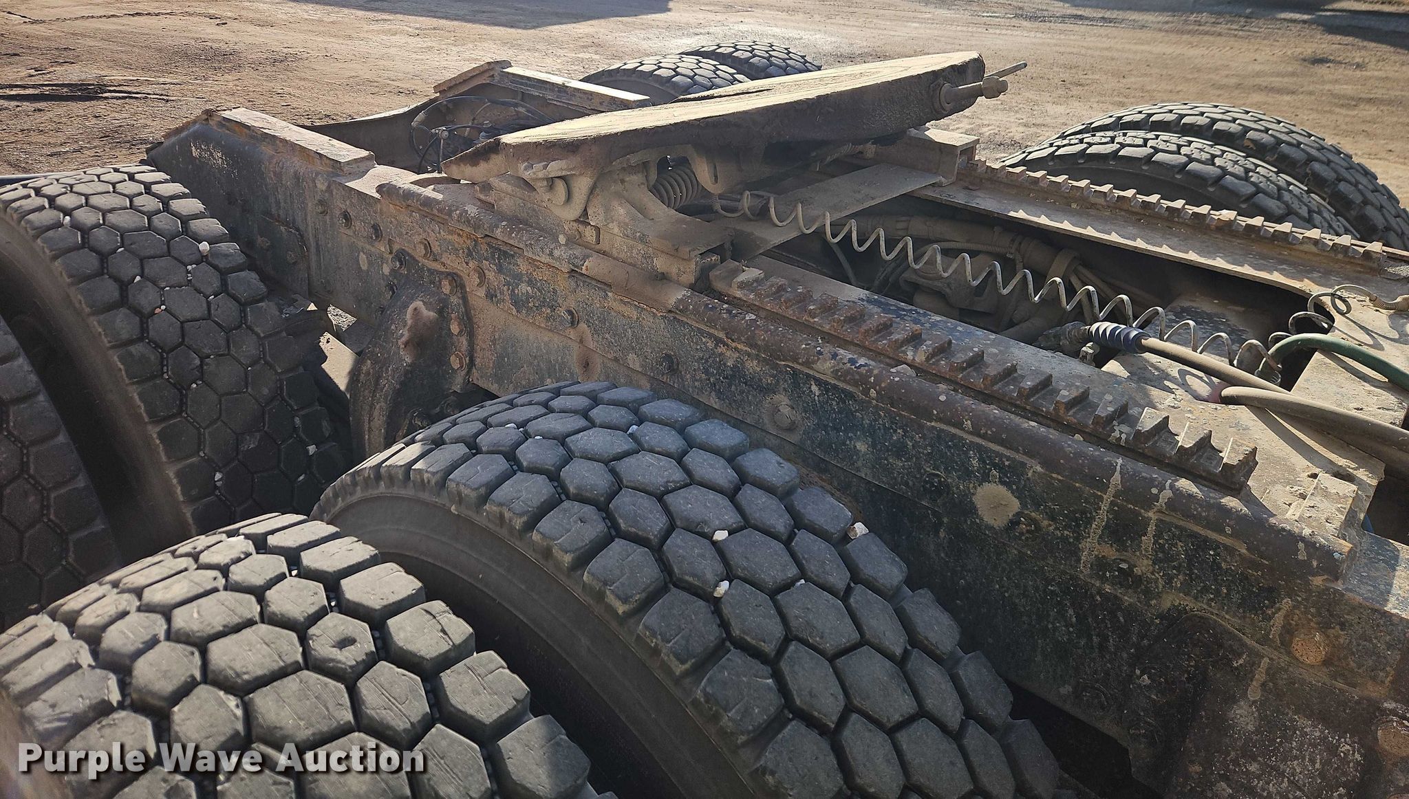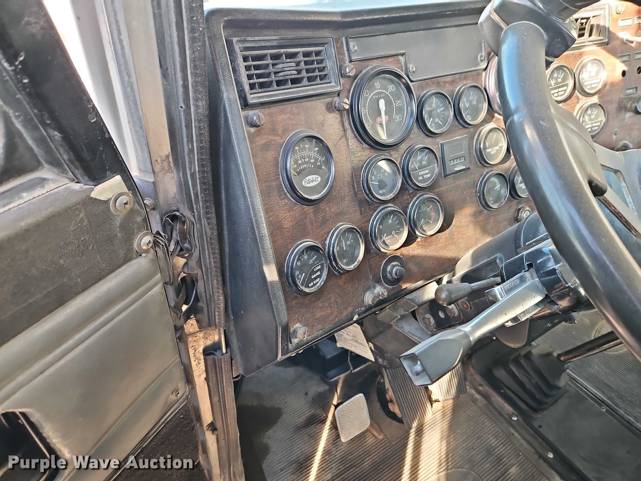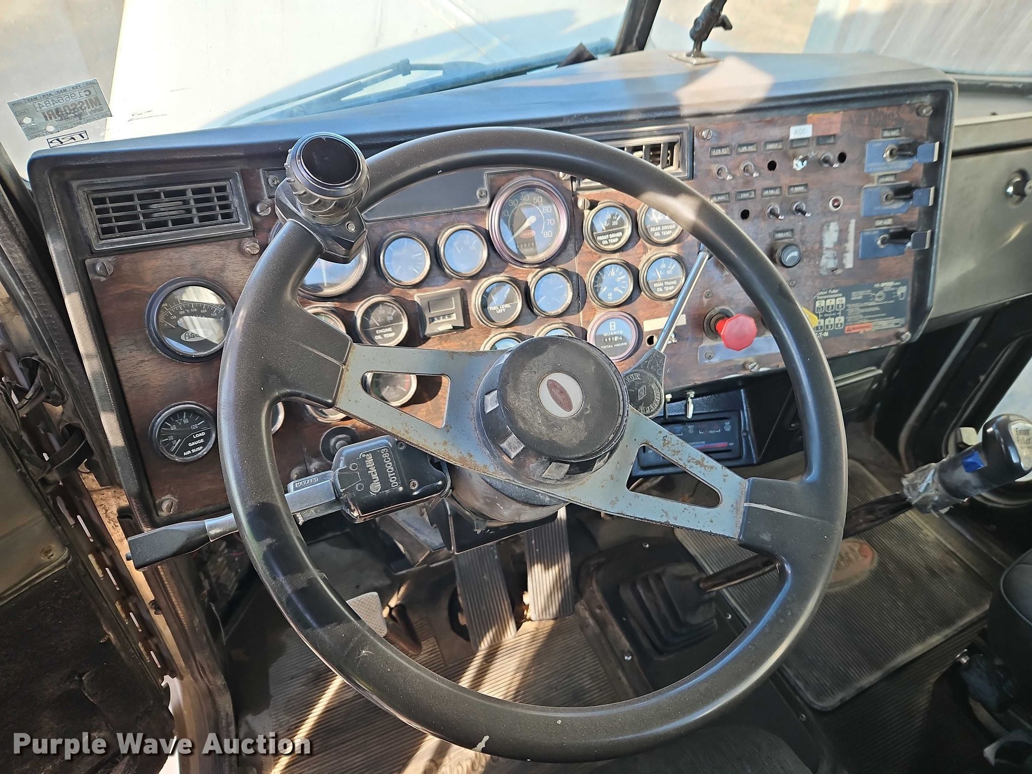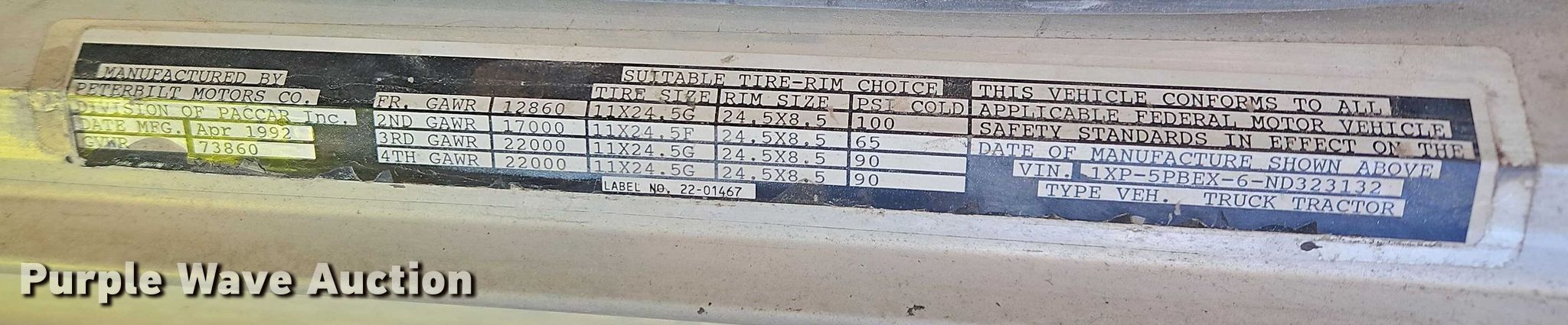 1992 Peterbilt 379 semi truck. Miles: 1,120,102 on odometer, Hours: 7,493 on meter, VIN: 1XP5PBEX6ND323132. Engine Caterpillar, Displacement: 14.6L, Cylinders: 6, Fuel type: Diesel, Engine brake. Transmission Eaton Fuller, Manual, Speed: 15. Chassis Axles: Triple, Pusher axle, Differential lock: Inter-axle, Suspension: Air Dump valves, Brakes: Air, PTO, Wet kit, GVWR: 73,860 lbs FAWR: 12,860 lbs, IAWR: 22,000 lbs, RAWR: 22,000 lbs, Lift axle GAWR: 17,000 lbs. Interior AC, Heat, Air ride cab. Features Deck plate: Aluminum, Fifth wheel type: Air operated, Sliding, Fuel tank: Dual. Tires Size: 11R24.5, Lift axle: 295/75R22.5. Notes Non-operational engine , Non-operational unit, Unit must be towed or hauled. Missouri title. Title distribution may be delayed up to 14 days from verification of funds. KC Dumpster Company. Lee's Summit, MO 64082