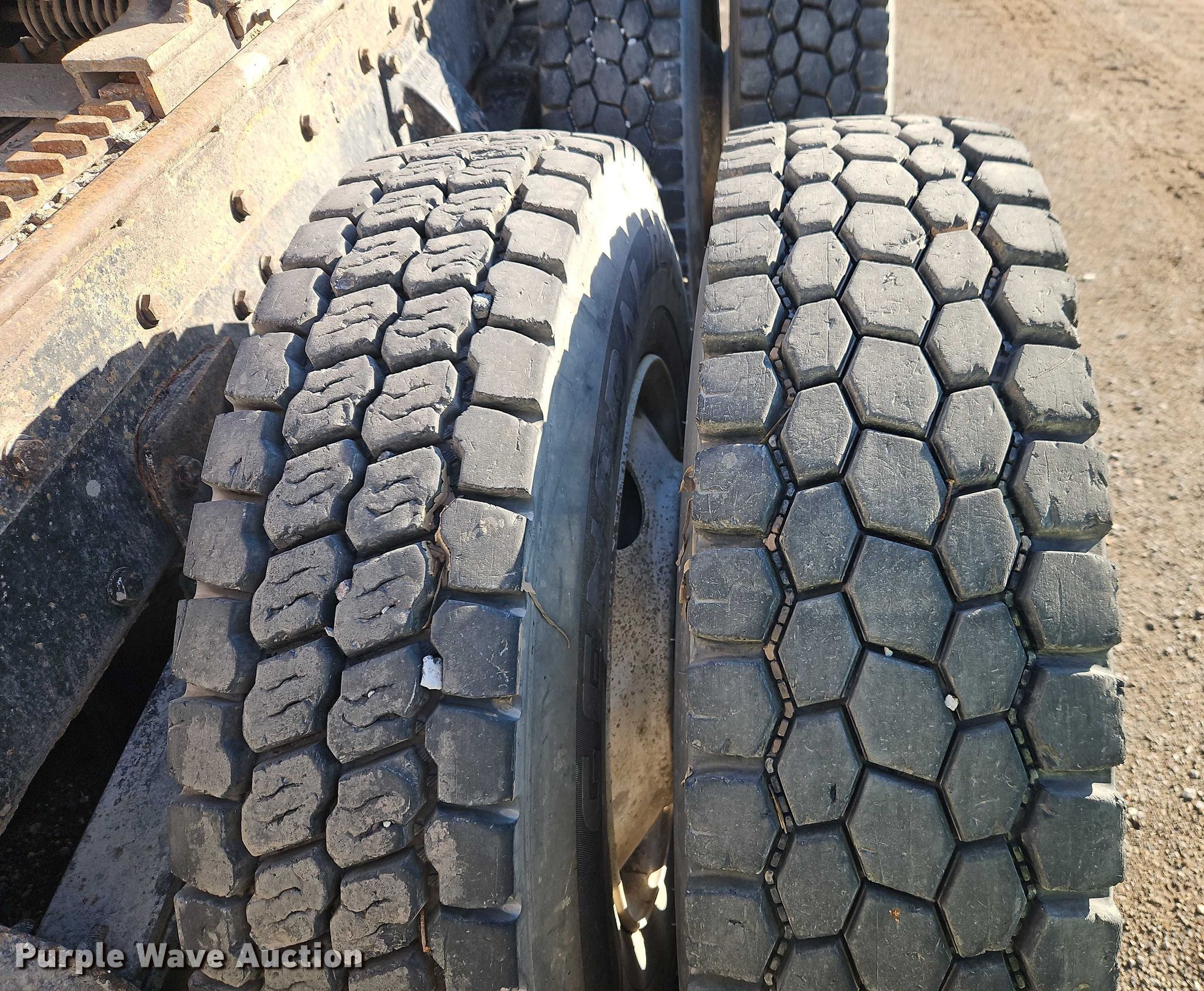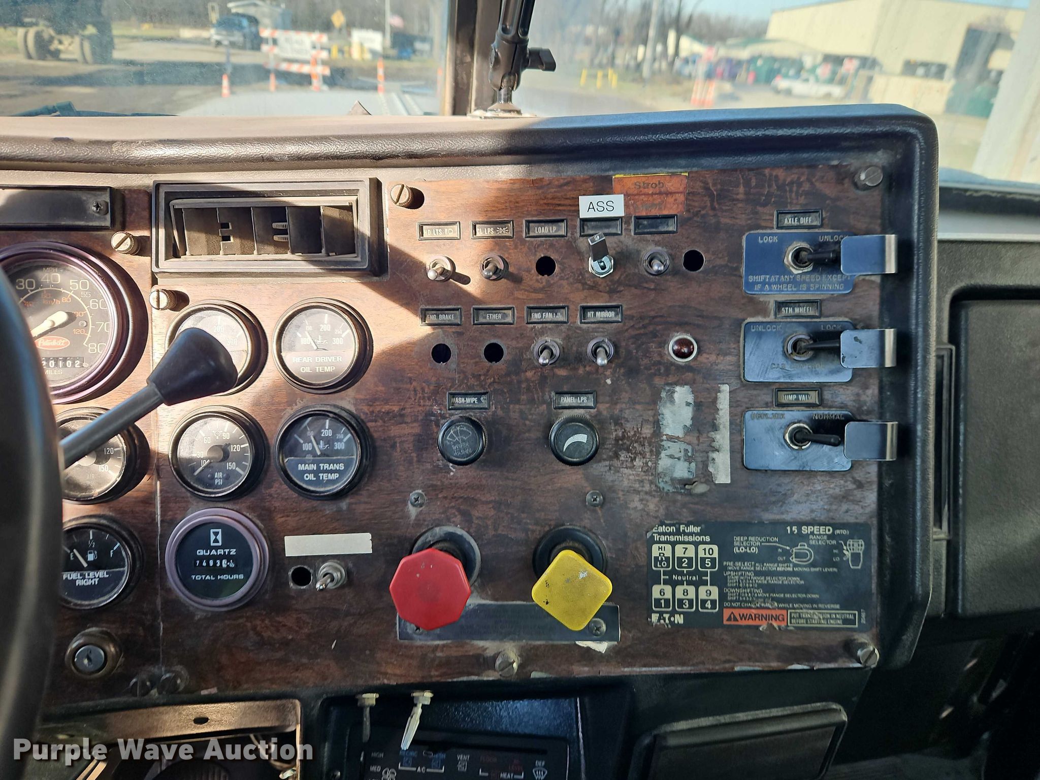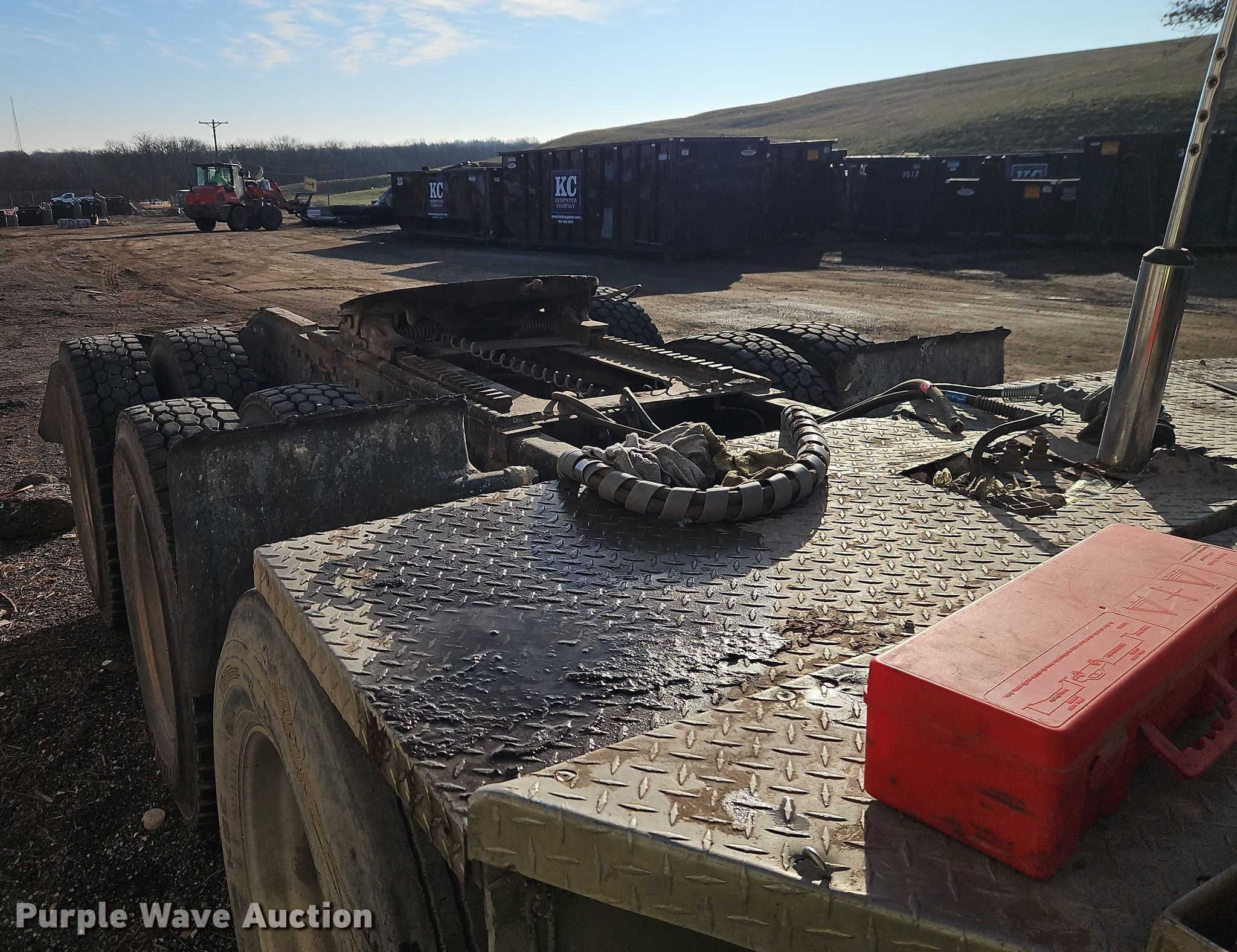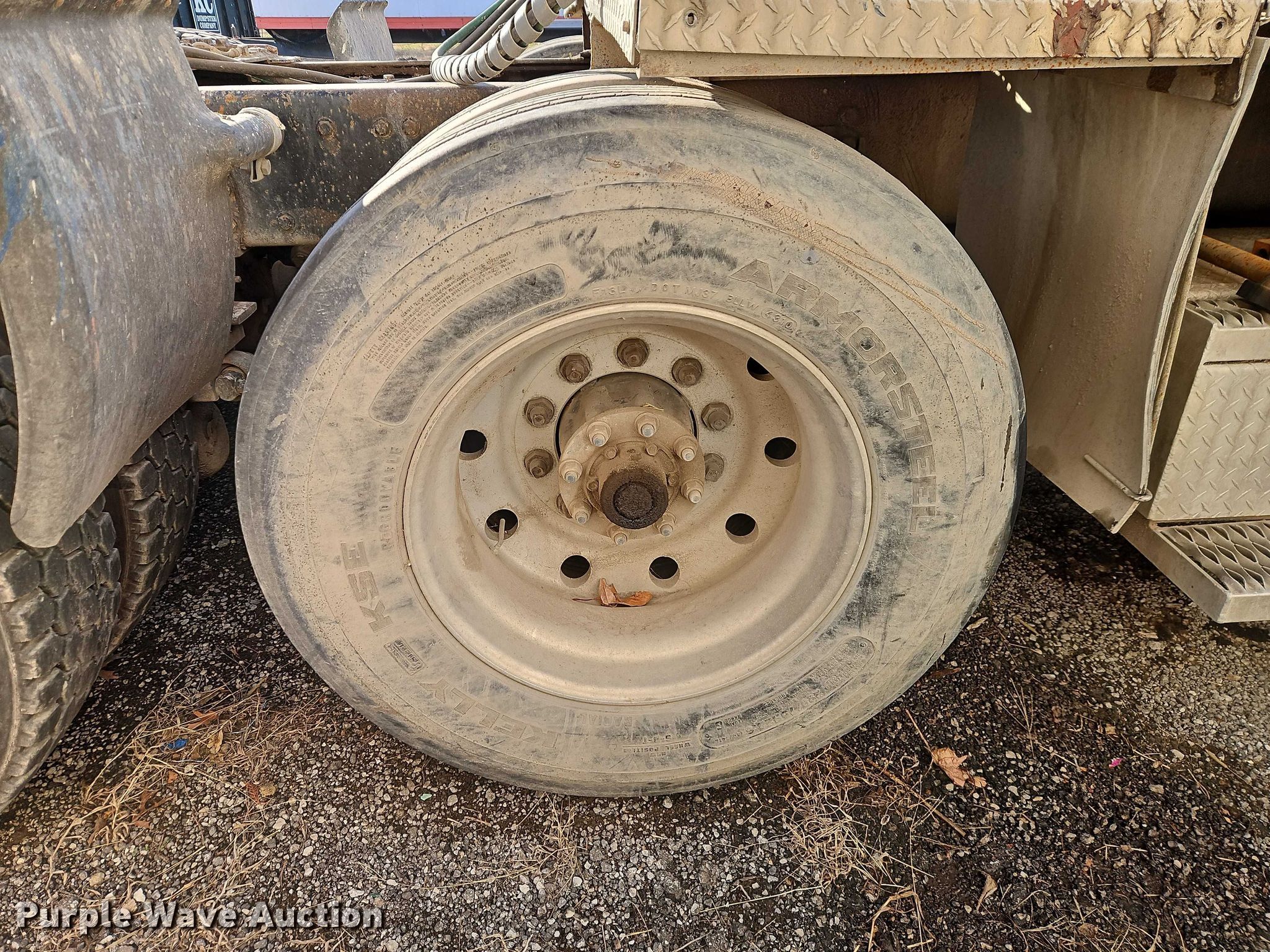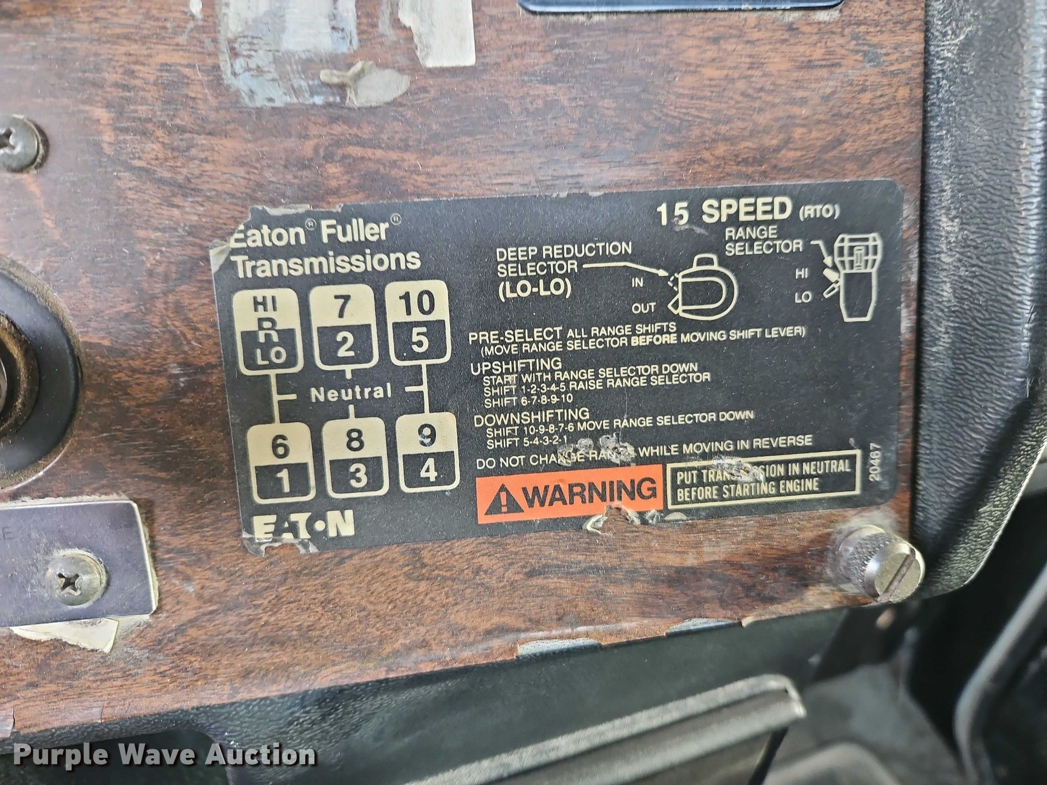 1992 Peterbilt 379 semi truck. Miles: 1,120,102 on odometer, Hours: 7,493 on meter, VIN: 1XP5PBEX6ND323132. Engine Caterpillar, Displacement: 14.6L, Cylinders: 6, Fuel type: Diesel, Engine brake. Transmission Eaton Fuller, Manual, Speed: 15. Chassis Axles: Triple, Pusher axle, Differential lock: Inter-axle, Suspension: Air Dump valves, Brakes: Air, PTO, Wet kit, GVWR: 73,860 lbs FAWR: 12,860 lbs, IAWR: 22,000 lbs, RAWR: 22,000 lbs, Lift axle GAWR: 17,000 lbs. Interior AC, Heat, Air ride cab. Features Deck plate: Aluminum, Fifth wheel type: Air operated, Sliding, Fuel tank: Dual. Tires Size: 11R24.5, Lift axle: 295/75R22.5. Notes Non-operational engine , Non-operational unit, Unit must be towed or hauled. Missouri title. Title distribution may be delayed up to 14 days from verification of funds. KC Dumpster Company. Lee's Summit, MO 64082