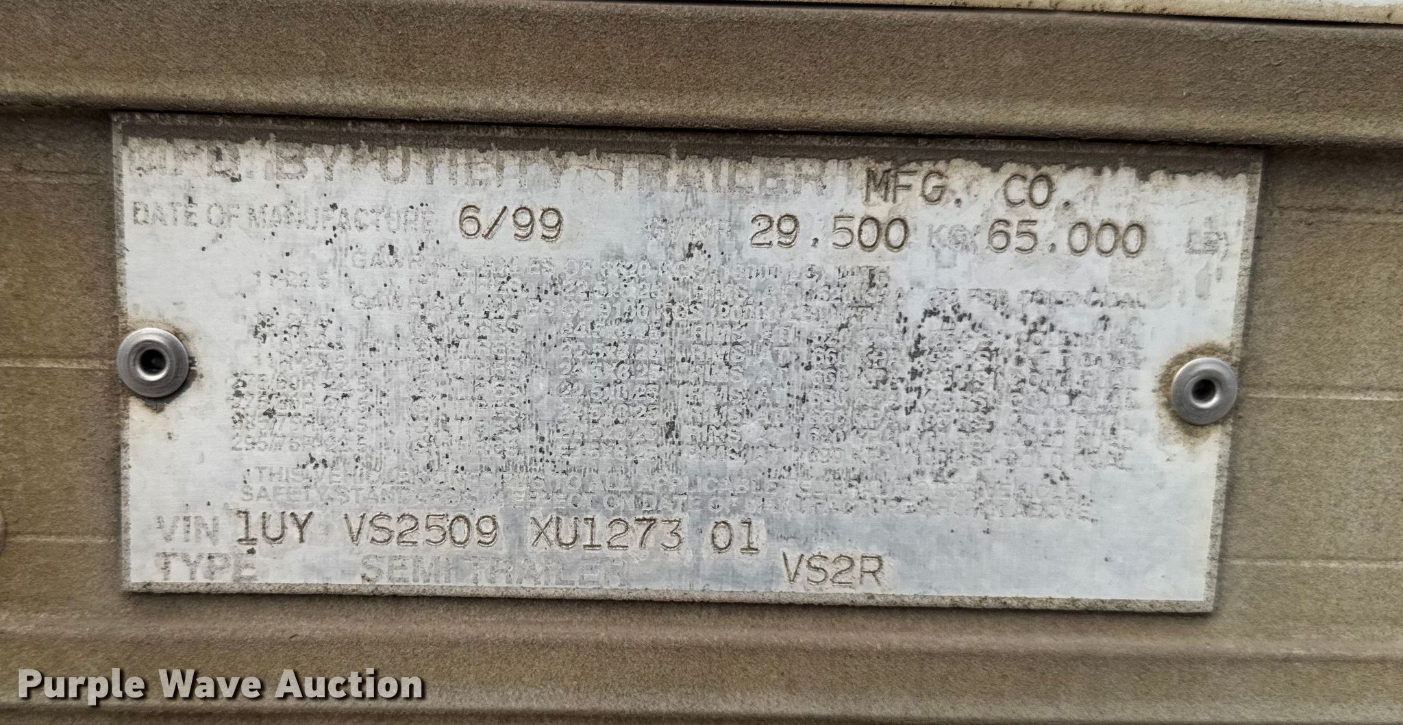 1999 Utility VS2R refrigerated van trailer. VIN: 1UYVS2519XU127301. Dimensions Overall Length: 53', Width: 102". Features Deck type: Aluminum, Refrigeration unit Advance Stealth NDL93PL0-AB-0, Hours: 37,498, Serial: JAR90717702, Engine Cylinders: 4, Fuel type: Diesel. Chassis Landing gear: Dual, Suspension: Air, Brakes: Air, Axles: Tandem, GVWR: 65,000 lbs, GAWR: 29,500 lbs. Tires Aluminum wheels, Size: 285/75R24.5. Lender owned. Item condition and history unknown. Iowa title. Title distribution may be delayed up to 30 days from verification of funds. AccuJet Liquidation - Open Inspection November 12th 2025. Perry, IA 50220