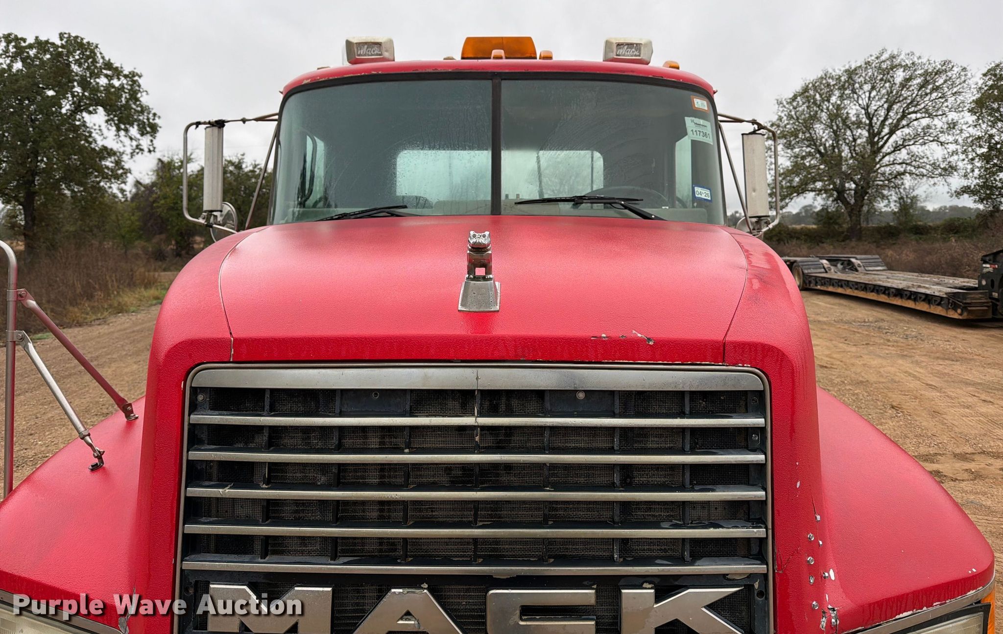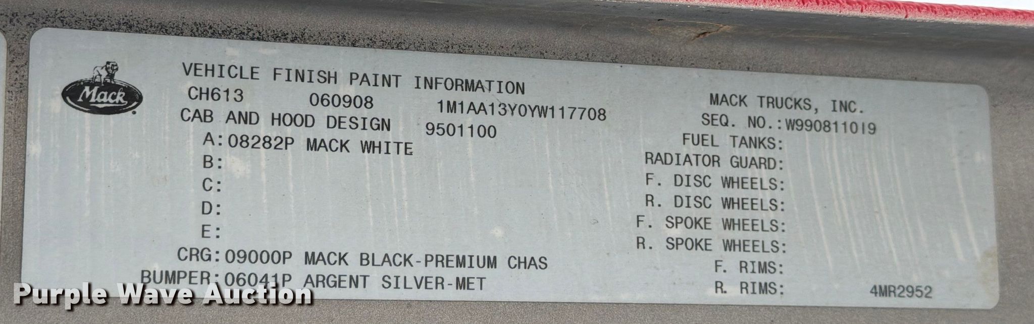 2000 Mack CH613 semi truck. Miles: 756,401 on odometer, Hours: 26,341 on meter, Miles or hours may vary, unit still in use, VIN: 1M1AA13Y0YW117708. Engine Mack E7 350, Serial: 9N2306, Displacement: 12.0L, Cylinders: 6, Fuel type: Diesel, HP: 350. Transmission Eaton Fuller, Manual, Speed: 10. Chassis Axles: Tandem, Differential lock: Inter-axle, Suspension: Air, Brakes: Air, GVWR: 48,000 lbs FAWR: 12,000 lbs, IAWR: 18,000 lbs, RAWR: 18,000 lbs. Interior AC, Heat, Heated mirrors, Power locks, Cruise control, Air ride cab. Features Fifth wheel type: Fixed, Fuel tank: Dual. Tires Front: 315/80R22.5, Rear: 11R22.5. Notes PTO missing, PTO air lines not secured, Windshield chipped or cracked. Texas title. Title distribution may be delayed up to 14 days from verification of funds. Holy Contractors LLC - Open inspection December 11, 2025. Aquilla, TX 76622