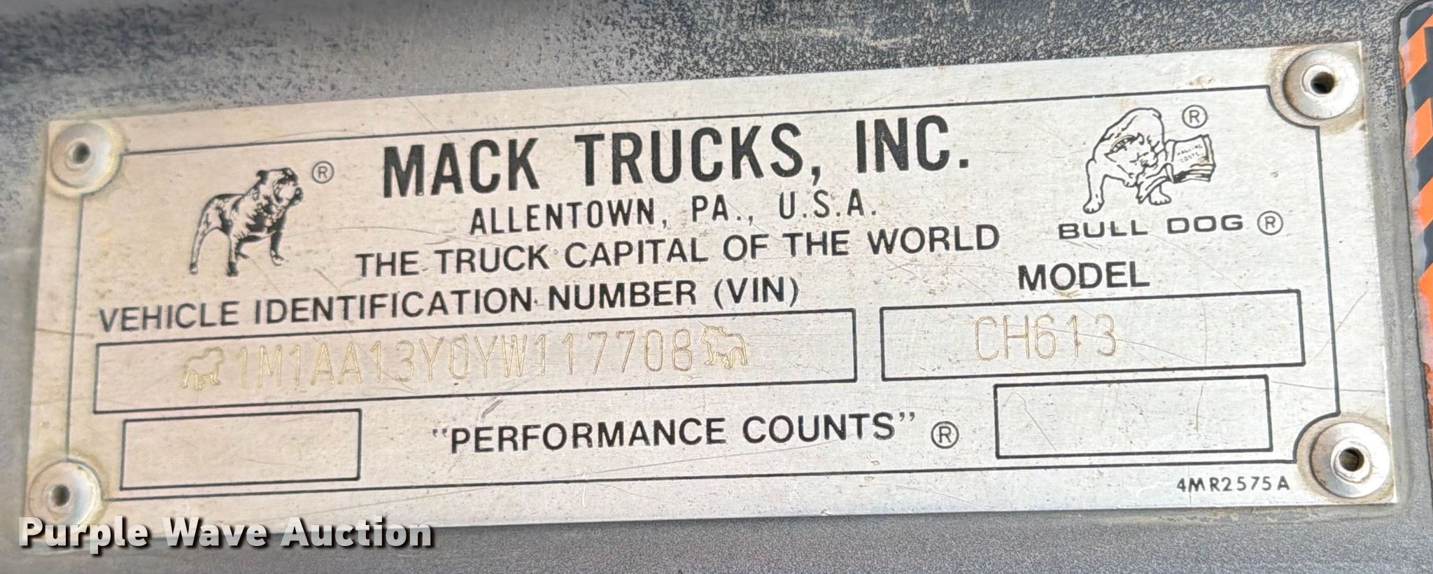 Purple Wave is selling a used Truck Tractor in Texas. This item is a 2000 Mack CH613 semi truck with the following: Miles: 756,401 on odometer, Hours: 26,341 on meter, Miles or hours may vary, unit still in use, VIN: 1M1AA13Y0YW117708