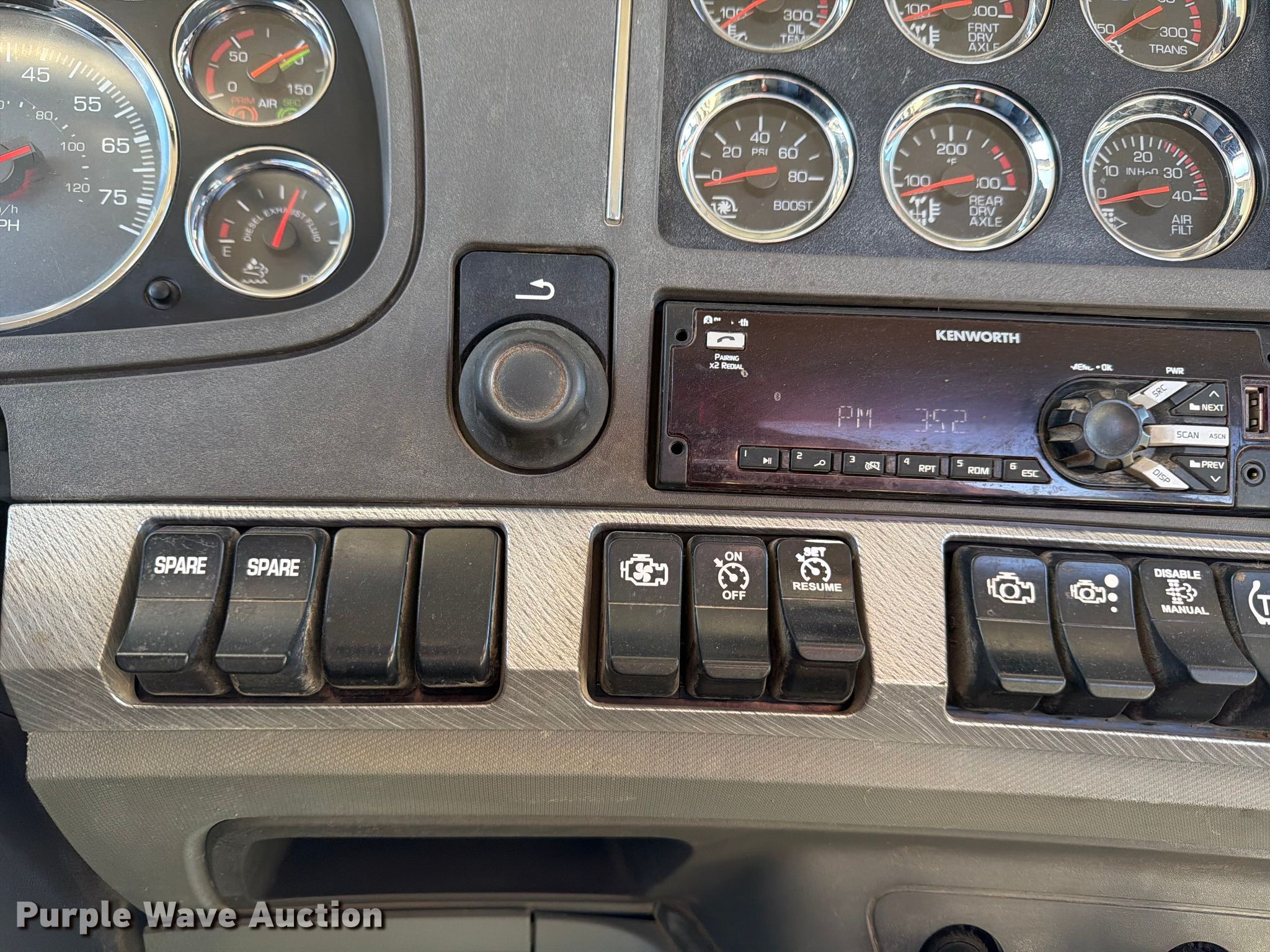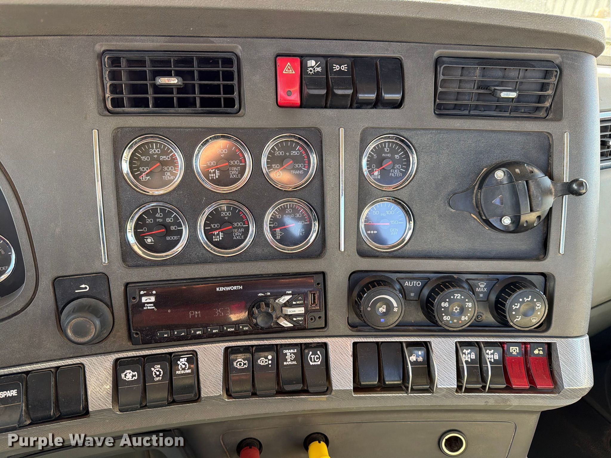2018 Kenworth T880 semi truck. Miles: 546,169 on odometer, Hours: 19,575 on meter, VIN: 1XKZD49X8JJ222353. Engine Cummins X15 450, Serial: 80026692, Displacement: 15.0L, Cylinders: 6, Fuel type: Diesel, HP: 450, Engine brake. Transmission Eaton Fuller, Manual, Speed: 10. Chassis Axles: Tandem, Gear ratio: 3.70, Differential lock: Full, Suspension: Air Dump valves, Brakes: Air, PTO, Wet kit, GVWR: 53,200 lbs FAWR: 13,200 lbs, IAWR: 20,000 lbs, RAWR: 20,000 lbs. Interior AC, Heat, Heated mirrors, Power windows, Power locks, Cruise control, Air ride cab, Auxiliary controls. Features Deck plate: Aluminum, Fifth wheel type: Air operated, Sliding, Fuel tank: Dual. Tires Size: 11R22.5. Notes Windshield chipped or cracked, Engine issues, loses coolant once pressure is built at highway speeds. Texas title. Title distribution may be delayed up to 14 days from verification of funds. Brannon Industrial Group. College Station, TX 77845