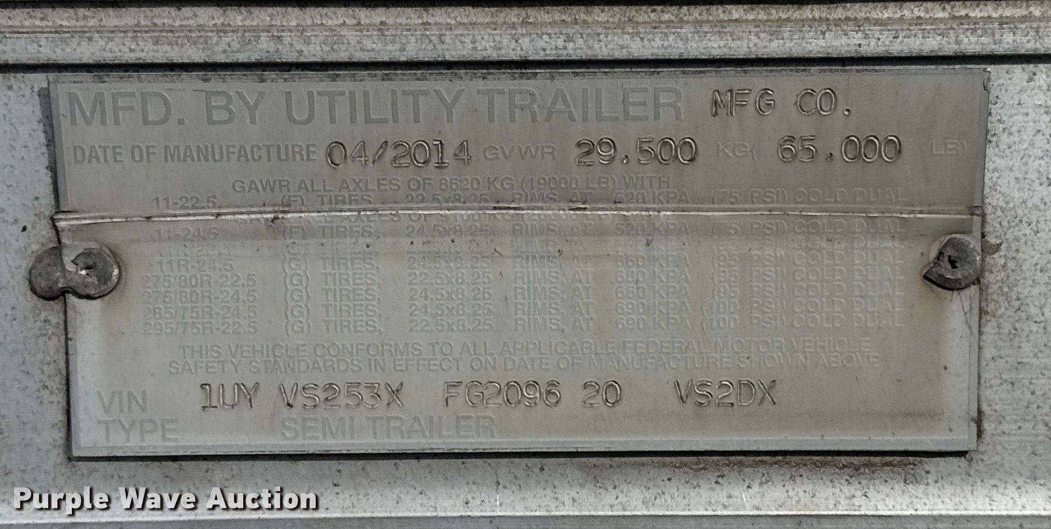 2015 Utility Trailer VS2DX dry van trailer. VIN: 1UYVS253XFG209620. Dimensions Overall Length: 53', Width: 102". Features Deck type: Wood. Chassis Landing gear: Dual, Suspension: Air, Brakes: Air, Axles: Tandem, GVWR: 65,000 lbs. Tires Steel wheels, Size: 295/75R22.5. Oklahoma title. Seller is an Oklahoma licensed motor vehicle dealer. Buyers may be required to provide identification to the licensed dealer to comply with state laws. Title will be assigned and distributed by the dealer. Please contact the seller for distribution questions. Title distribution may be delayed up to 30 days from verification of funds. Collinsville, OK 74021