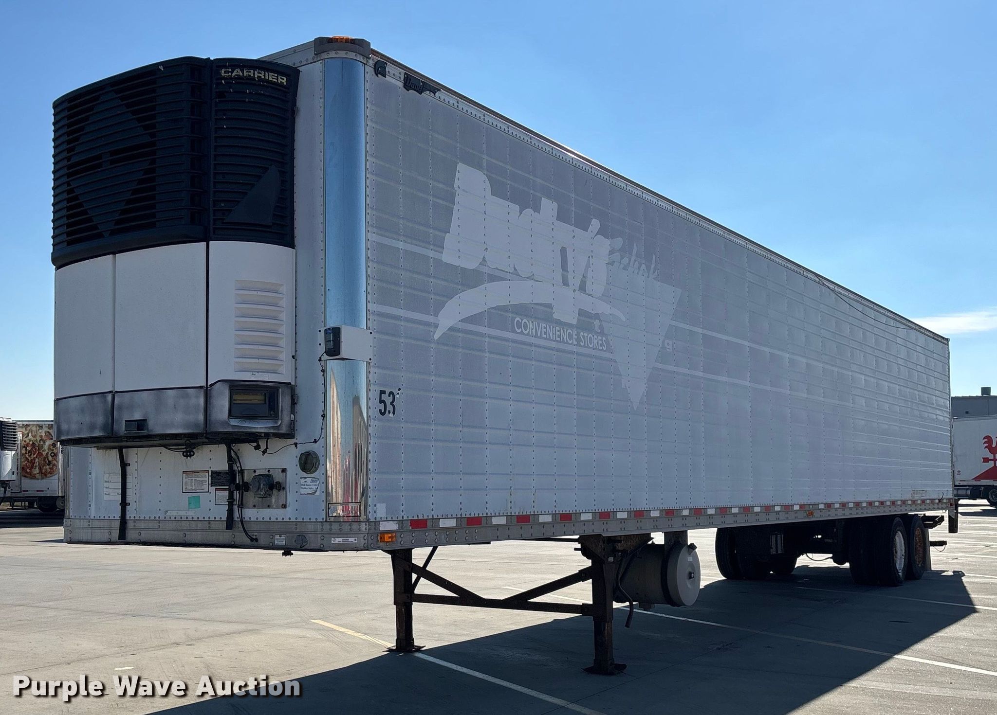 2003 Great Dane refrigerated van trailer. VIN: 1GRAA06213W024504. Dimensions Overall Length: 55' 6", Width: 102", Body Length: 52' 11". Features Deck type: Aluminum, Refrigeration unit Carrier, Hours: 24,574, End gate lift MBB Palfinger Interlift. Chassis Landing gear: Dual, Suspension: Air, Brakes: Air, Axles: Tandem, GVWR: 68,000 lbs, GAWR: 20,000 lbs. Tires Steel wheels, Size: 295/75R22.5. Notes Unknown operating condition of end gate lift, Unknown operating condition of refrigeration unit, Frame rust damage , Dead battery, Flat tire. Iowa title. Title distribution may be delayed up to 14 days from verification of funds. Casey's General Stores. Joplin, MO 64804