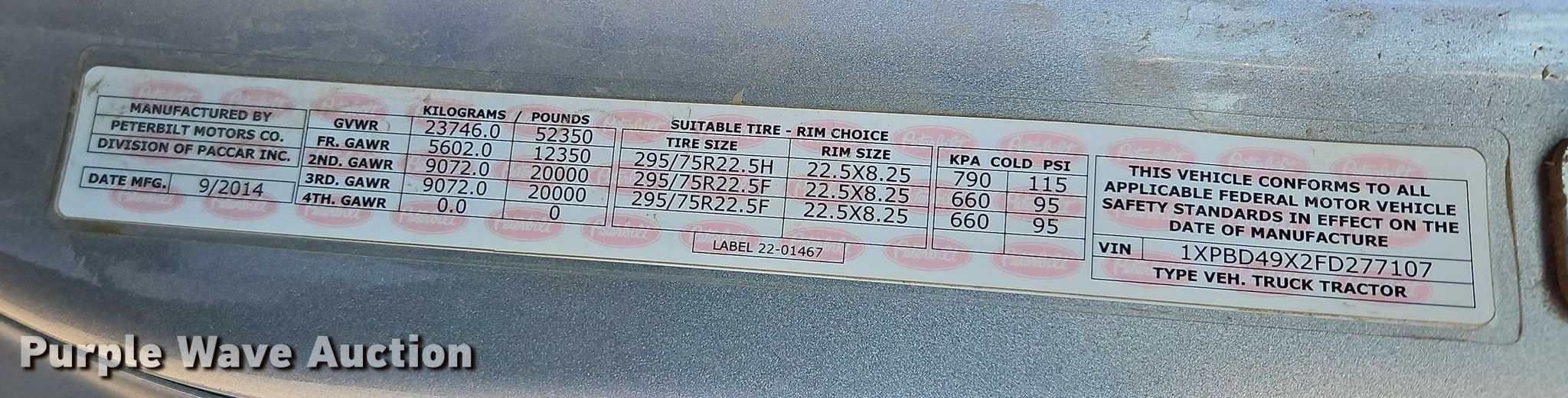 Purple Wave is selling a used Truck Tractor in Missouri. This item is a 2015 Peterbilt 579 semi truck with the following: Miles: 318,974 on odometer, Hours: 12,229 on meter, VIN: 1XPBD49X2FD277107, Unit #: 60