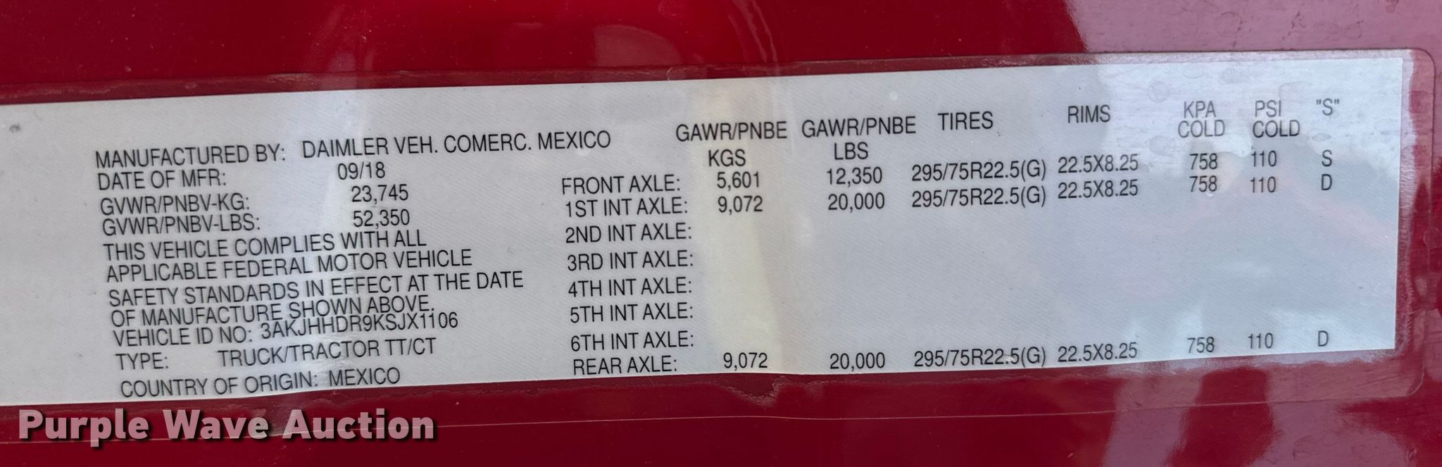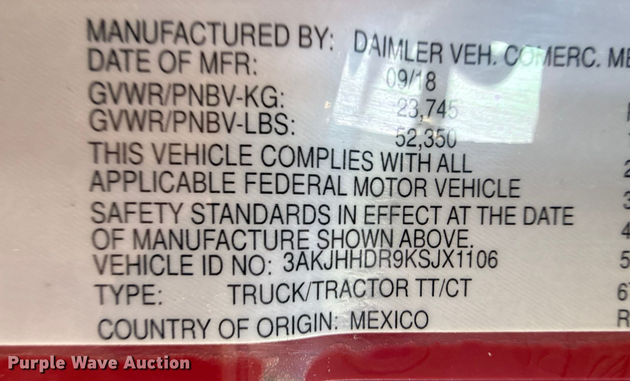 - VIN: 3AKJHHDR9KSJX1106