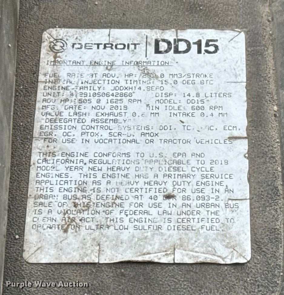 2019 Freightliner Cascadia 126 semi truck. Miles: 801,000 on odometer, VIN: 1FUJHHDR1KLKN7652. Engine Detroit Diesel DD15, Displacement: 14.8L, Cylinders: 6, Fuel type: Diesel, Engine brake. Transmission Automated manual. Chassis Axles: Tandem, Differential lock: Inter-axle, Suspension: Air Dump valves, Brakes: Air, GVWR: 52,000 lbs FAWR: 12,000 lbs, IAWR: 20,000 lbs, RAWR: 20,000 lbs. Interior AC, Heat, Heated mirrors, Power windows, Power locks, Cruise control, Air ride cab, Brake controller, Sleeper Sleeper length: 70", Beds: Double bunk, Rear climate control, Auxiliary power unit Carrier DCP3, Engine Kubota Z482-D2-EF08.. Features Deck plate: Aluminum, Fifth wheel type: Air operated, Sliding, Fuel tank: Dual. Tires Front: 275/80R22.5, Rear: 295/75R22.5. Notes Maintenance records available upon request to [email protected]. Kansas title. Title distribution may be delayed up to 14 days from verification of funds. Valley Center, KS 67147