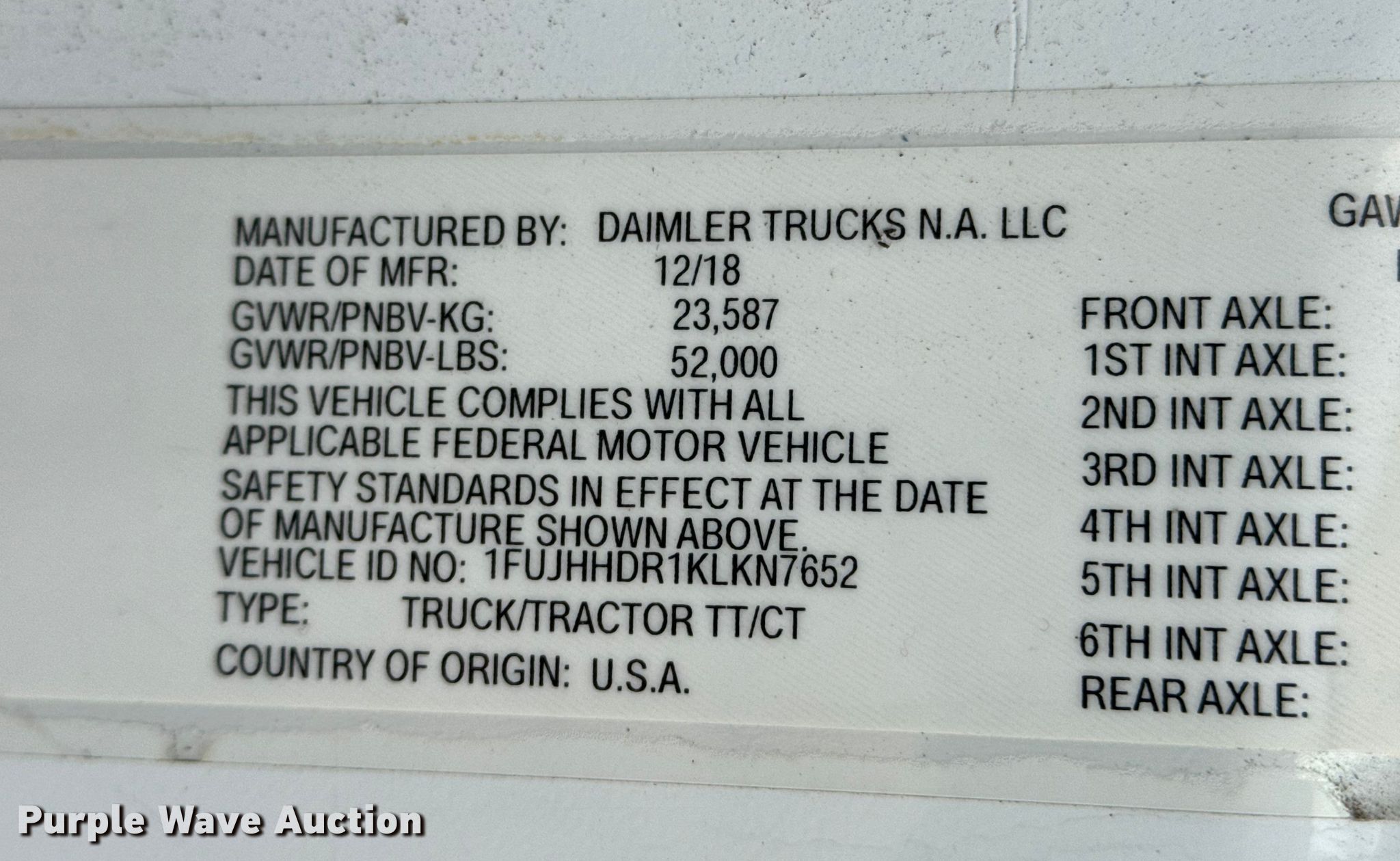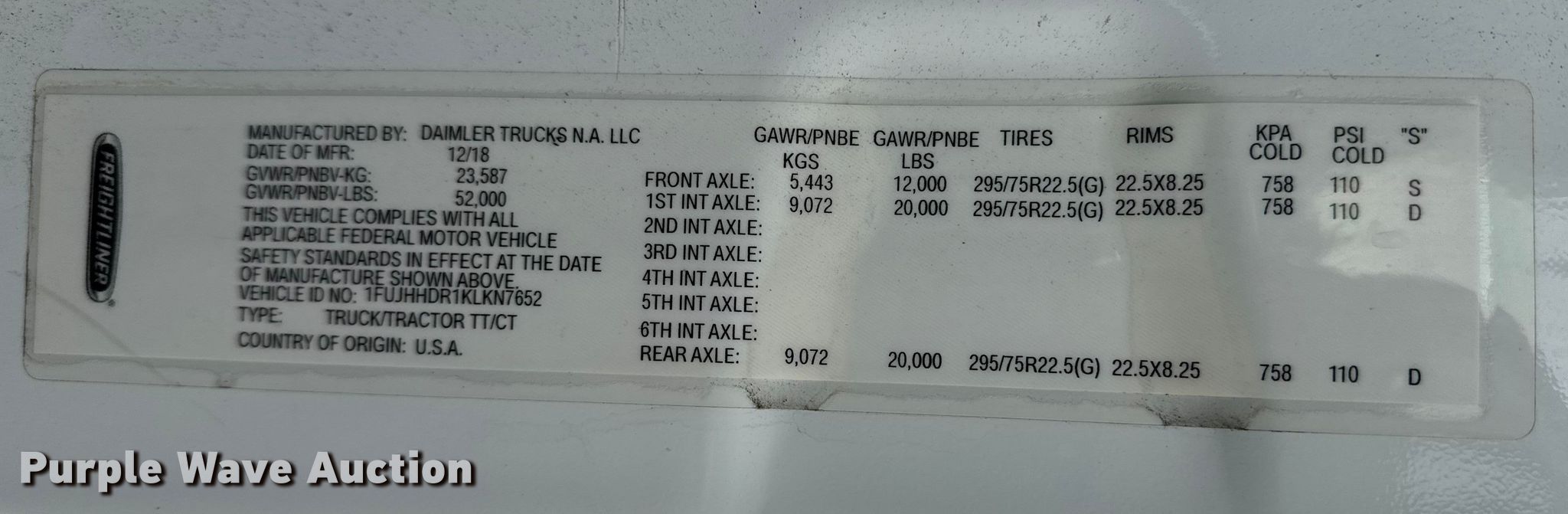 - VIN: 1FUJHHDR1KLKN7652