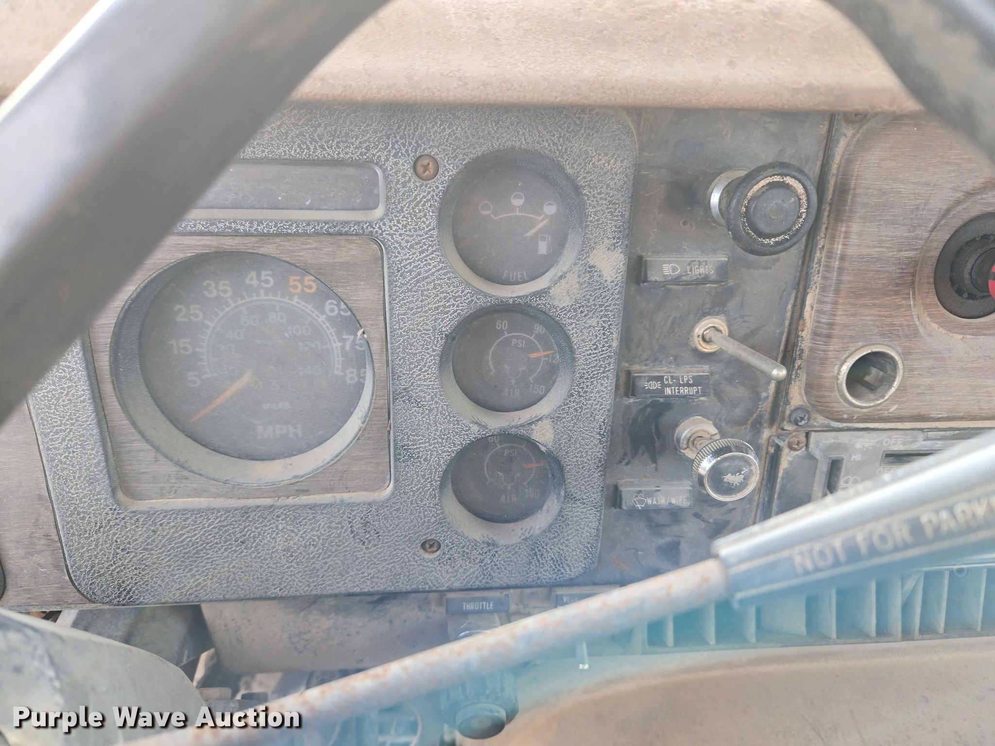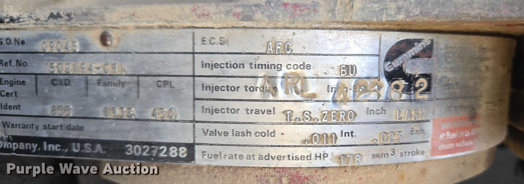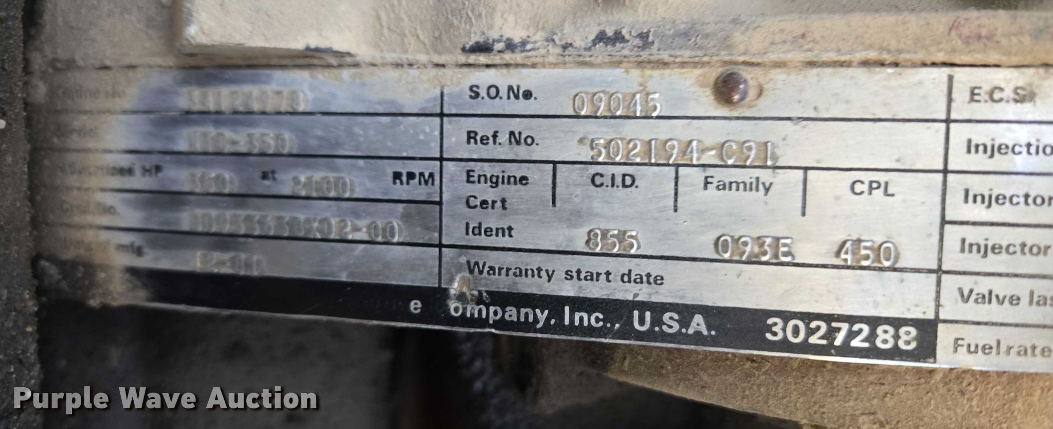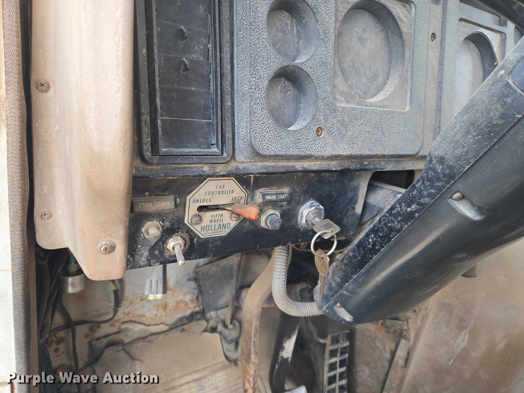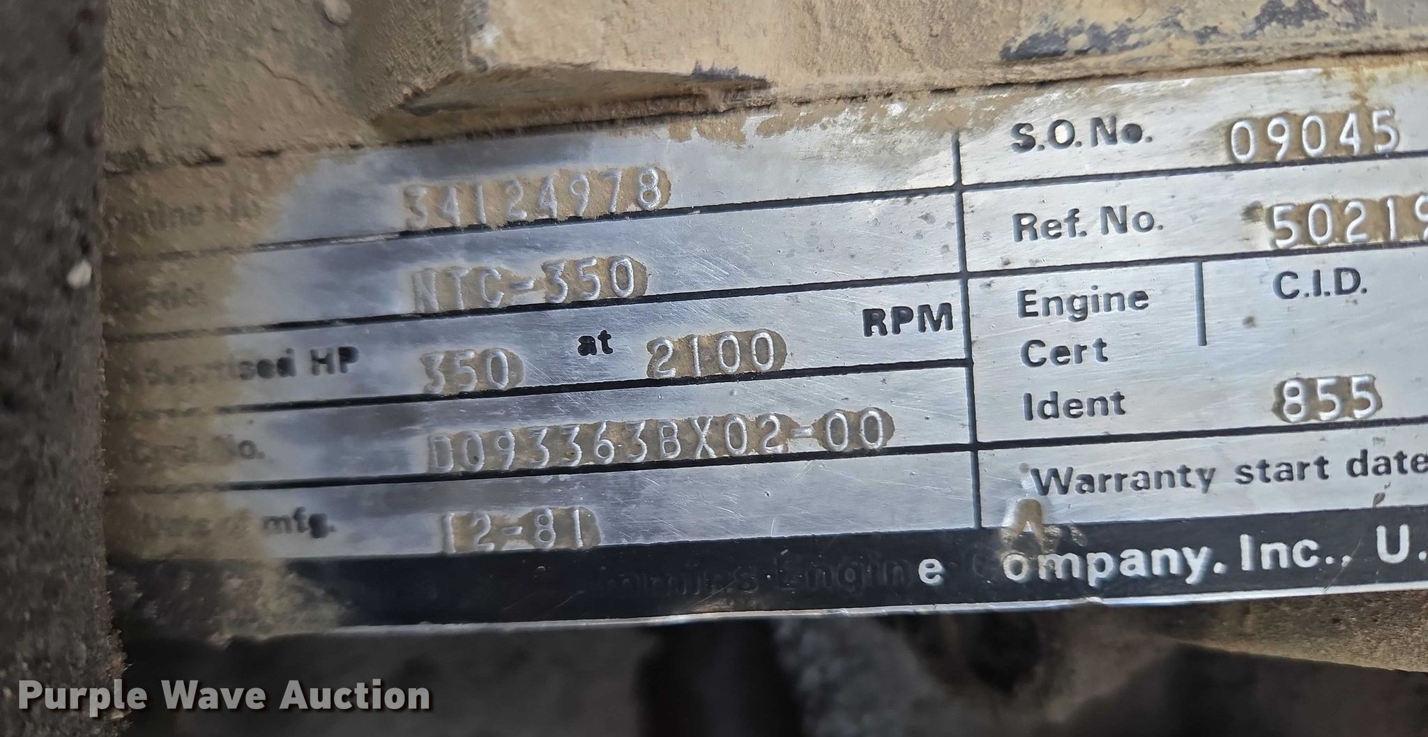 1982 International 2575 winch truck. Miles: 494,312 on odometer, VIN: 1HTDF2574CHA18661. Engine Cummins NTC-350, Serial: 34124978, Cylinders: 6, Fuel type: Diesel. Transmission Eaton Fuller, Manual, Speed: 8. Chassis Axles: Tandem, Differential lock: Inter-axle, Suspension: Spring over walking beam, Brakes: Air, PTO. Interior AC, Heat. Features Deck plate: Steel, Winch, Fifth wheel type: Air operated, Rolling tailboard, Fuel tank: Dual. Tires Size: 11R24.5. Notes Parts missing, AC issues, needs recharged. Oklahoma title. Title distribution may be delayed up to 30 days from verification of funds. Garvin County District 3. Stratford, OK 74872