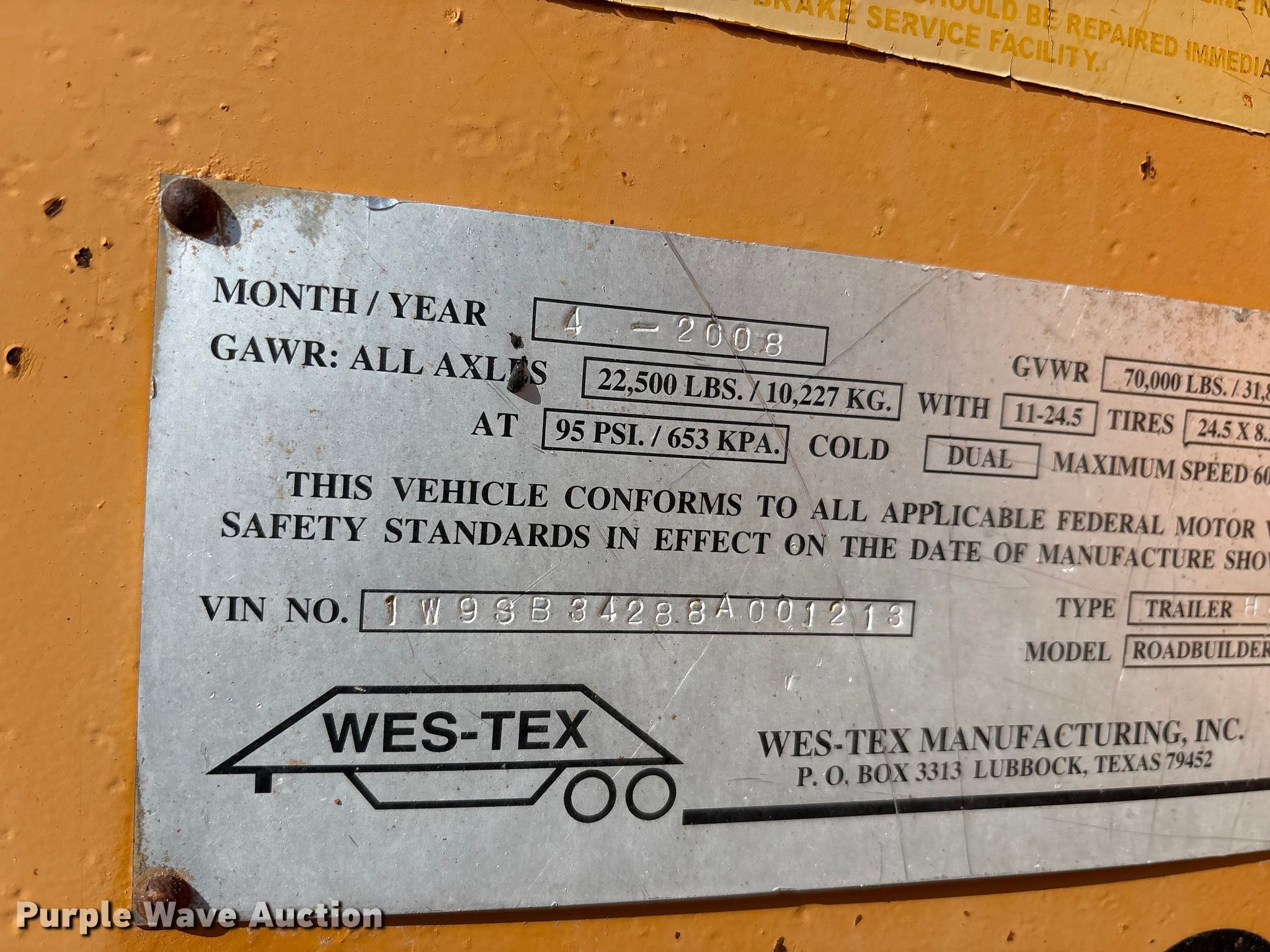 2008 Wes Tex Road builder end dump trailer. VIN: 1W9SB34288A001213. Dimensions Overall Length: 34' 4", Width: 8', Body Length: 32' 5", Width: 8', Side height: 44". Features Body type: Steel, Ram: Single, End gate: Air operated, Trailer controls, Roll tarp. Chassis Landing gear: Dual, Suspension: Spring, Brakes: Air, Axles: Tandem, GVWR: 70,000 lbs, GAWR: 22,500 lbs. Tires Aluminum wheels, Size: 11R24.5. Oklahoma title. Title distribution may be delayed up to 14 days from verification of funds. Overland Corporation. 534 U.S. 77. Ardmore, OK 73401