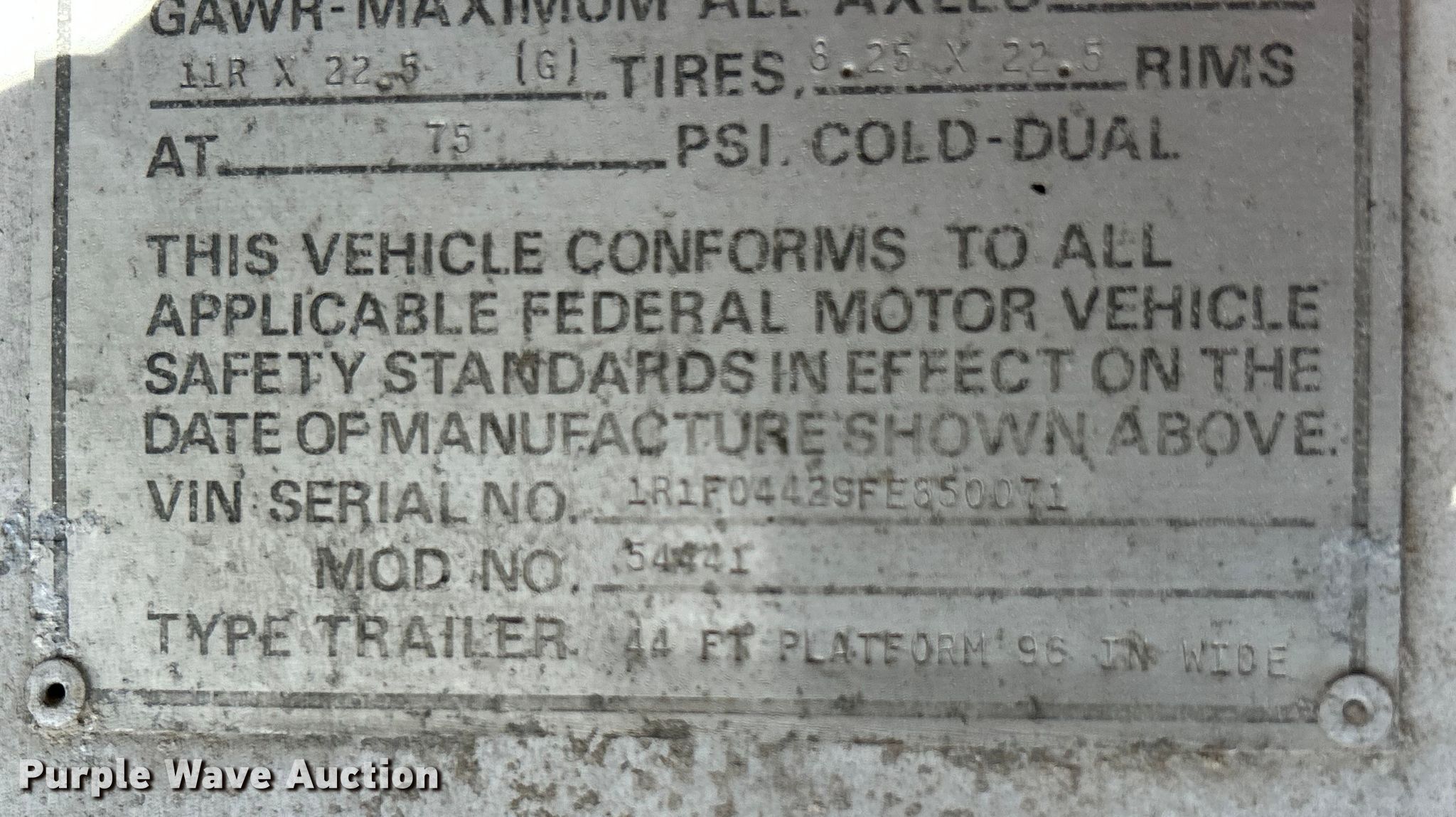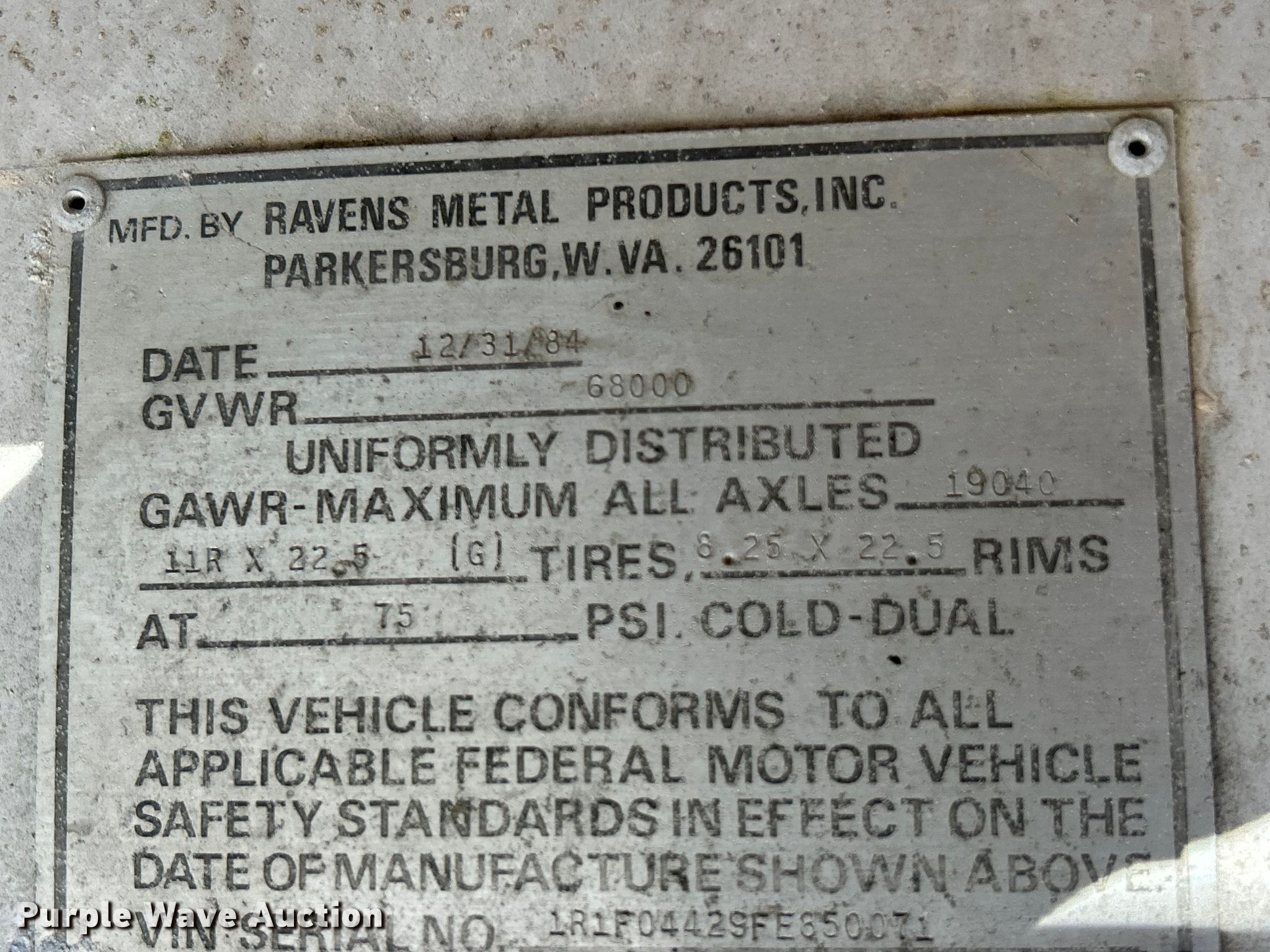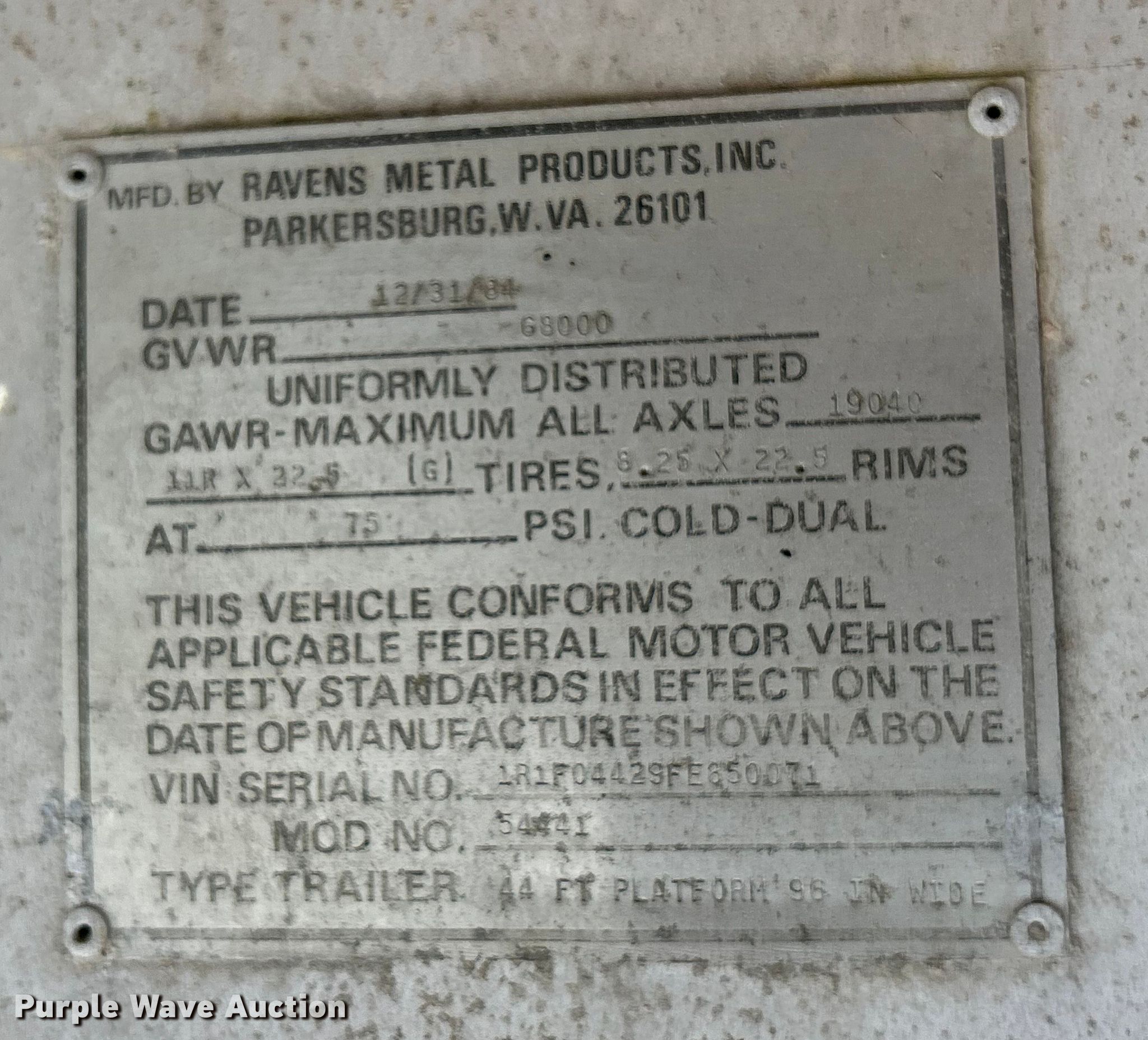 1985 Ravens 54441 flatbed trailer. VIN: 1R1F04429FE850071. Dimensions Overall Length: 44', Width: 96", Deck Length: 44', Width: 91". Features Deck type: Aluminum. Chassis Landing gear: Dual, Suspension: Air, Brakes: Air, Axles: Tandem, GVWR: 68,000 lbs, GAWR: 19,040 lbs. Tires Steel wheels, Size: 295/75R22.5. Missouri title. Title distribution may be delayed up to 14 days from verification of funds. Parisi Contracting. Foristell, MO 63348