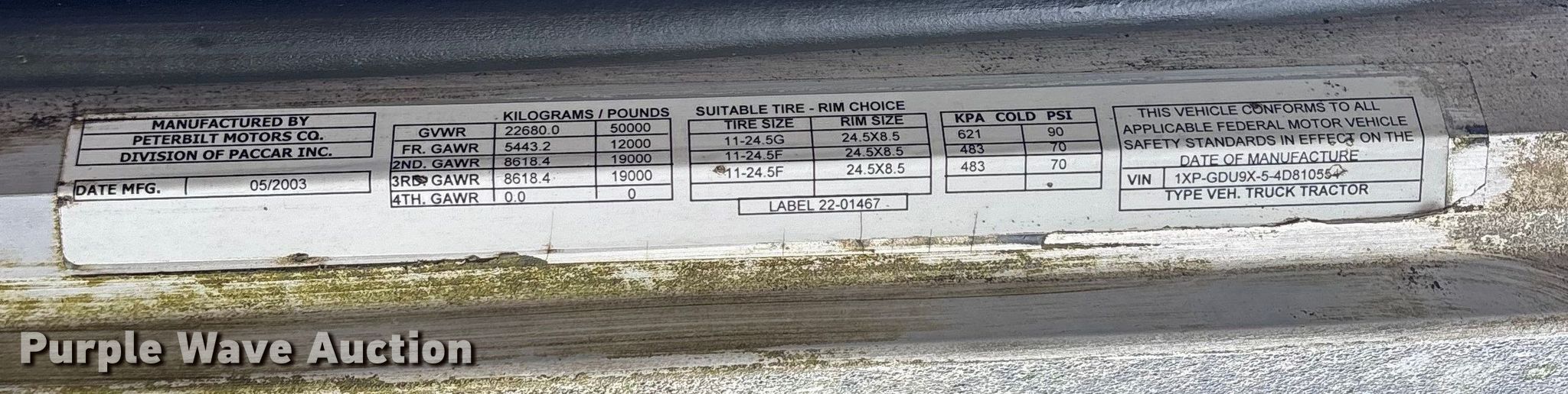 Purple Wave is selling a used Truck Chassis in Arkansas. This item is a 2004 Peterbilt 385 truck cab and chassis with the following: Miles: Unknown, VIN: 1XPGDU9X54D810554, Unit #: 05