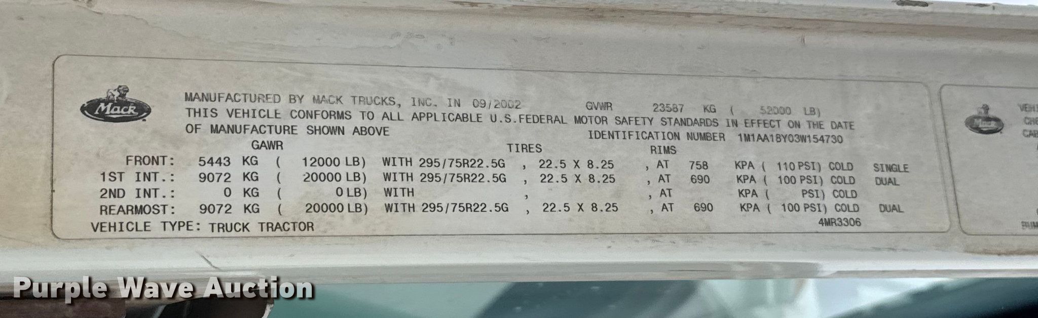 2003 Mack CH600 semi truck. Miles: 429,790 on odometer, Hours: 17,002 on meter, VIN: 1M1AA18Y03W154730. Engine Mack, Displacement: 12.0L, Cylinders: 6, Fuel type: Diesel, Engine brake. Transmission Eaton Fuller, Manual, Speed: 10. Chassis Axles: Tandem, Differential lock: Inter-axle, Suspension: Air Dump valves, Brakes: Air, GVWR: 52,000 lbs FAWR: 12,000 lbs, IAWR: 20,000 lbs, RAWR: 20,000 lbs. Interior AC, Heat, Heated mirrors, Power windows, Power locks, Cruise control, Air ride cab, Auxiliary controls. Features Deck plate: Aluminum, Fifth wheel type: Sliding, Fuel tank: Dual. Tires Size: 11R24.5. Notes Dash warning indicator: ABS, Electrical fault, Windshield chipped or cracked. Oklahoma title. Title distribution may be delayed up to 14 days from verification of funds. Lincoln County District 3. Meeker, OK 74855