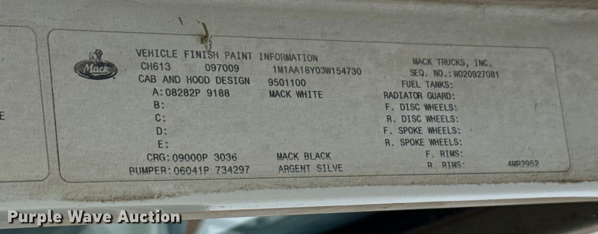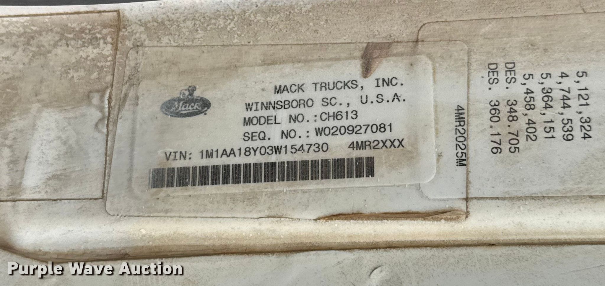 Take a look at this used 2003 Mack CH600 semi truck being sold on December 31st, 2025 in the Wednesday December 31 Truck and Trailer Auction made by Mack. Take a look at all of the item information below or take a look at similar auctions for Trucks.
