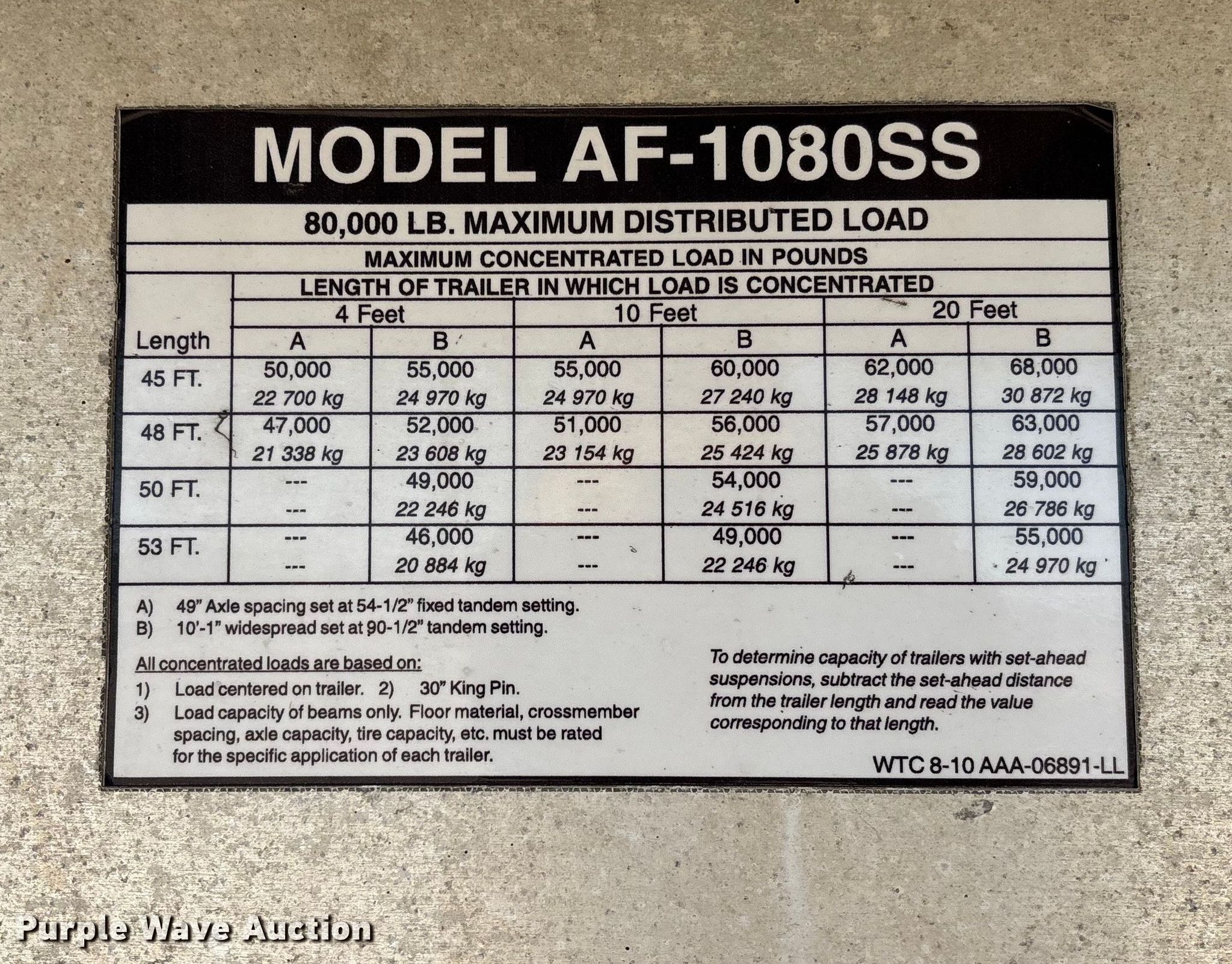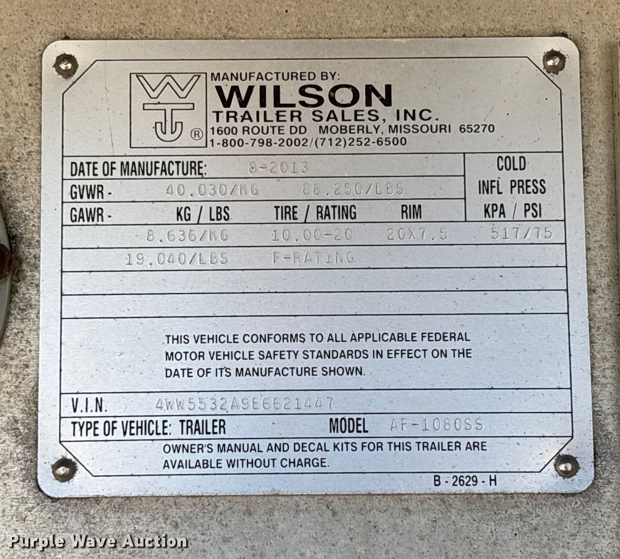 2014 Wilson AF-1080SS flatbed trailer. VIN: 4WW5532A9E6621447. Dimensions Overall Length: 53', Width: 102", Deck Length: 53', Width: 97". Features Deck type: Aluminum, Wood. Chassis Landing gear: Dual, Suspension: Air, Brakes: Air, Axles: Tandem, Spread, GVWR: 88,250 lbs, GAWR: 19,040 lbs. Tires Size: 295/75R22.5. Missouri title. Title distribution may be delayed up to 14 days from verification of funds. Lake Land & Cattle LLC. Neosho, MO 64850
