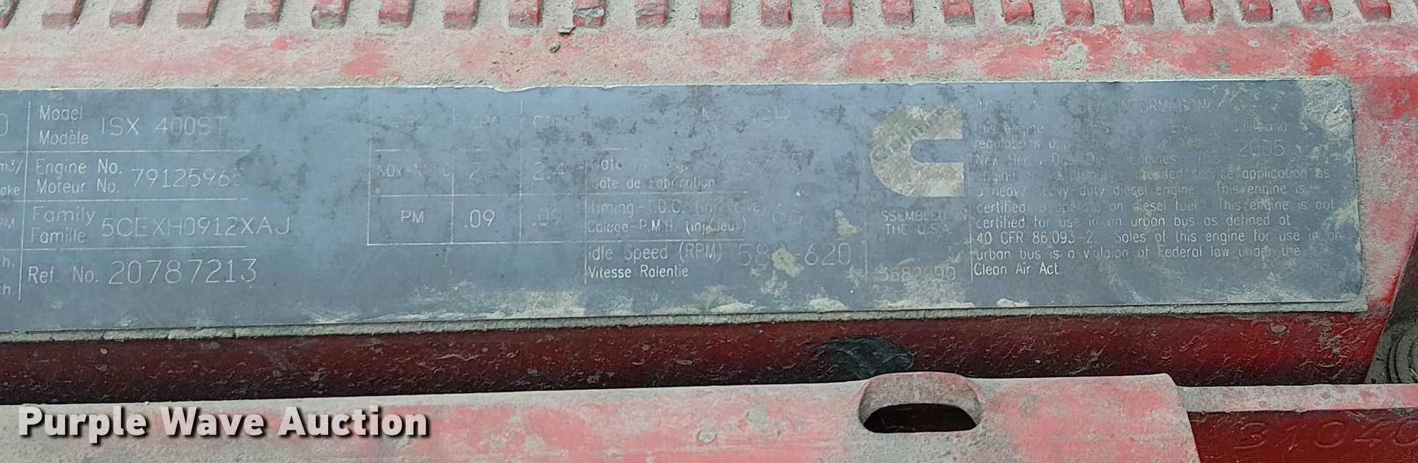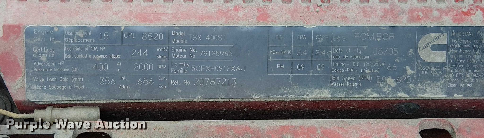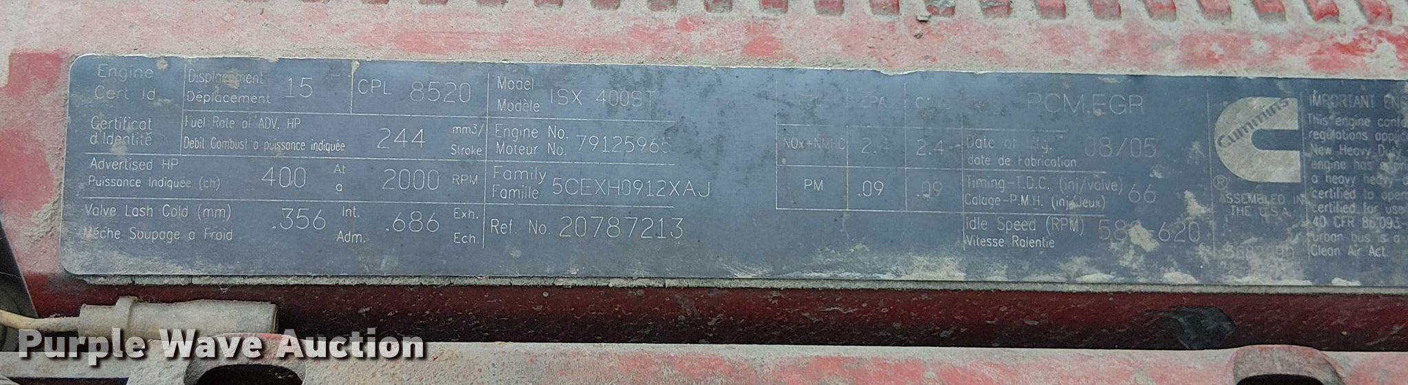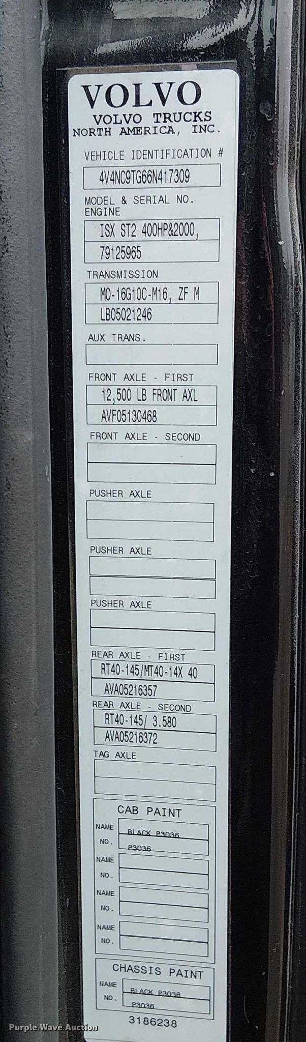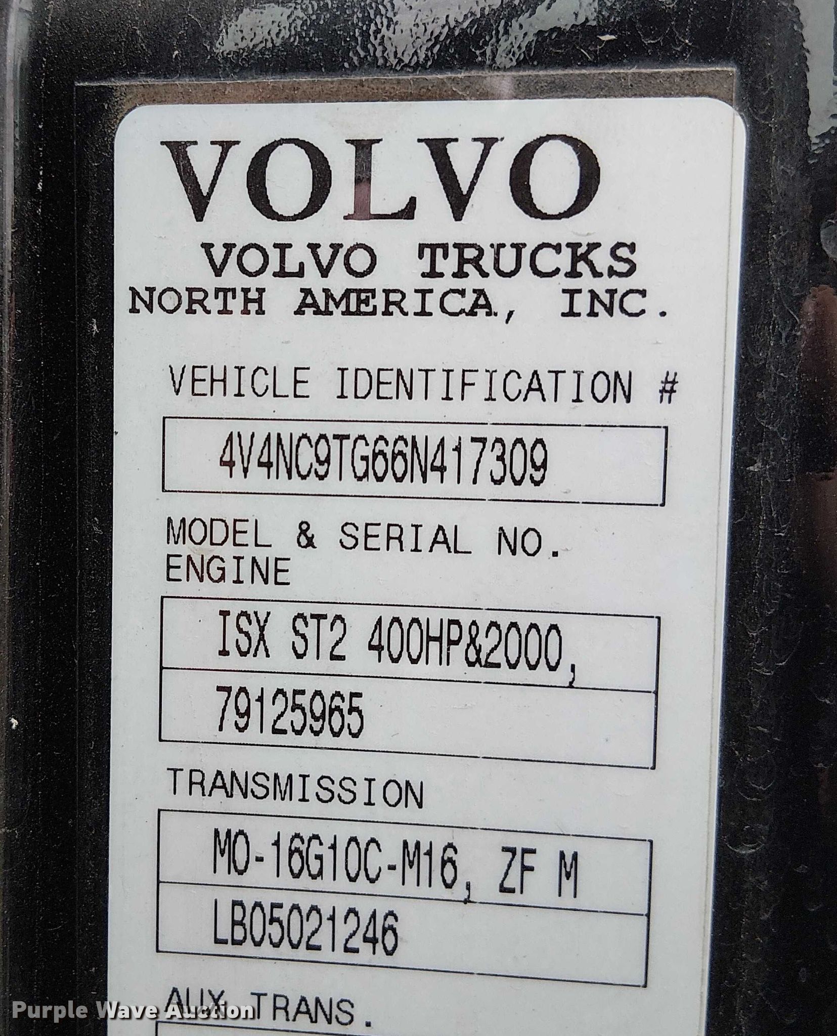 2006 Volvo VN semi truck. Miles: 1,623,626 on odometer, VIN: 4V4NC9TG66N417309. Engine Cummins ISX 400ST, Serial: 79125965, Displacement: 15.0L, Cylinders: 6, Fuel type: Diesel, Engine brake. Transmission Eaton Fuller, Manual. Chassis Axles: Tandem, Differential lock: Full, Suspension: Air Dump valves, Brakes: Air, Truck chassis: 147", GVWR: 50,350 lbs FAWR: 12,350 lbs, IAWR: 19,000 lbs, RAWR: 19,000 lbs. Interior AC, Heat, Heated mirrors, Cruise control, Air ride cab, Sleeper Sleeper length: 60", Beds: Double bunk, Rear climate control. Features Deck plate: Aluminum, Fifth wheel type: Air operated, Sliding, Fuel tank: Dual. Tires Size: 275/80R22.5. Notes Remanufactured engine, Dash warning indicator: ABS, Windshield chipped or cracked, Jump start required during on-site data collection. Missouri title. Title distribution may be delayed up to 14 days from verification of funds. Kansas City, MO 64120