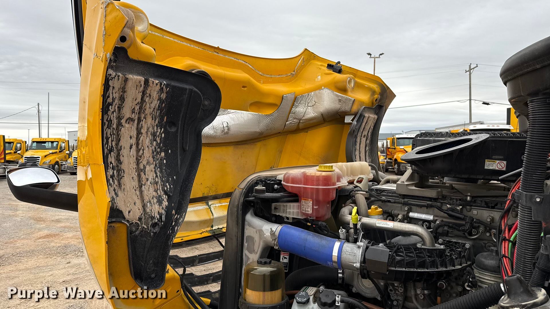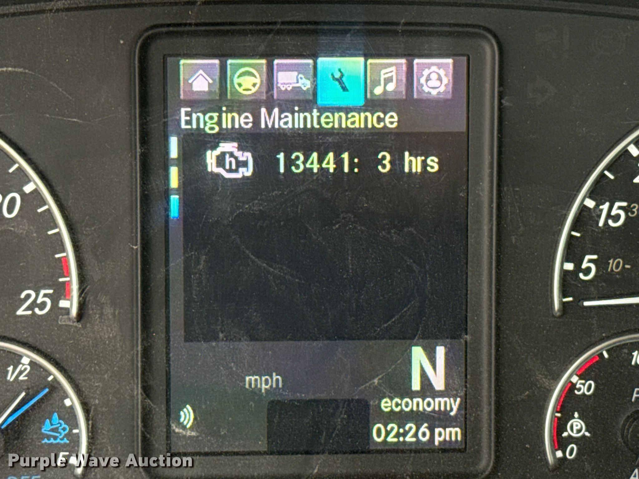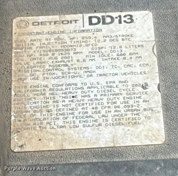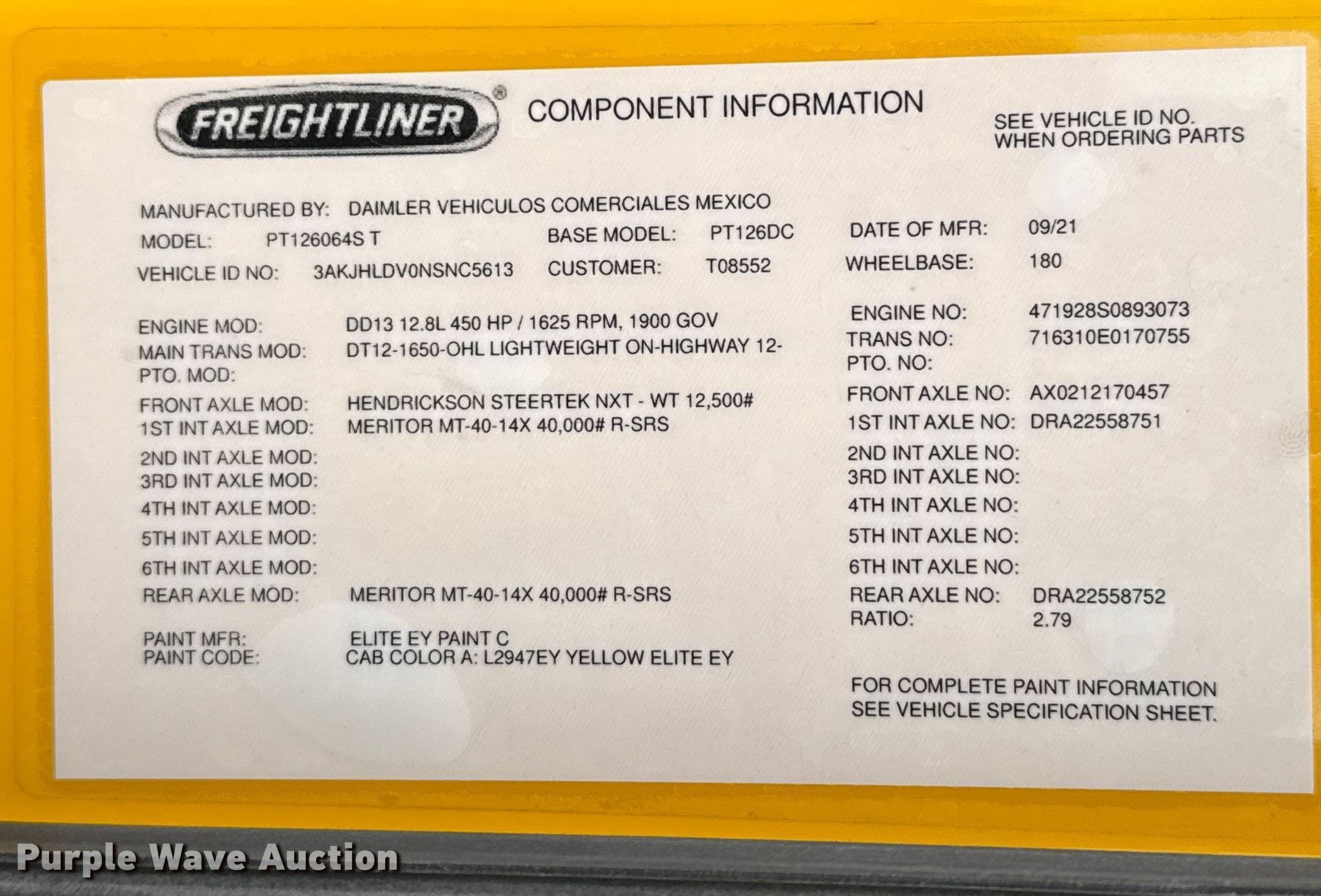 2022 Freightliner Cascadia 126 semi truck. Miles: 566,575 on odometer, Hours: 13,441 on meter, VIN: 3AKJHLDV0NSNC5613, Unit #: 22026. Engine Detroit DD13, Serial: 471928S0893073, Displacement: 12.8L, Cylinders: 6, Fuel type: Diesel, Engine brake. Transmission Automated manual. Chassis Axles: Tandem, Differential lock: Inter-axle, Suspension: Air, Brakes: Air, GVWR: 52,500 lbs FAWR: 12,500 lbs, IAWR: 20,000 lbs, RAWR: 20,000 lbs, Wheelbase: 180". Interior AC, Heat, Heated mirrors, Power windows, Power locks, Cruise control, Air ride cab, Auxiliary controls. Features Deck plate: Aluminum, Fifth wheel type: Fixed, Fuel tank: Single. Tires Front: 295/75R22.5, Rear: 445/50R22.5. Notes DEF tank damaged, Drivers side hood latch missing, Dash warning indicator: Check engine, Windshield chipped or cracked. Oklahoma title. Title distribution may be delayed up to 30 days from verification of funds. Gemini Motor Transport. Oklahoma City, OK 73127