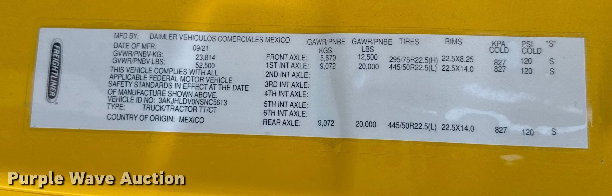 Purple Wave is selling a used Truck Tractor in Oklahoma. This item is a 2022 Freightliner Cascadia 126 semi truck with the following: Miles: 566,575 on odometer, Hours: 13,441 on meter, VIN: 3AKJHLDV0NSNC5613, Unit #: 22026