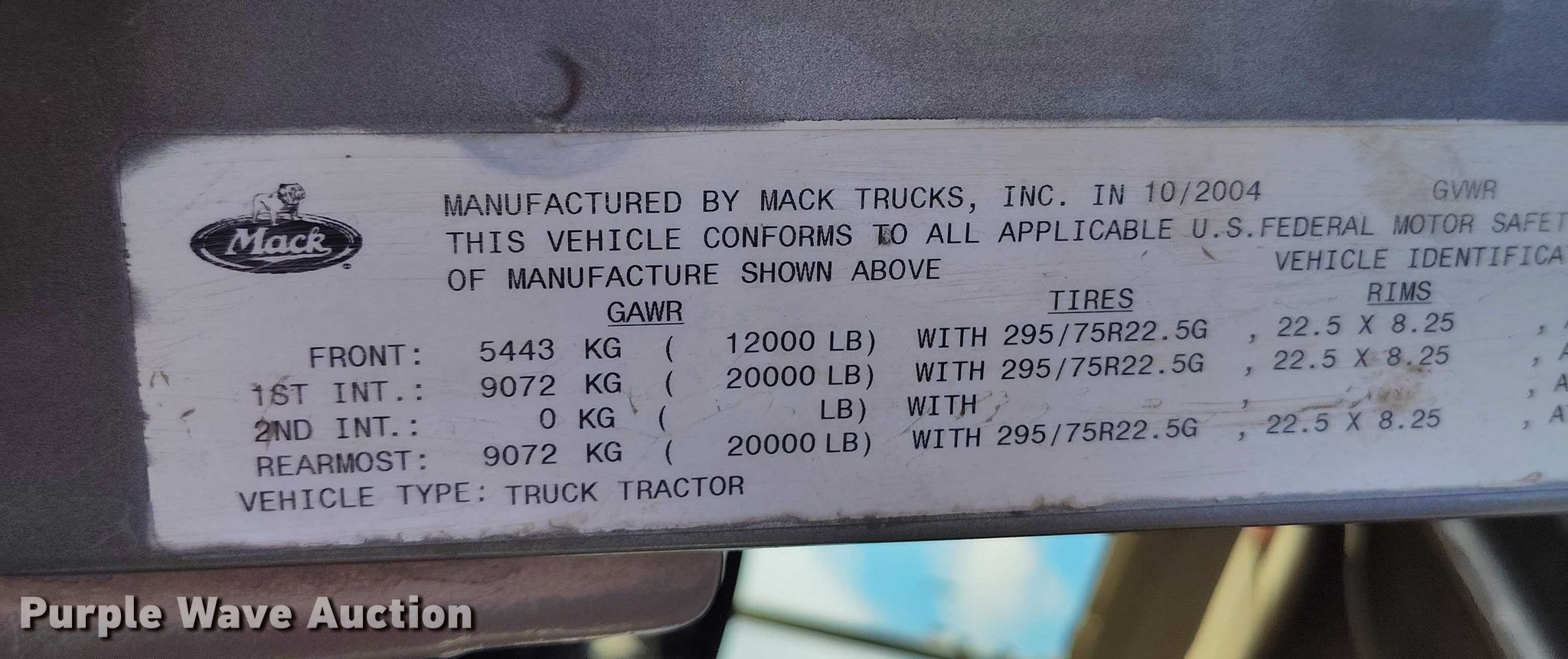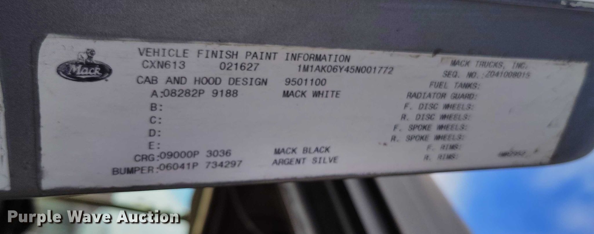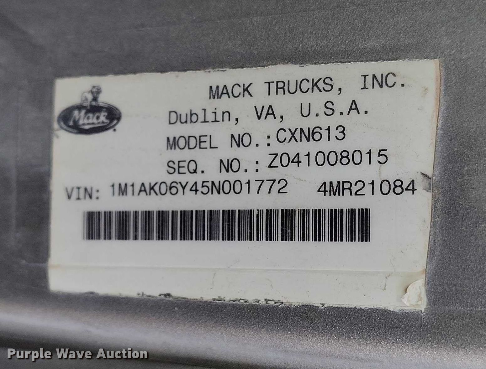 Take a look at this used 2005 Mack CXN 613 semi truck being sold on December 31st, 2025 in the Wednesday December 31 Truck and Trailer Auction made by Mack. Take a look at all of the item information below or take a look at similar auctions for Trucks.