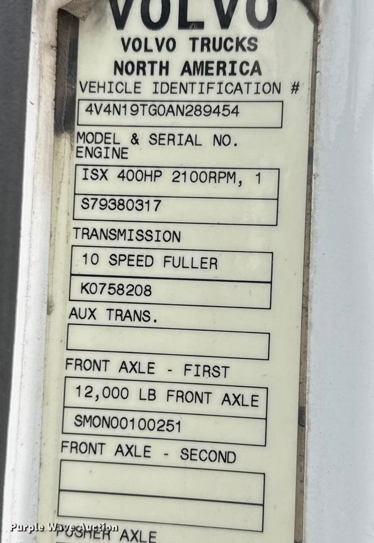 2010 Volvo VNL semi truck. Miles: 844,775 on odometer, VIN: 4V4N19TG0AN289454. Engine Cummins ISX 400ST, Serial: 79380317, Displacement: 15.0L, Cylinders: 6, Fuel type: Diesel, HP: 400, Engine brake. Transmission Eaton Fuller, Manual, Speed: 10. Chassis Axles: Tandem, Suspension: Air Dump valves, Brakes: Air, GVWR: 32,000 lbs FAWR: 12,000 lbs, RAWR: 20,000 lbs. Interior AC, Heat, Heated mirrors, Power windows, Power locks, Cruise control, Air ride cab. Features Fifth wheel type: Air operated, Sliding, Fuel tank: Dual. Tires Size: 275/80R22.5. Kansas title. Title distribution may be delayed up to 14 days from verification of funds. Seeders Inc... Wichita, KS 67215