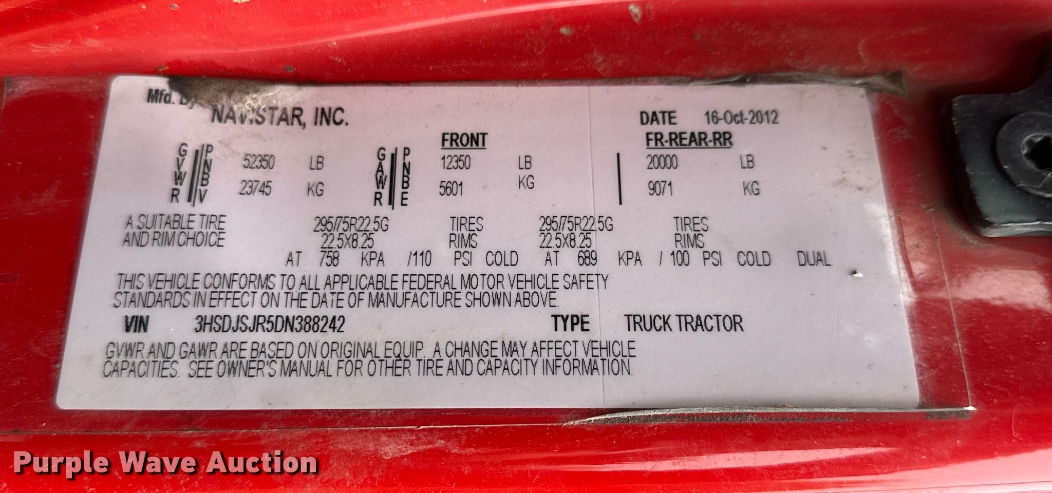 2013 International ProStar semi truck. Miles: 632,759 on odometer, Hours: 19,467 on meter, VIN: 3HSDJSJR5DN388242. Engine International MaxxForce, Displacement: 12.4L, Cylinders: 6, Fuel type: Diesel, Engine brake. Transmission Eaton Fuller, Manual, Speed: 10. Chassis Axles: Tandem, Differential lock: Inter-axle, Suspension: Air Dump valves, Brakes: Air, GVWR: 52,350 lbs FAWR: 12,350 lbs, IAWR: 20,000 lbs, RAWR: 20,000 lbs, Wheelbase: 585". Interior AC, Heat, Heated mirrors, Power windows, Power locks, Cruise control, Air ride cab, Sleeper Sleeper length: 70", Beds: Single, Rear climate control. Features Deck plate: Aluminum, Fifth wheel type: Air operated, Sliding, Fuel tank: Dual. Tires Front: 275/80R22.5, Rear: 295/75R22.5. Notes Windshield chipped or cracked, Unknown operating condition of AC, Unknown operating condition of auxiliary power unit. Kansas title. Title distribution may be delayed up to 14 days from verification of funds. Walton, KS 67151