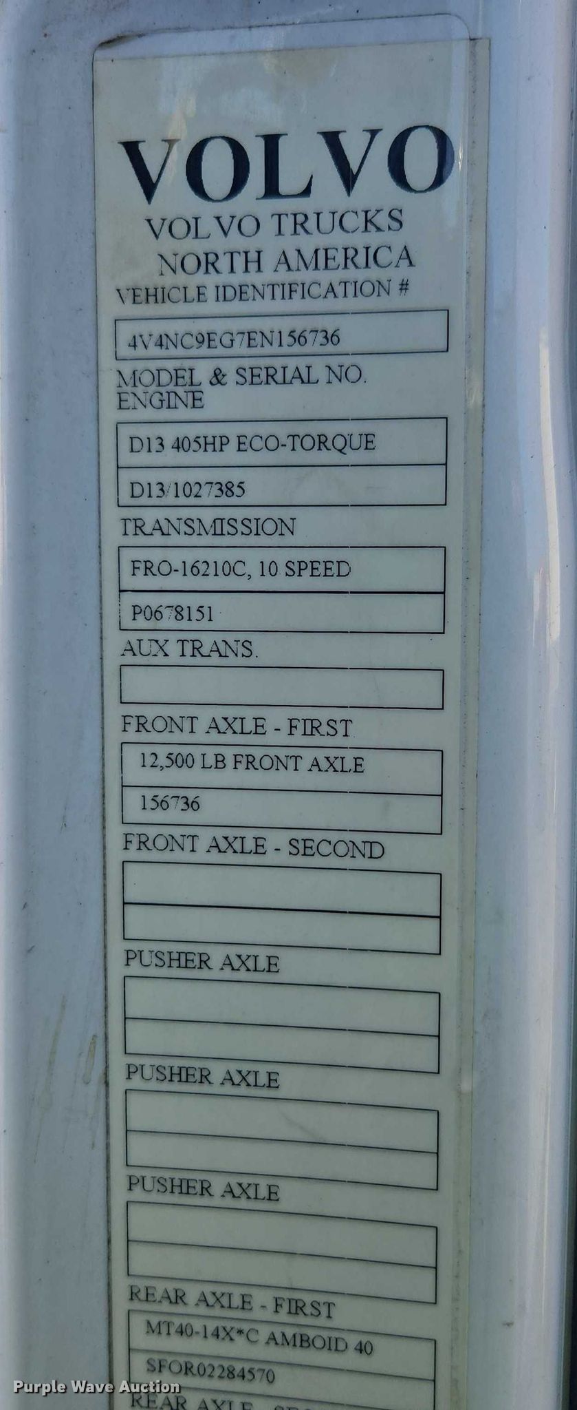 2014 Volvo VNL semi truck. Miles: 1,068,009 on odometer, VIN: 4V4NC9EG7EN156736, Unit #: 68550555. Engine Volvo D13H405, Serial: 1027385, Displacement: 12.8L, Cylinders: 6, Fuel type: Diesel, HP: 405. Transmission Manual, Speed: 10. Chassis Axles: Tandem, Differential lock: Inter-axle, Suspension: Air Dump valves, Brakes: Air, GVWR: 50,350 lbs. Interior AC, Heat, Heated mirrors, Power windows, Cruise control, Air ride cab, Sleeper Sleeper length: 60", Beds: Double bunk, Rear climate control. Features Deck plate: Aluminum, Fifth wheel type: Air operated, Sliding, Fuel tank: Dual. Tires Size: 295/75R22.5. Notes Dash warning indicator: Electrical system fault, Low system air pressure, TCS, Possible electrical issues, Non-operational engine, parts missing , Non-operational unit, Unit must be towed or hauled. Repossessed item, stored at a secured facility. Please review REQUIRED REMOVAL INSTRUCTIONS. Titles will be distributed after confirmation of payment and removal. Georgia title. Title distribution may be delayed up to 30 days from verification of funds. Lender Owned. Byron, GA 31008