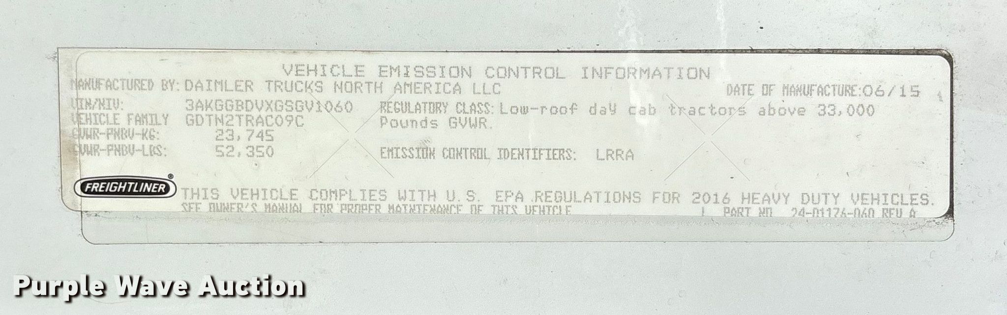 Take a look at this used 2016 Freightliner Cascadia semi truck being sold on December 31st, 2025 in the Wednesday December 31 Truck and Trailer Auction made by Freightliner. Take a look at all of the item information below or take a look at similar auctions for Trucks.
