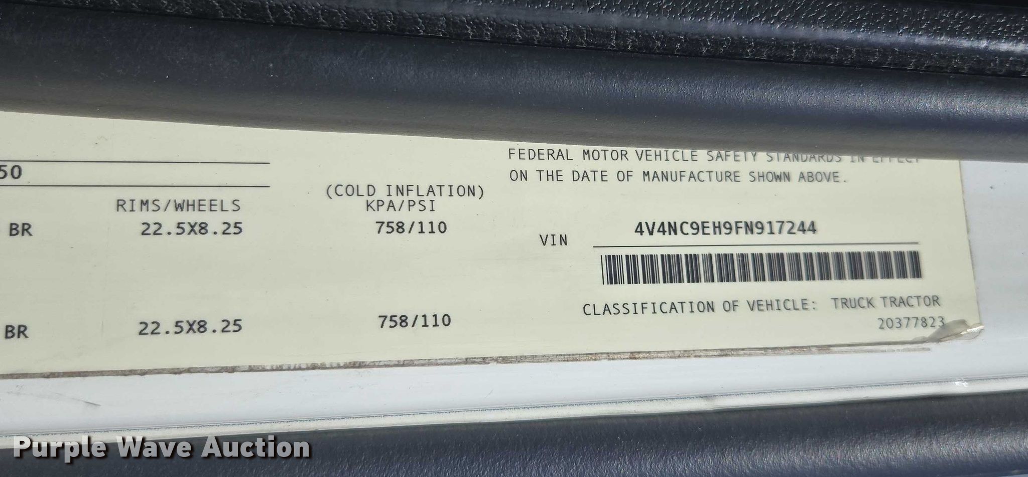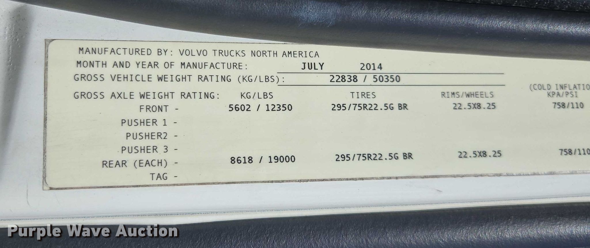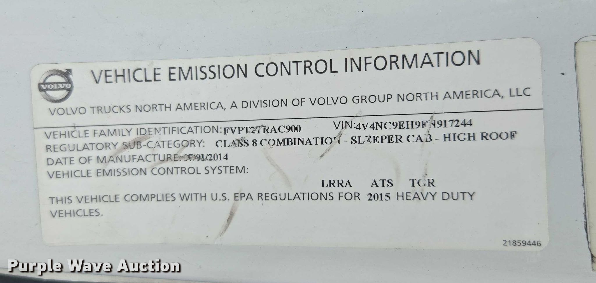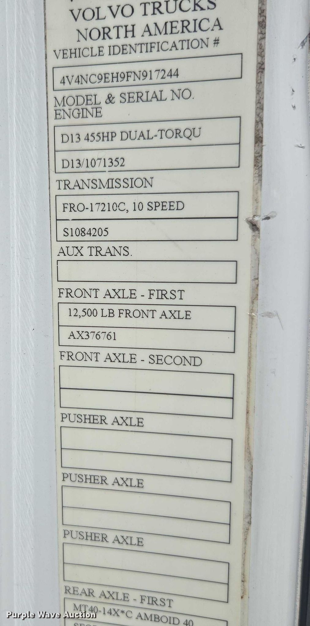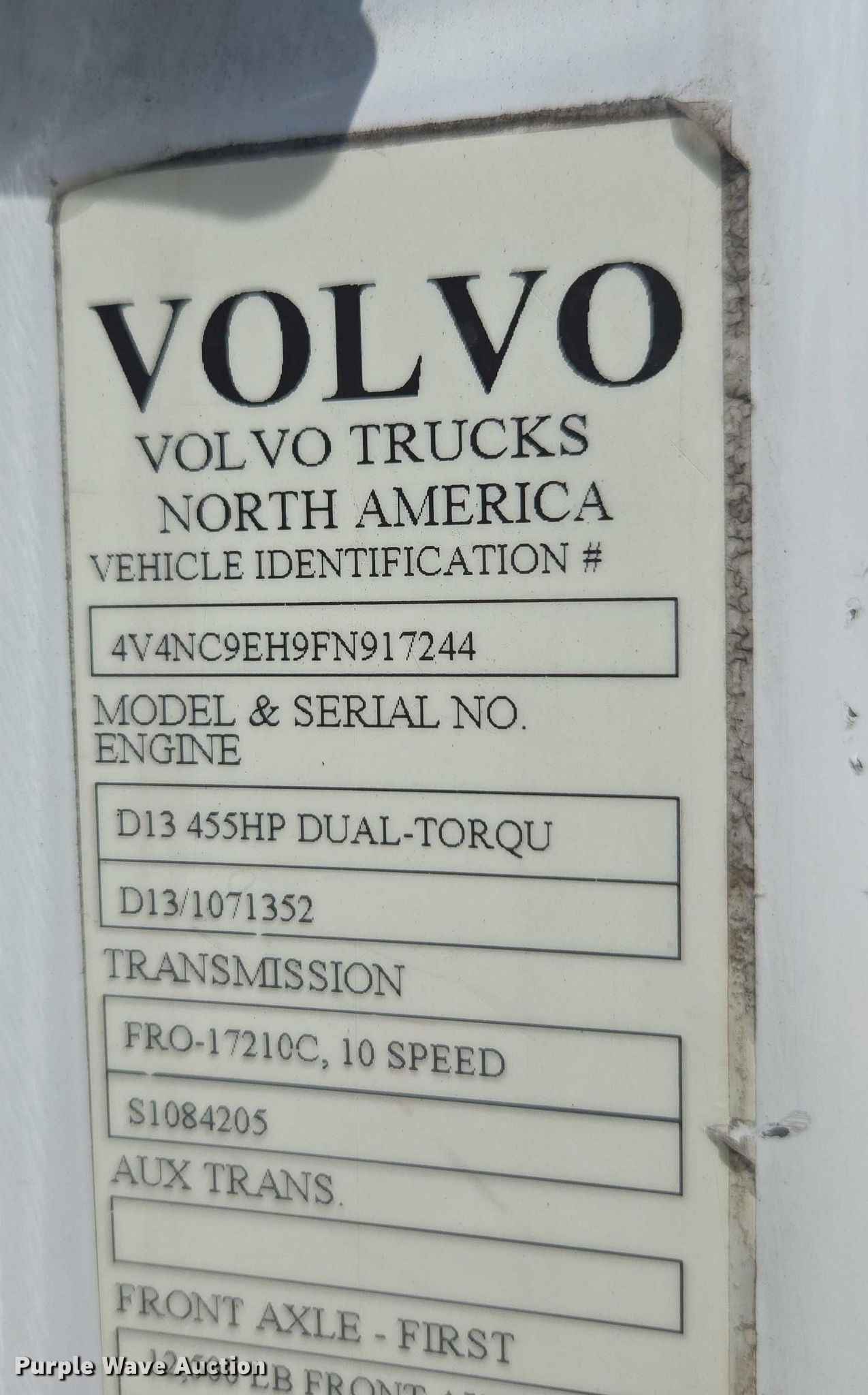 2015 Volvo VNL semi truck. Miles: 740,293 on odometer, VIN: 4V4NC9EH9FN917244, Unit #: 71472845. Engine Volvo D13J455, Displacement: 12.8L, Cylinders: 6, Fuel type: Diesel, Engine brake. Transmission Manual, Speed: 10. Chassis Axles: Tandem, Differential lock: Inter-axle, Suspension: Air Dump valves, Brakes: Air, GVWR: 50,350 lbs FAWR: 12,350 lbs, RAWR: 19,000 lbs. Interior AC, Heat, Heated mirrors, Power windows, Power locks, Cruise control, Air ride cab, Sleeper Sleeper length: 60", Beds: Single, Rear climate control. Features Deck plate: Aluminum, Fifth wheel type: Air operated, Sliding, Fuel tank: Dual. Tires Size: 295/75R22.5. Repossessed item, stored at a secured facility. Please review REQUIRED REMOVAL INSTRUCTIONS. Titles will be distributed after confirmation of payment and removal. Indiana title. Title distribution may be delayed up to 30 days from verification of funds. Lender Owned. Clewiston, FL 33440