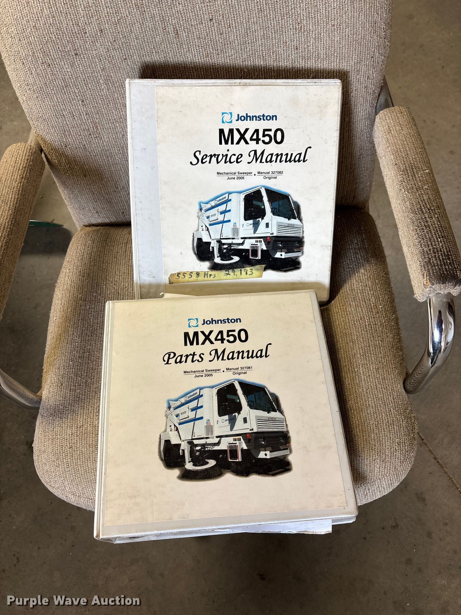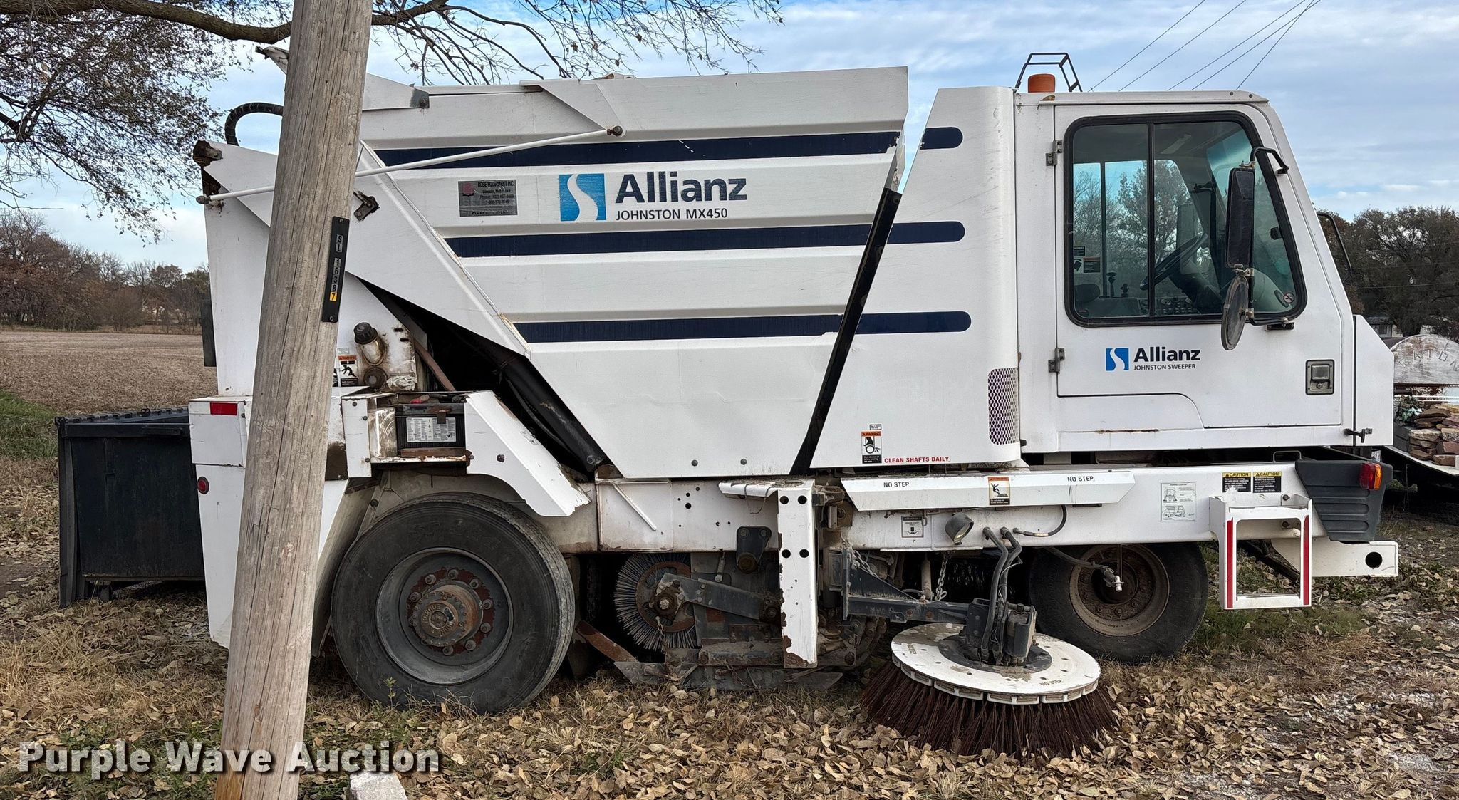 Allianz Johnston MX 450 street sweeper. Miles: 1,531 on odometer, Miles: Actual unknown, Hours: 5,703 on meter, VIN: K1U9VM3H6390172138, Serial: 172138. Engine Cylinders: 4, Fuel type: Diesel. Transmission Automatic. Chassis Brakes: Hydraulic. Operators station Enclosed cab, AC, Heat. Features Sweeper bed type: Conveyor, Broom Width: 60", Left gutter broom Diameter: 34", Right gutter broom Diameter: 34", Water spray system. Tires Front: 10 R17.5, Rear: 11 R22.5. Notes Dead battery, Unit high centered, Unknown operating condition. Transfer of ownership documentation will be a bill of sale. Humboldt, NE 00000