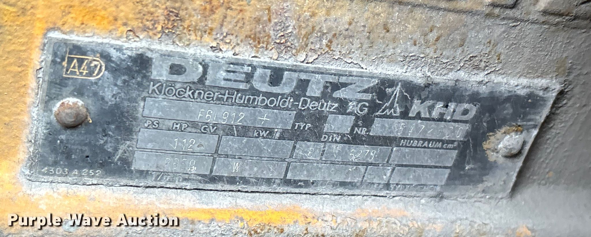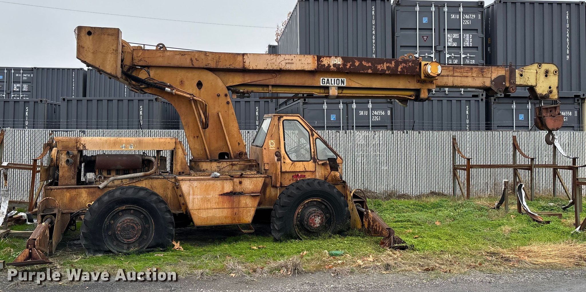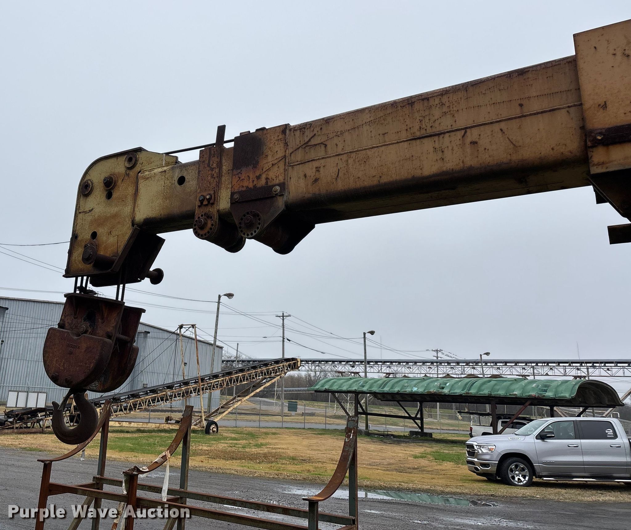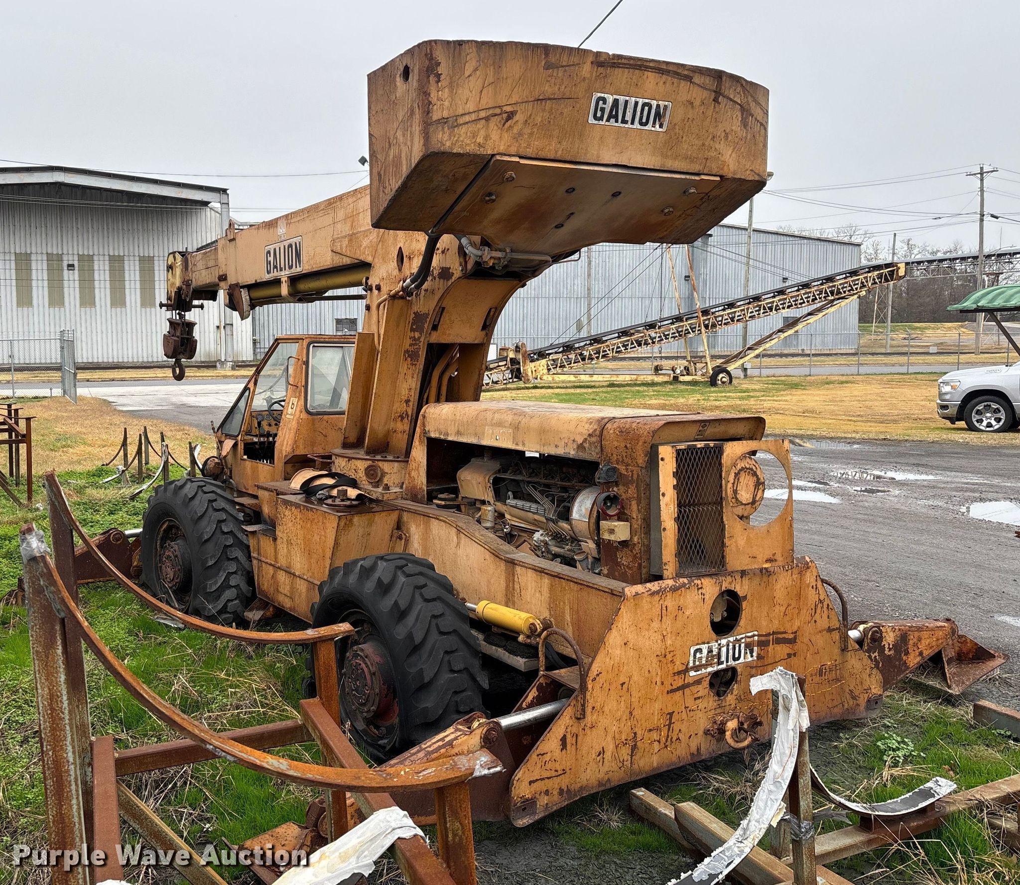 1975 Galion 150 Series A crane. Hours: 636 on meter, Serial: 6774. Engine Deutz, Cylinders: 6, Fuel type: Diesel. Transmission Power shift. Chassis Brakes: Hydraulic, Controls: Hydraulic actuated. Operators station Enclosed cab, Crane controls: Joysticks. Features Boom Telescopic, Sections: 3, Stabilizers: 4, Boom controls In-cab, Winches: 1, Crane block Sheaves: 2. Tires Size: 14.00-24. Notes Glass cracked, Hydraulic leak, Water leak, Fuel leak, Non-operational unit. Paducah-McCracken County Riverport Authority. Paducah, KY 42002