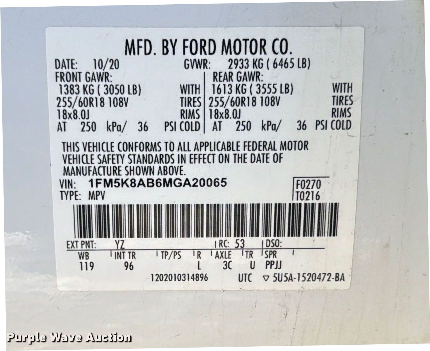 2021 Ford Explorer Police Interceptor SUV. Miles: 137,681 on odometer, VIN: 1FM5K8AB6MGA20065. Engine Displacement: 3.3L, Cylinders: 6, Fuel type: Gas. Transmission Automatic, All wheel drive. Interior AC, Heat, Seat: Power driver, Heated mirrors, Power windows, Power locks, Cruise control, Backup camera. Tires Size: 255/60R18. Notes Center console missing. Iowa title. Seller is a government entity who will be assigning and distributing the title. Please contact the seller for distribution questions. Title distribution may be delayed up to 14 days from verification of funds. Marion County Sheriff's Office. Knoxville, IA 50138