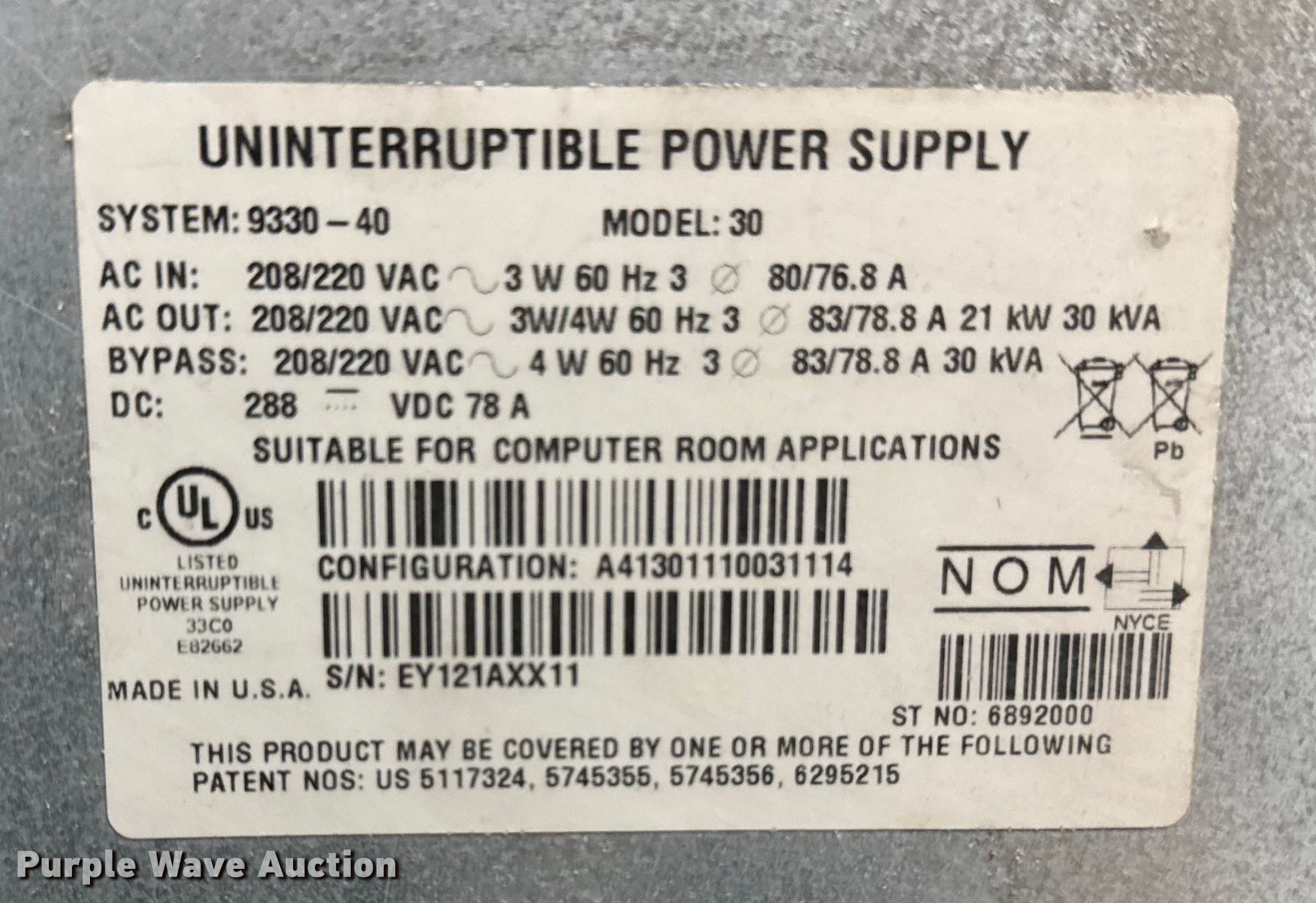 Purple Wave is selling a used Electronics in Iowa. This item is a Powerware 30 uninterrupted power supply with the following: Volts: 208/220, Serial: EY121AXX11