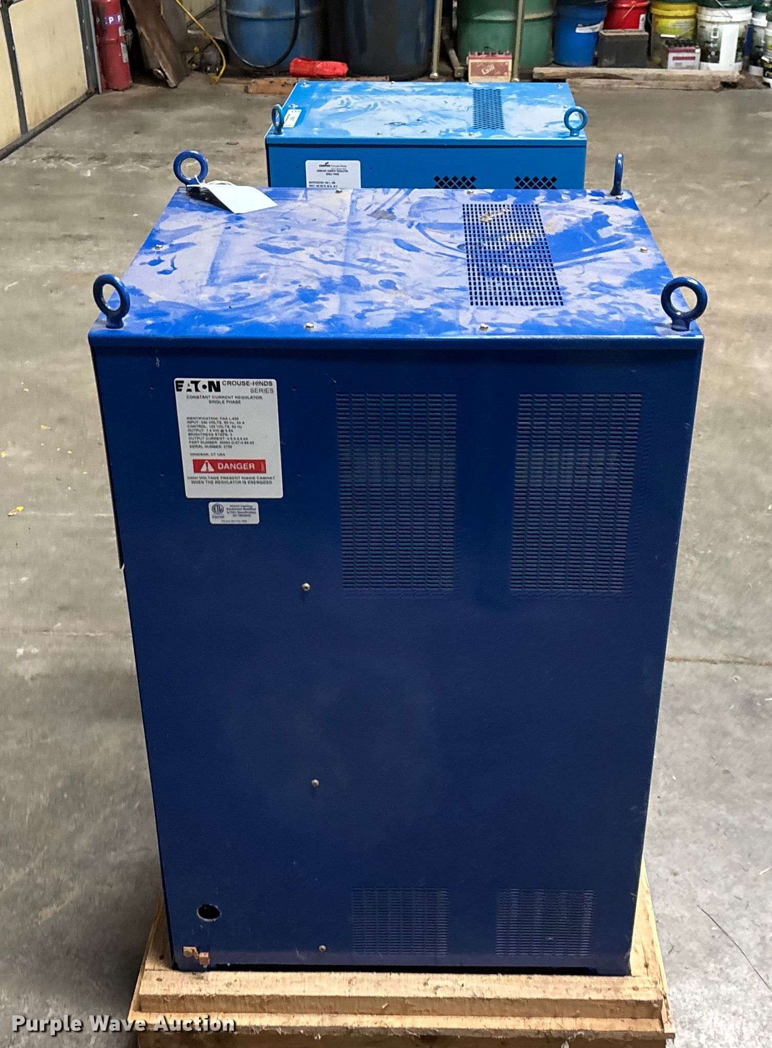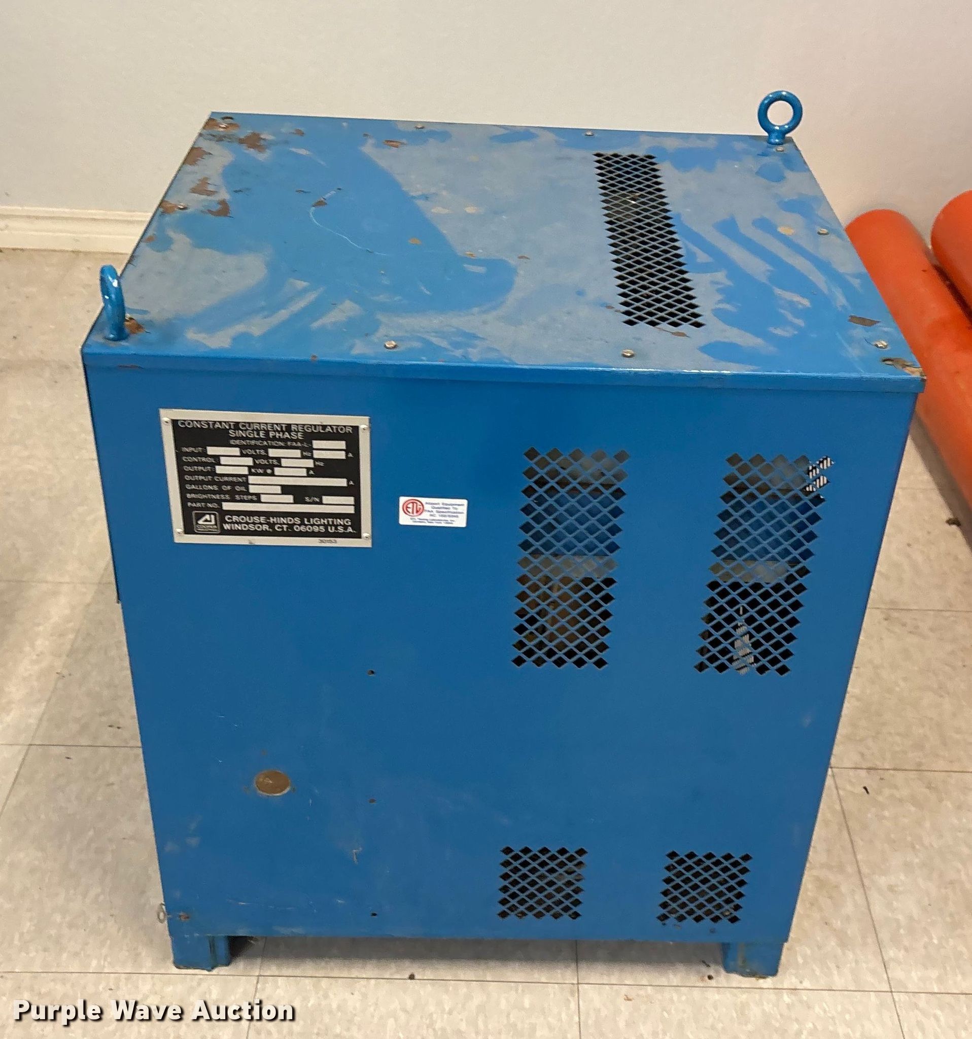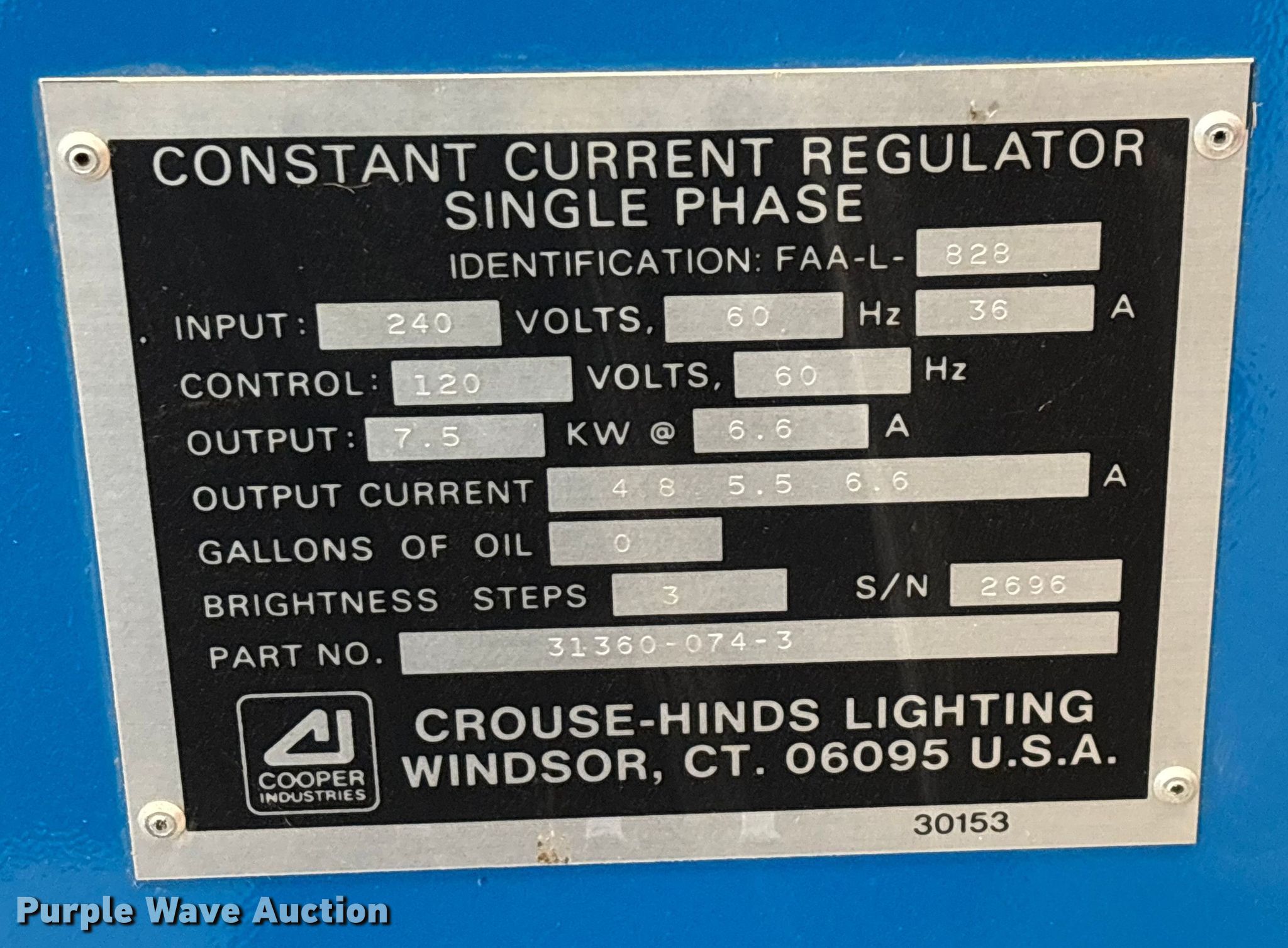 Purple Wave is selling a used Building Materials in Missouri. This item is a (4) airport runway lighting constant current regulators with the following: Eaton/ Cooper Crouse-Hinds Series Constant Current Regulator, ID: FAA L-828, Serial: 2789, Volts: 240, Hertz: 60, Output: 7.5 KW, Phase: Single, Cooper Crouse-Hinds, Constant current regulator, ID: FAA L - 828, Serial: 2461, Volts: 240, Hertz: 60, Output: 10 kW, Phase: Single, Crouse-Hinds Constant Current Regulator, ID: FAA-L-828, Serial: 2696, Volts: 240, Hertz: 60, Output: 7.5 kW, Phase: Single, Constant Current Regulator, Volts: 240 v, Output: 10 kW, Non-operational unit