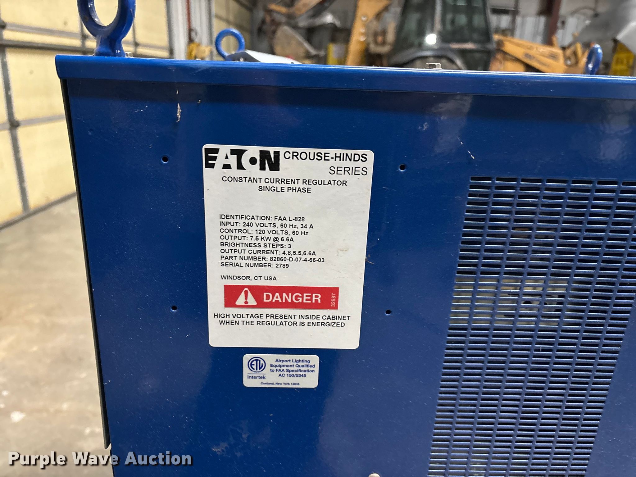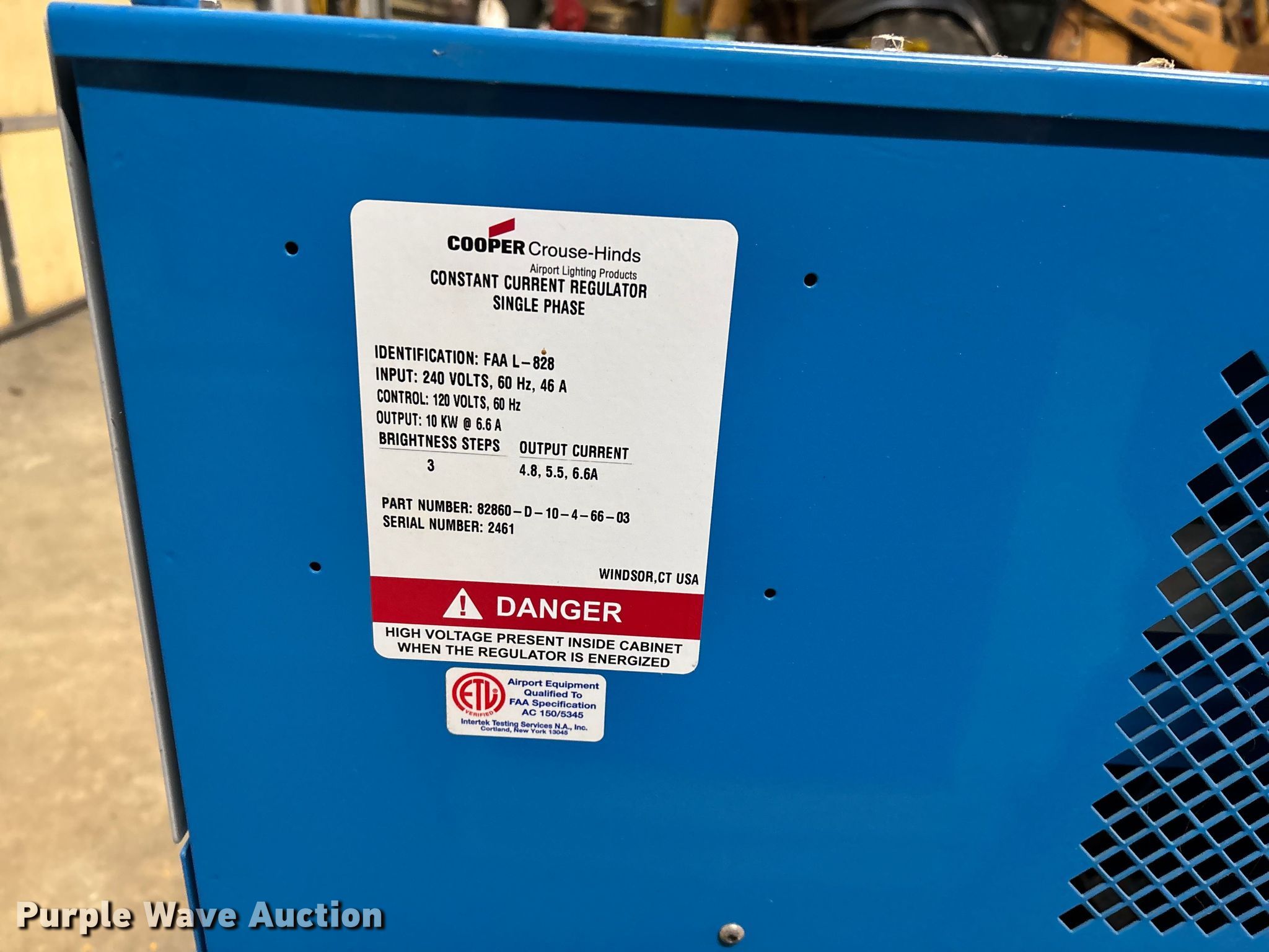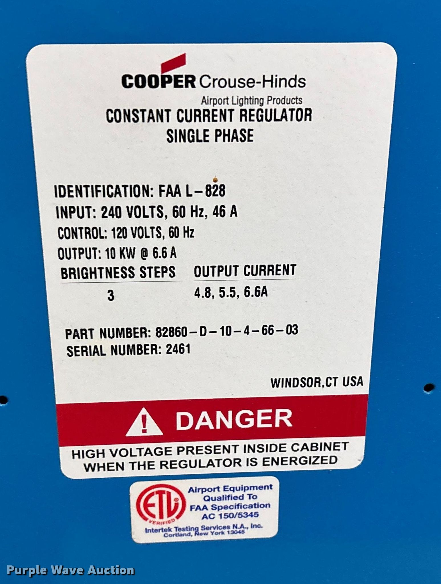 (4) airport runway lighting constant current regulators. Eaton/ Cooper Crouse-Hinds Series Constant Current Regulator ID: FAA L-828, Serial: 2789, Volts: 240, Hertz: 60, Output: 7.5 KW, Phase: Single, Cooper Crouse-Hinds Constant current regulator, ID: FAA L - 828, Serial: 2461, Volts: 240, Hertz: 60, Output: 10 kW, Phase: Single, Crouse-Hinds Constant Current Regulator ID: FAA-L-828, Serial: 2696, Volts: 240, Hertz: 60, Output: 7.5 kW, Phase: Single, Constant Current Regulator Volts: 240 v, Output: 10 kW, Non-operational unit. City of Monett, MO. Pierce City, MO 65723