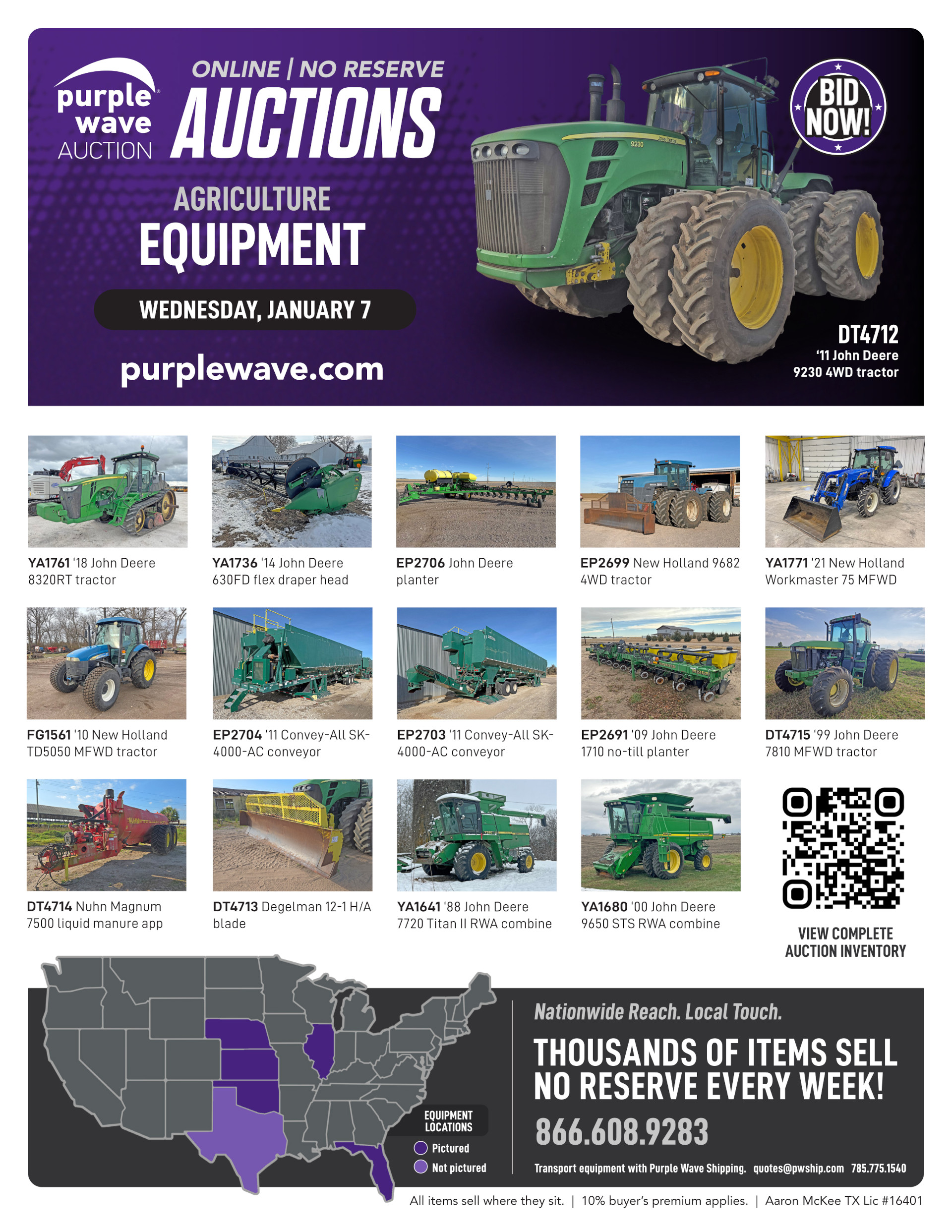 This auction is conducted by Purple Wave, Inc., whose home office is 825 Levee Drive, Manhattan, Kansas. Aaron McKee, Texas auctioneer license # 16401, operates Purple Wave, Inc. Complaints against us may be directed to the Texas Department of Licensing and Regulation, P.O. Box 12157, Austin, Texas 78711, (512) 463-6599. For additional required information, see the attached document.
