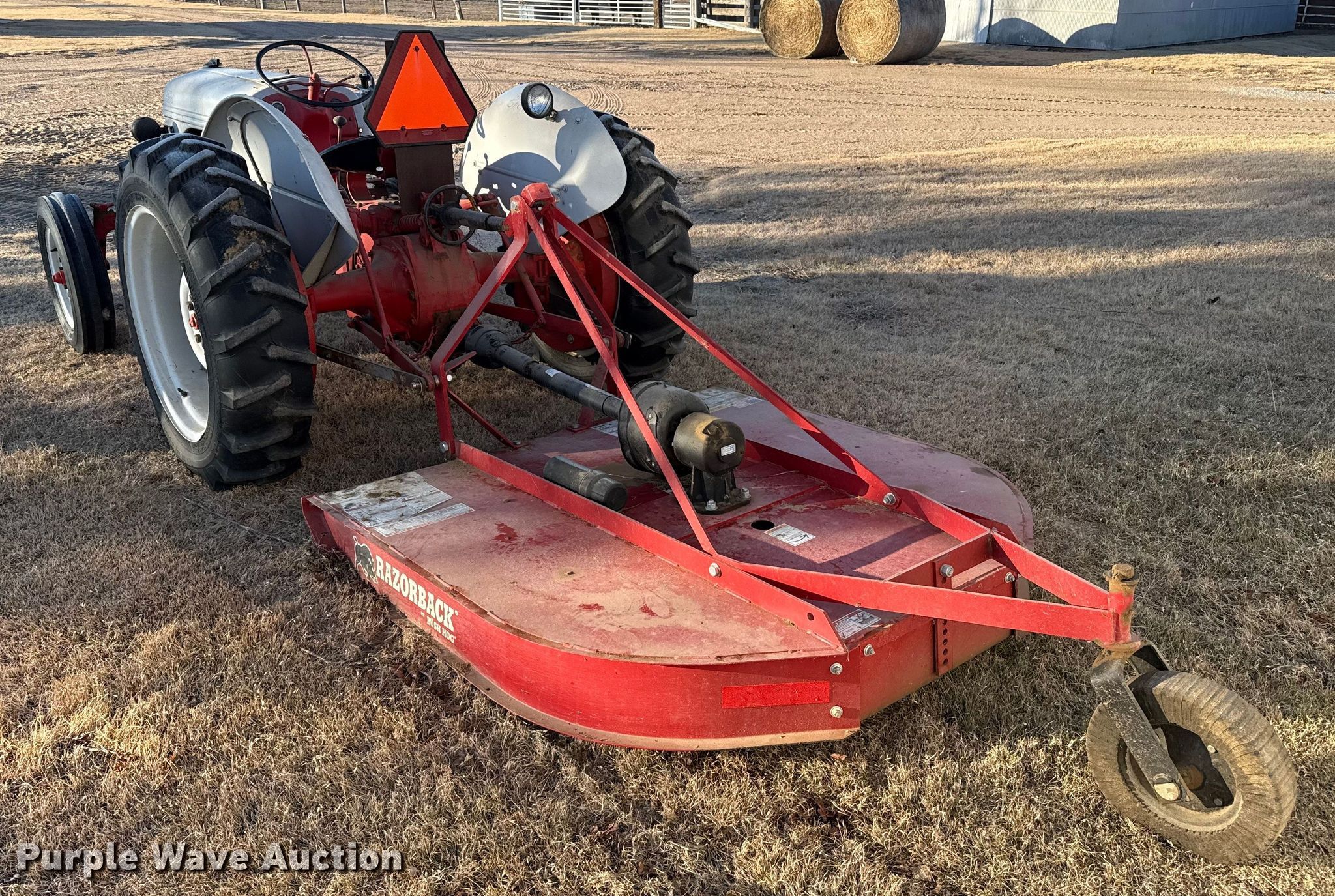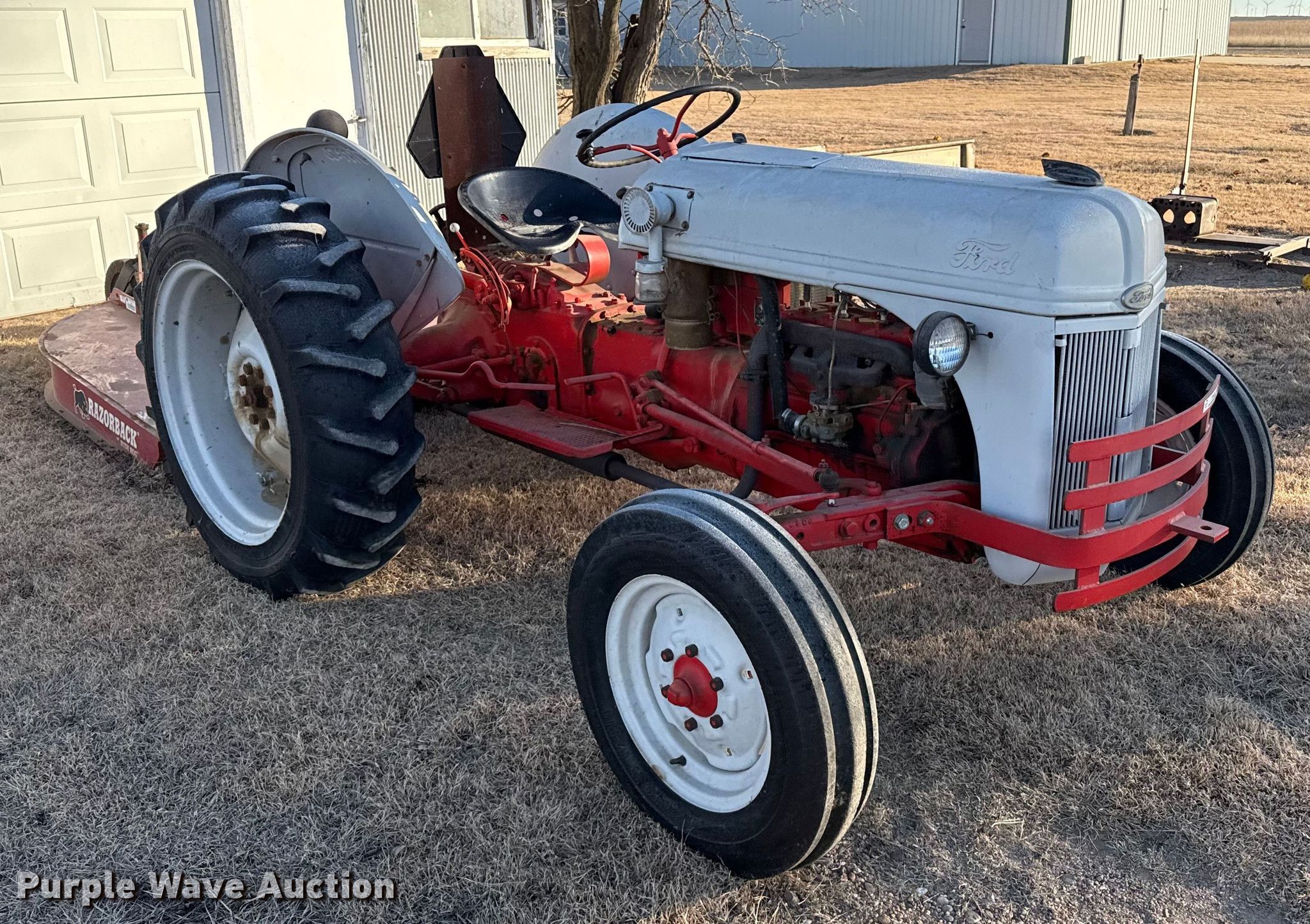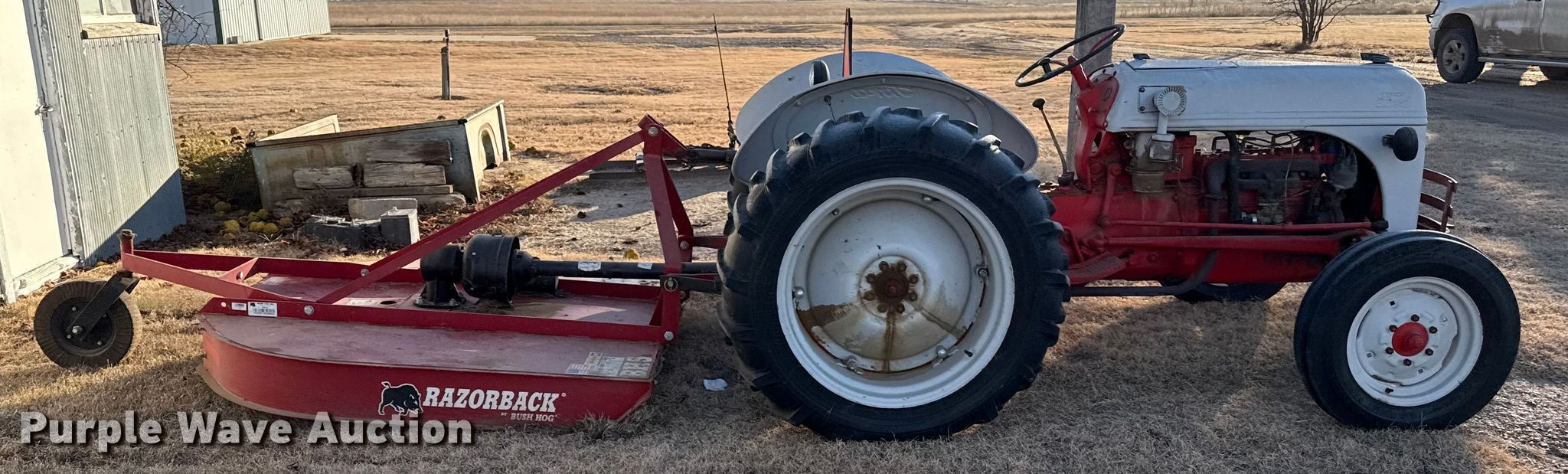 1950 Ford 8N tractor. Serial: 303295. Engine Ford, Displacement: 2.0L, Cylinders: 4, Fuel type: Gas. Transmission Manual, 4F - 1R. Features PTO: 540, Three point Top link, Rotary mower Bush Hog BH5 Razorback Serial: 1HCHR1182290431, Hitch: three point, Working width: 60", PTO: 540, Tires: Solid.. Tires Front: 6.00-16, Rear: 11.2-28, Wheel weights: 2. Cimarron, KS 67835