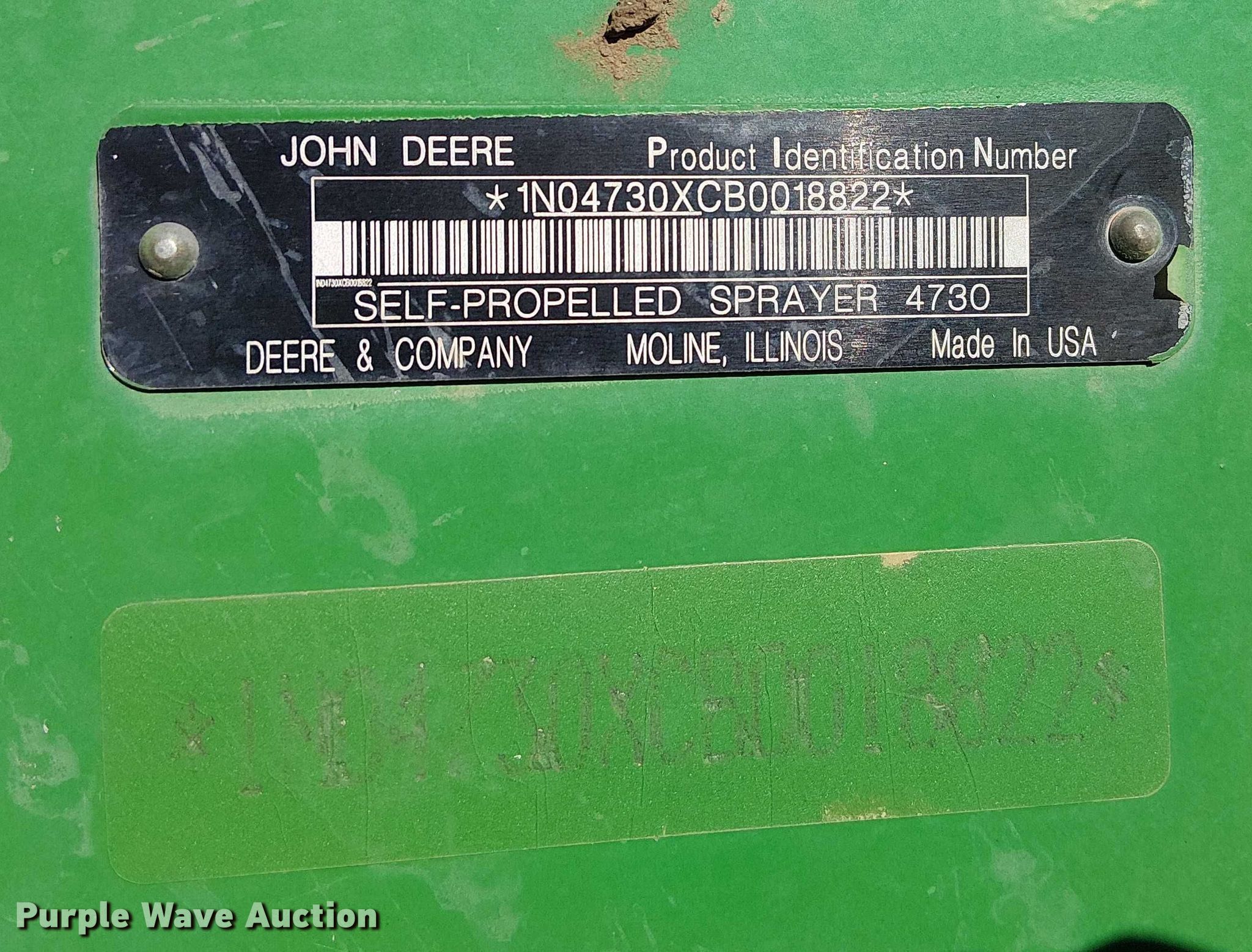 Purple Wave is selling a used Applicator Self Propelled in Missouri. This item is a John Deere 4730 sprayer with the following: Engine hours: 6,352 on meter, Serial: 1N04730XCB0018822