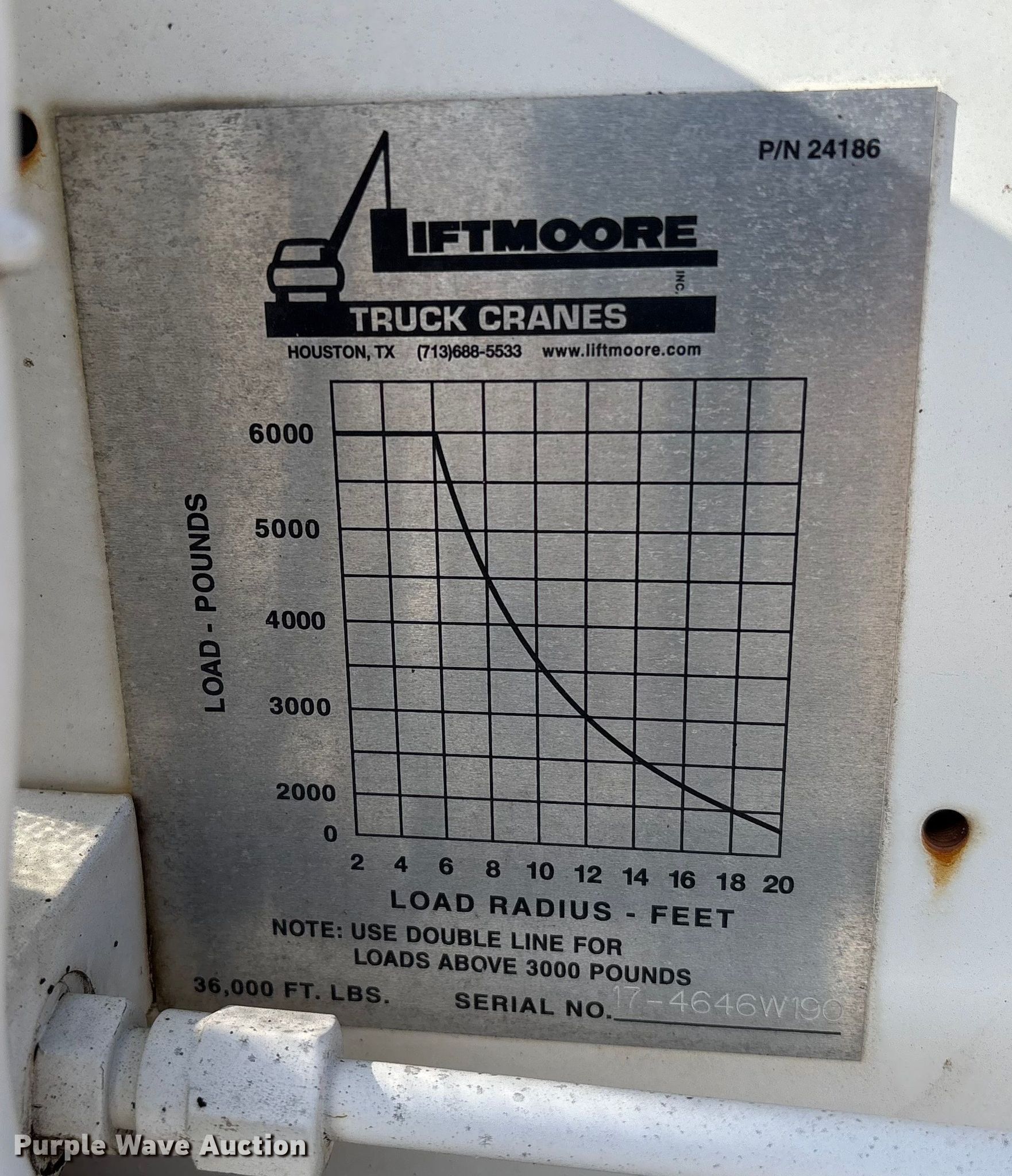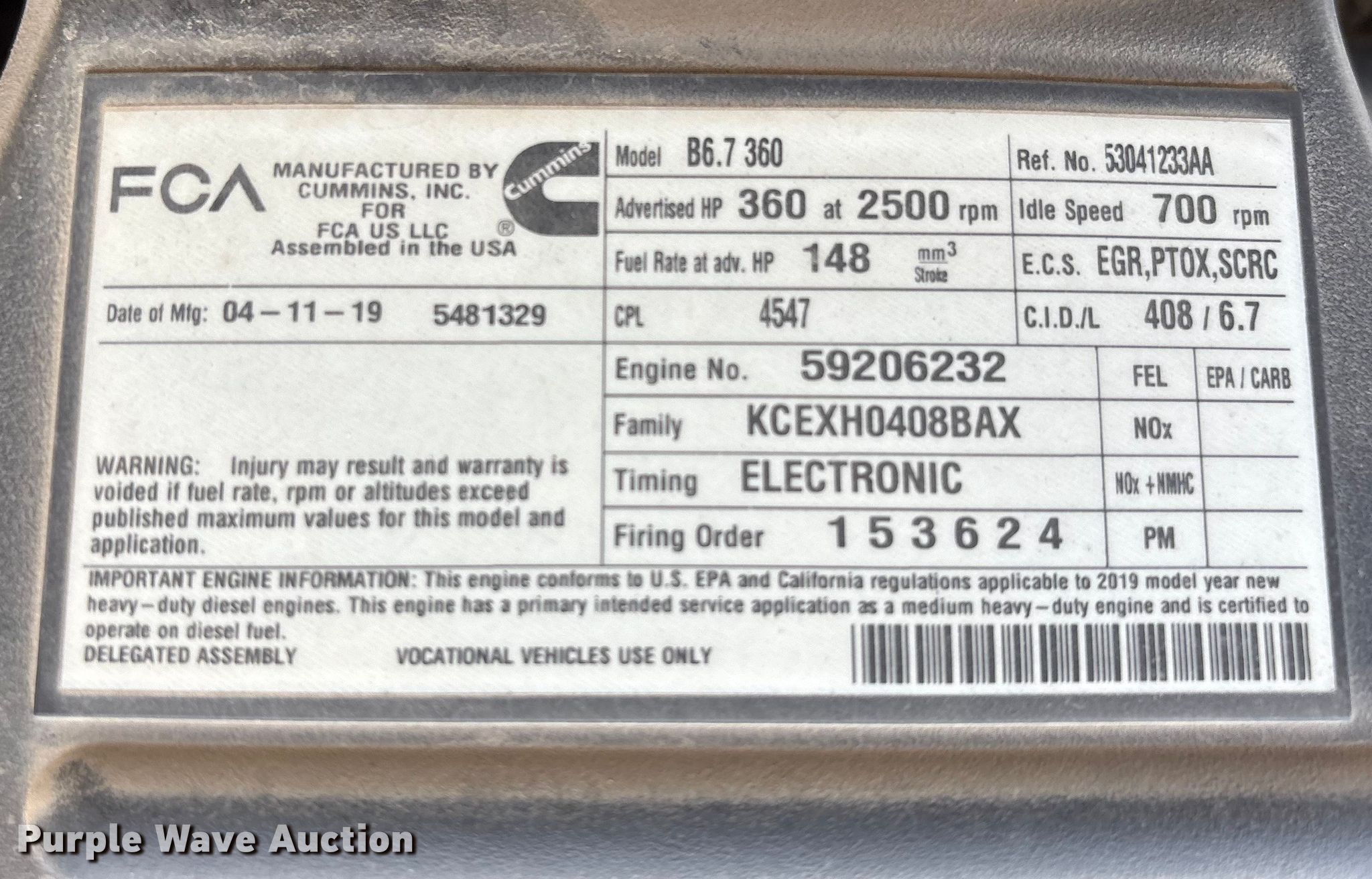 2019 RAM 5500 utility / service truck. Miles: 178,129 on odometer, VIN: 3C7WRNBL0KG535481. Engine Cummins B6.7 360, Serial: 59206232, Displacement: 6.7L, Cylinders: 6, Fuel type: Diesel, HP: 360. Transmission Automatic. Chassis Four wheel drive, Axles: Single, Suspension: Spring, Brakes: Hydraulic, GVWR: 19,500 lbs. Interior AC, Heat, Heated mirrors, Power windows, Power locks, Cruise control, Auxiliary controls, Brake controller. Features Bed Utility bed, Length: 12' 8", Width: 8', Torch bottle rack Tanks not included, Crane Liftmoore 6036, Maximum lift capacity: 6,000 lbs. Tires Size: 245/70R19.5, Brand: Hankook. Notes Dash warning indicator: Airbag, Windshield chipped or cracked, Crane issues, does not go up Solenoid seized. Texas title. Title distribution may be delayed up to 30 days from verification of funds. Summit Equipment Company Inc. Houston, TX 77066