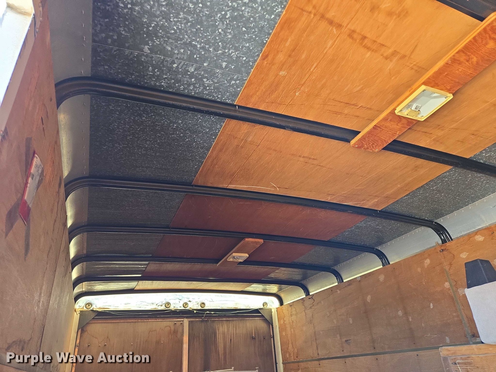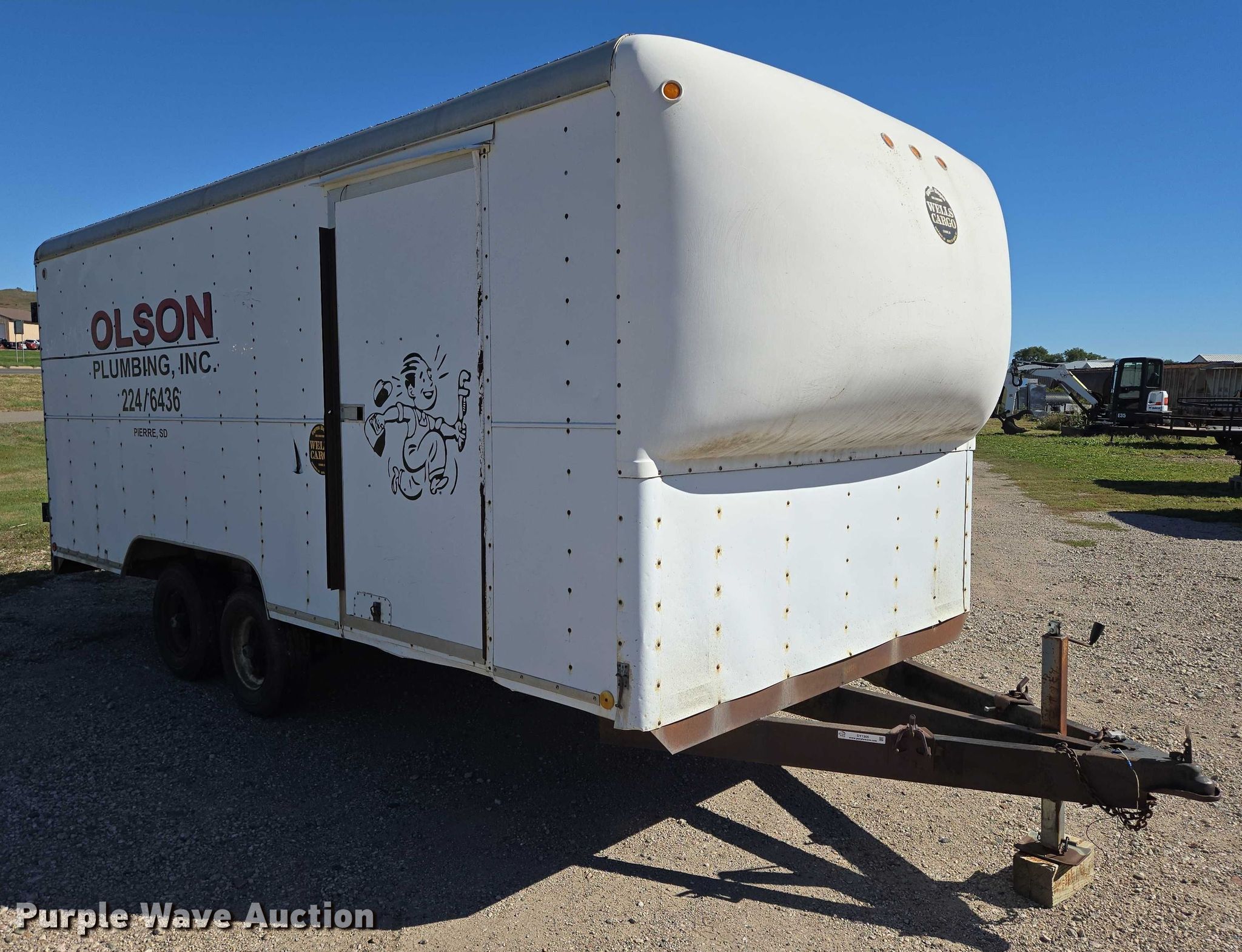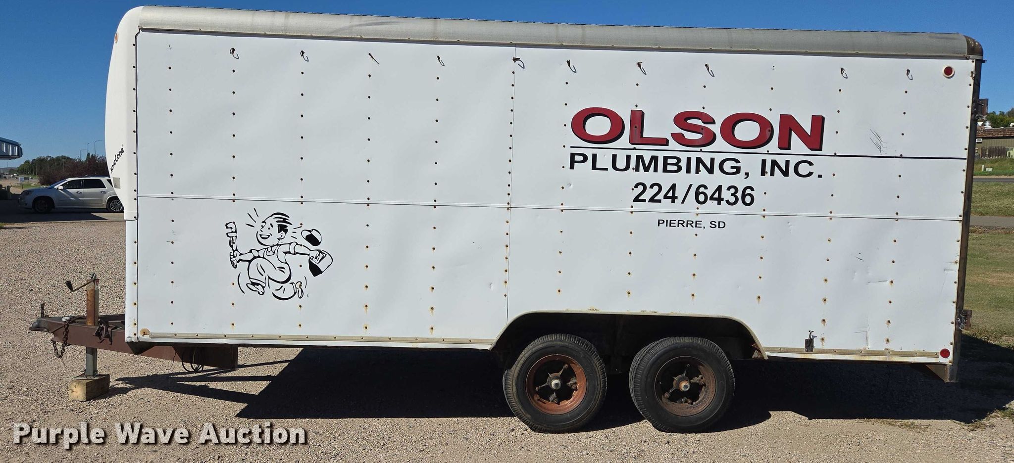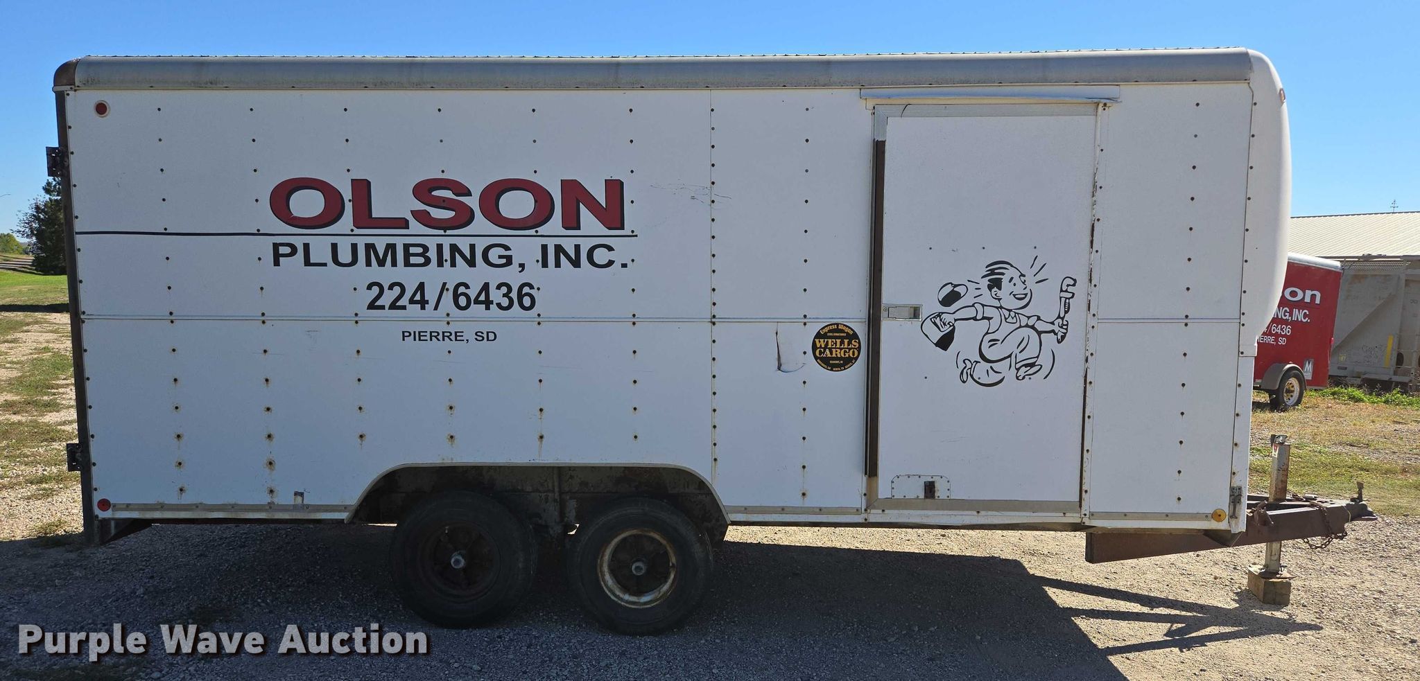 1984 Wells Cargo Express Wagon enclosed cargo trailer. VIN: 1WC200G29E1030628. Dimensions Overall Length: 21', Width: 95", Body Length: 17', Width: 95". Features Deck type: Wood. Chassis Ball hitch: 2 5/16", Landing gear: Single, Suspension: Spring, Brakes: Electric, Axles: Tandem. Tires Steel wheels, Size: 8-14.5. Notes Contents not included, will be removed prior to auction, Decals will be removed prior to sale, Parts damaged. South Dakota title. Title distribution may be delayed up to 14 days from verification of funds. Olson Plumbing Inc.. Pierre, SD 57501
