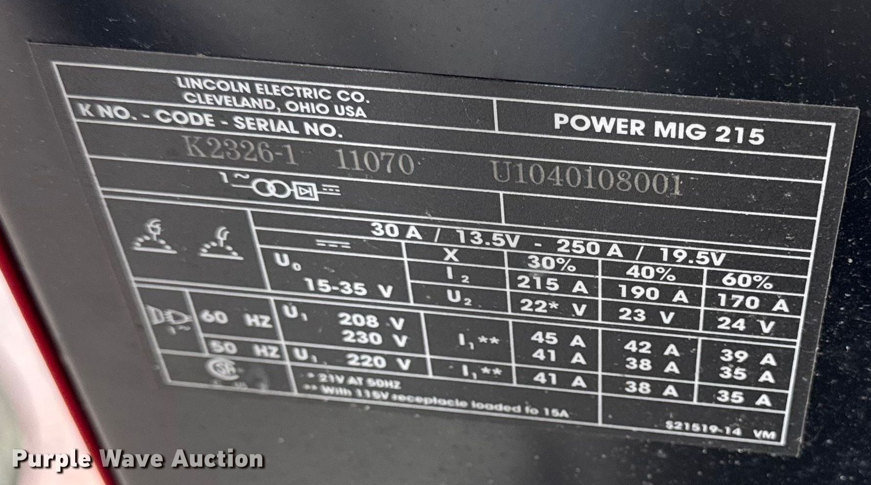 Purple Wave is selling a used Welder (Manual) in Iowa. This item is a Lincoln Electric Power Mig 215 welder with the following: Serial: 11070