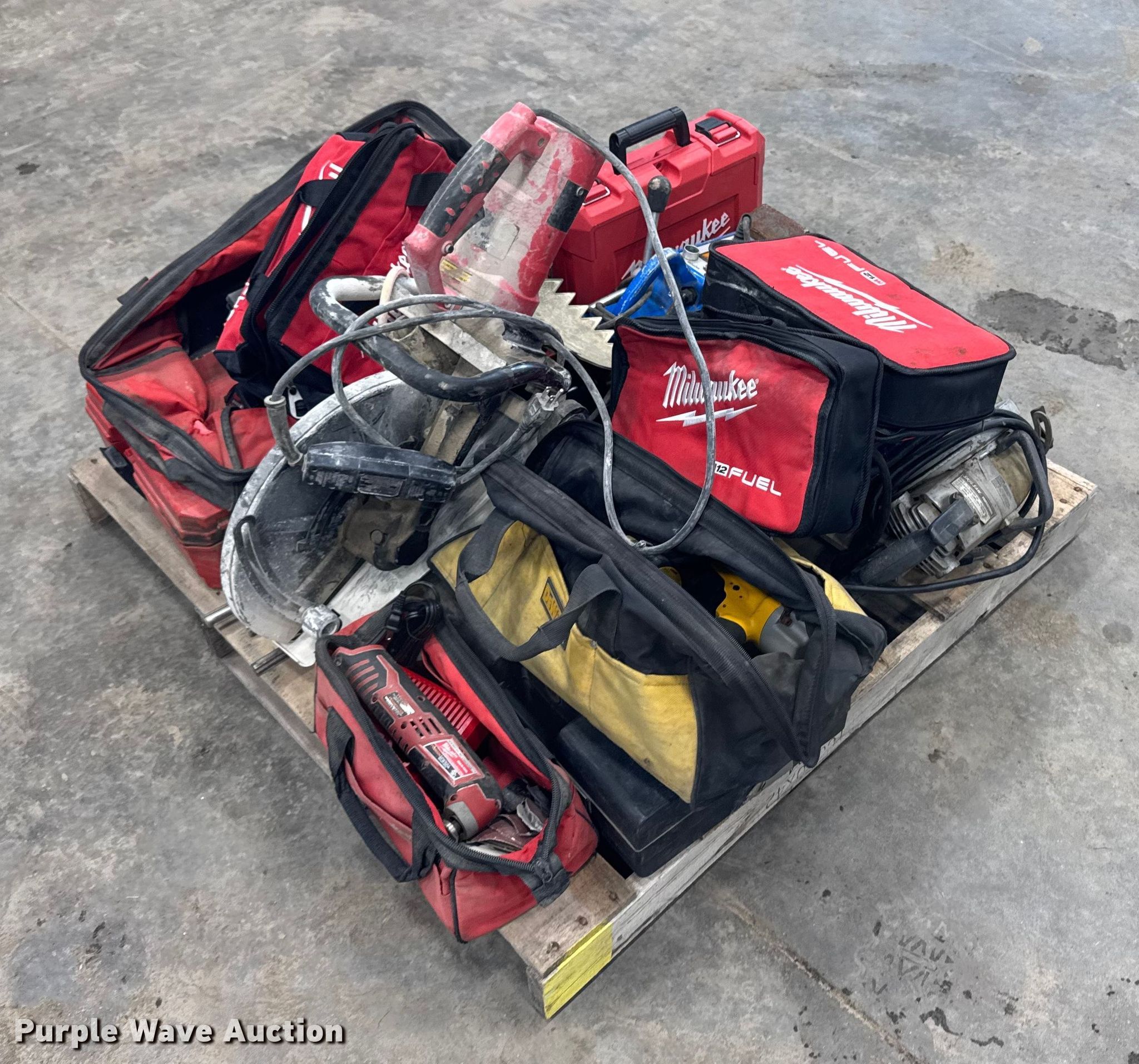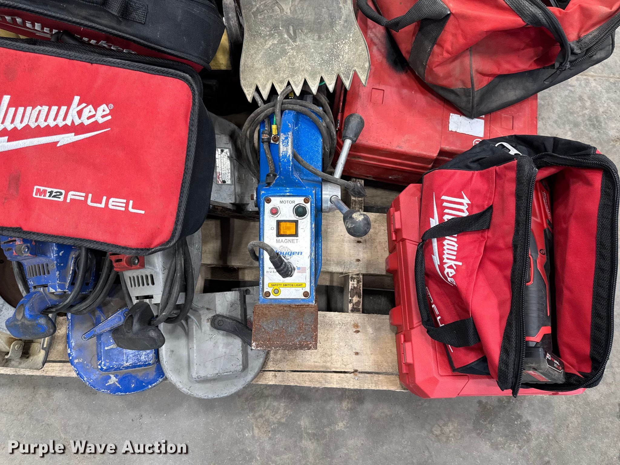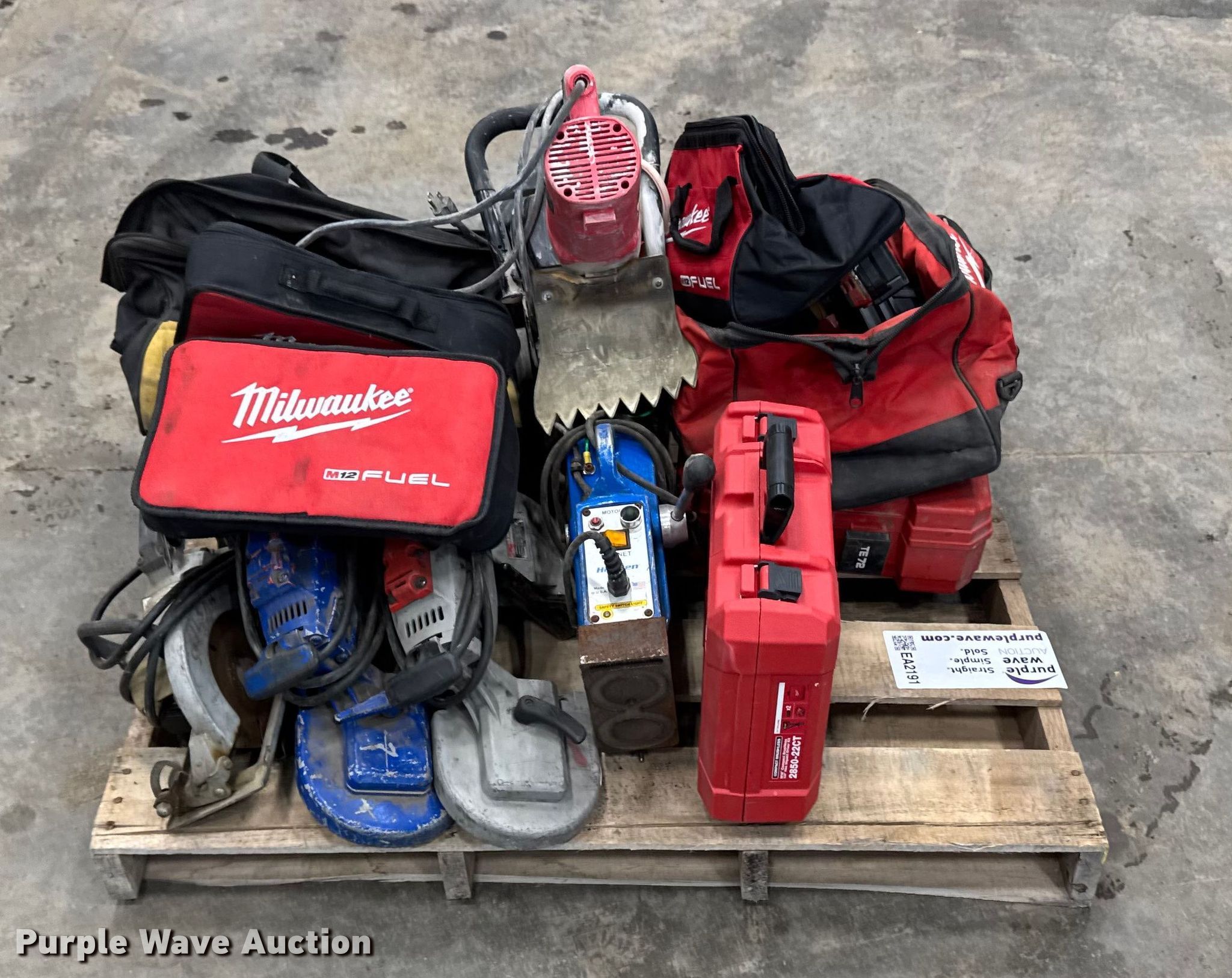 Purple Wave is selling a used Tools in Iowa. This item is a Tools with the following: Milwaukee, Drills, Drivers, Band saws, Mag, Drill, Concrete saw, Core drill, Circular saw, Nail guns