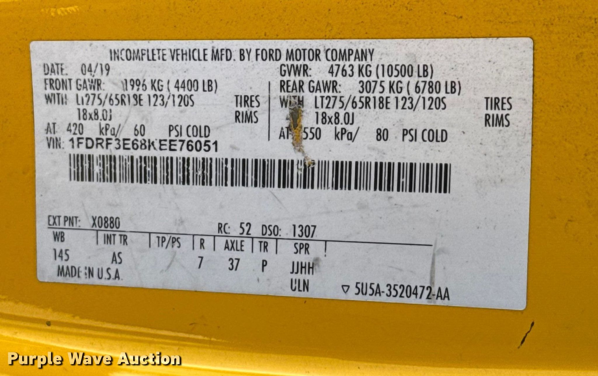 Purple Wave is selling a used 3/4 or 1 Ton Pickup or Van in Oklahoma. This item is a 2019 Ford F350 Super Duty utility bed pickup truck with the following: Miles: 159,171 on odometer, VIN: 1FDRF3E68KEE76051, Unit #: E76051