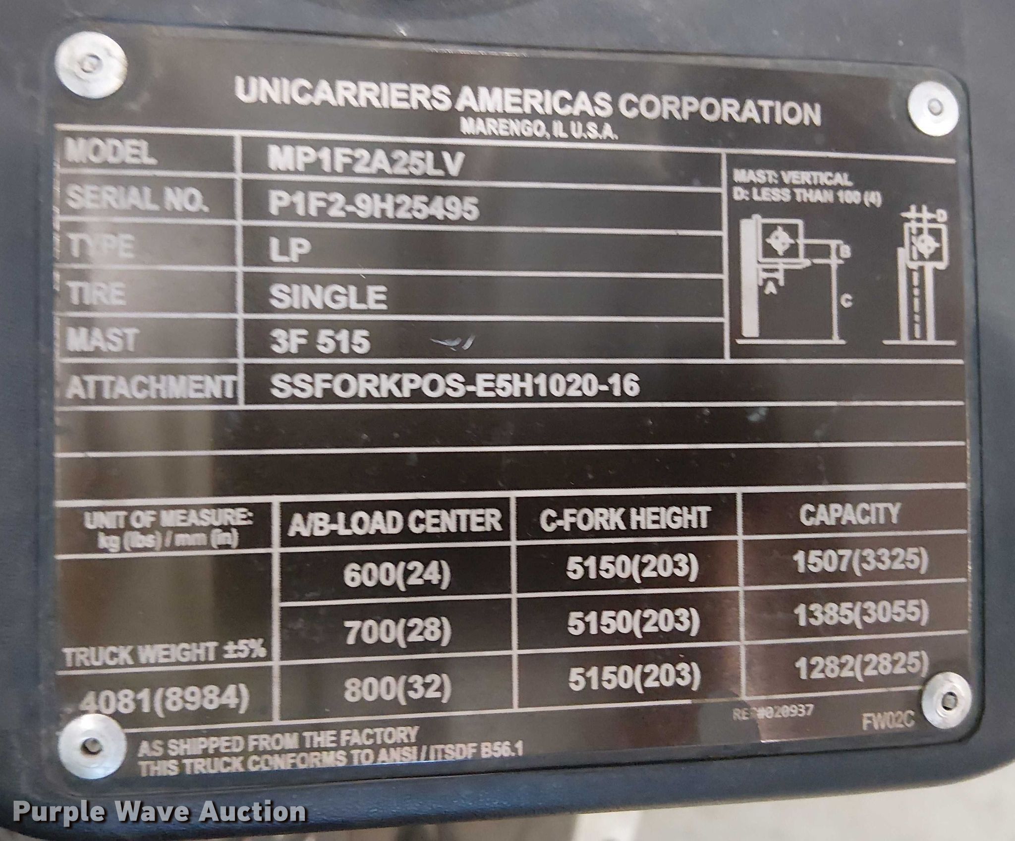 2019 UniCarriers PF50 forklift. Hours: 1,508 on meter, Miles or hours may vary, unit still in use, Serial: P1F2-9H25495, Unit #: SFS2722. Engine GCT GK21 L, Displacement: 2.1L, Cylinders: 4, Fuel type: LPG LP bottle: Not included. Transmission Automatic. Operators station OROPS, Canopy. Features Maximum lift capacity: 3,325 lbs, Maximum lift height: 203", Collapsed mast height: 88", Mast stages: 3, Side shift, Mast tilt, Fork positioner, Fork length: 48". Tires Front: 7.00-12, Rear: 6.00-9, Solid. Notes Warning indicator: Master warning. Ferguson. Perris, CA 92571