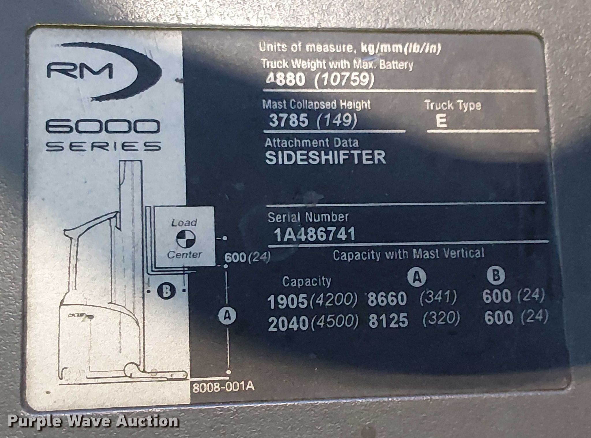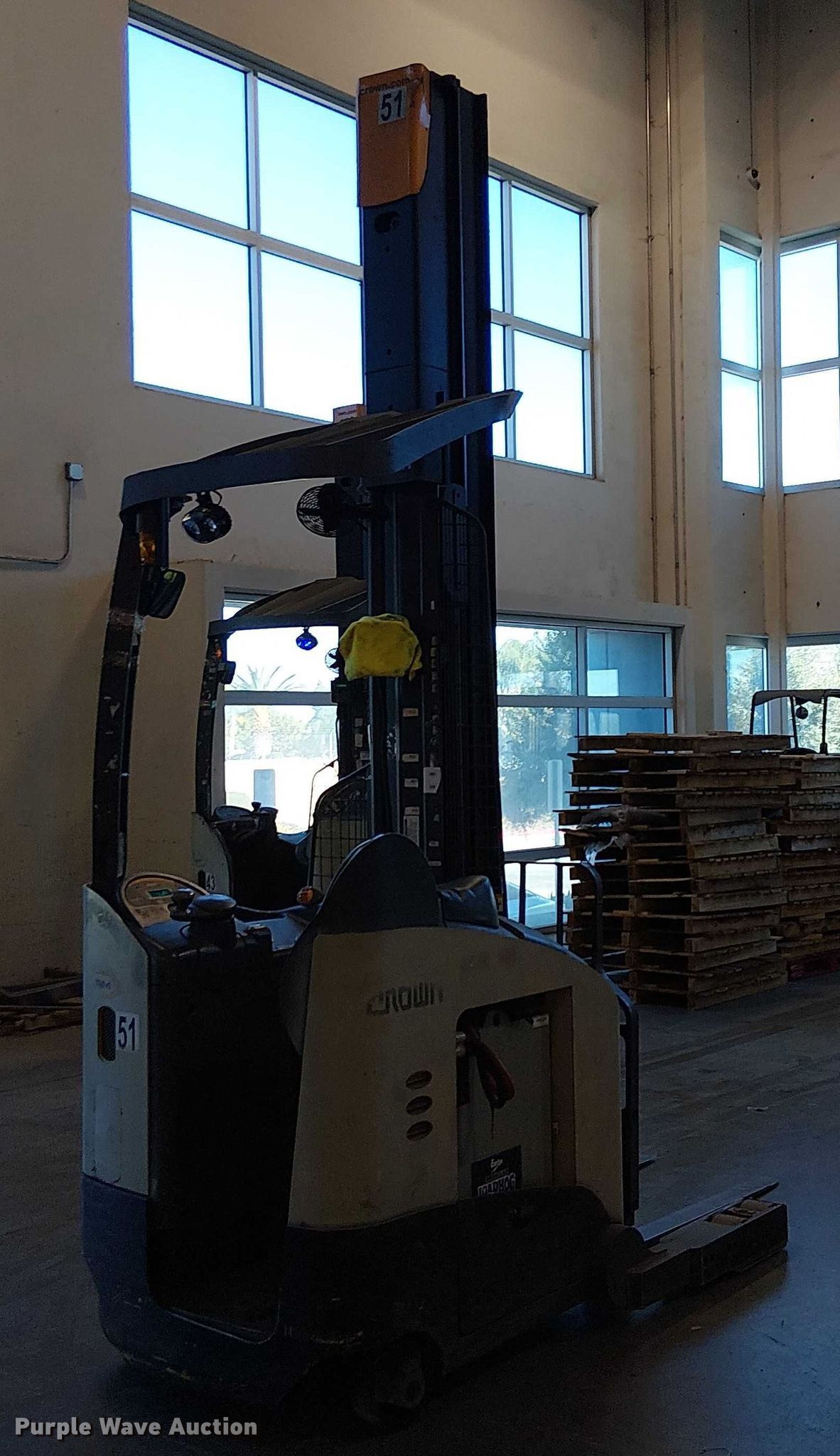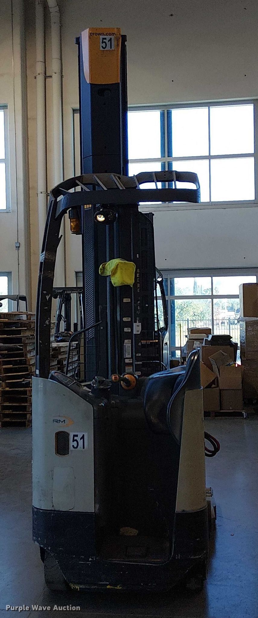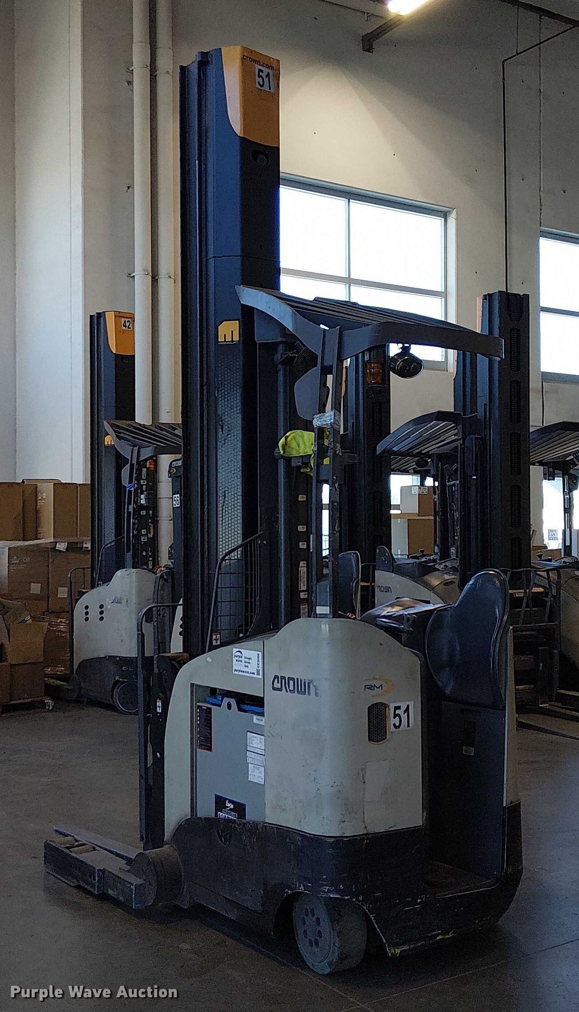 Purple Wave is selling a used Warehouse Forklift in California. This item is a 2017 Crown RM6095S-45 reach truck with the following: Hours: 9,412 on meter, Miles or hours may vary, unit still in use, Serial: 1A486741, Unit #: SFS2793