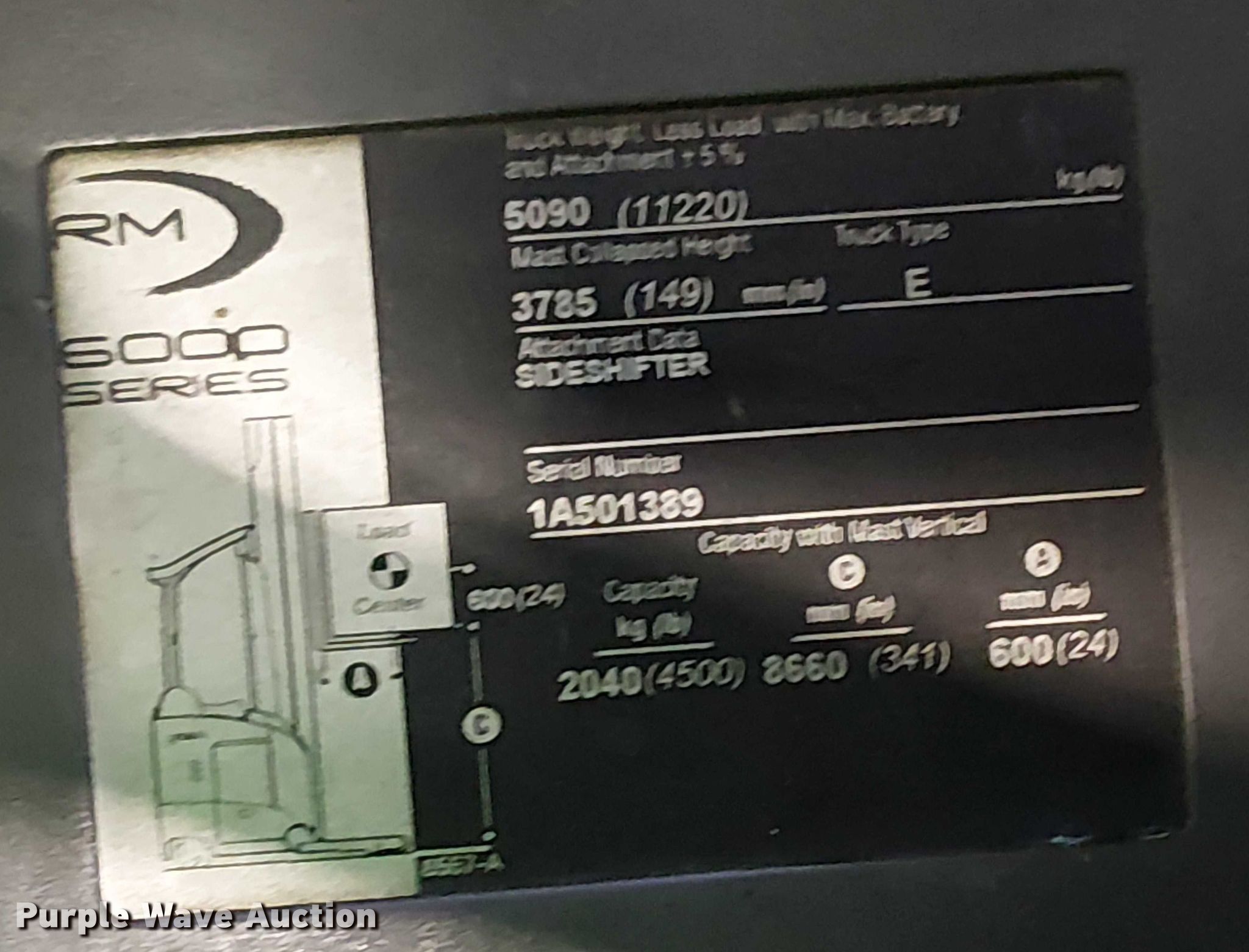 Purple Wave is selling a used Warehouse Forklift in California. This item is a 2017 Crown RM6095S-45 reach truck with the following: Hours: 12,103 on meter, Miles or hours may vary, unit still in use, Serial: 1A501389, Unit #: SFS2789