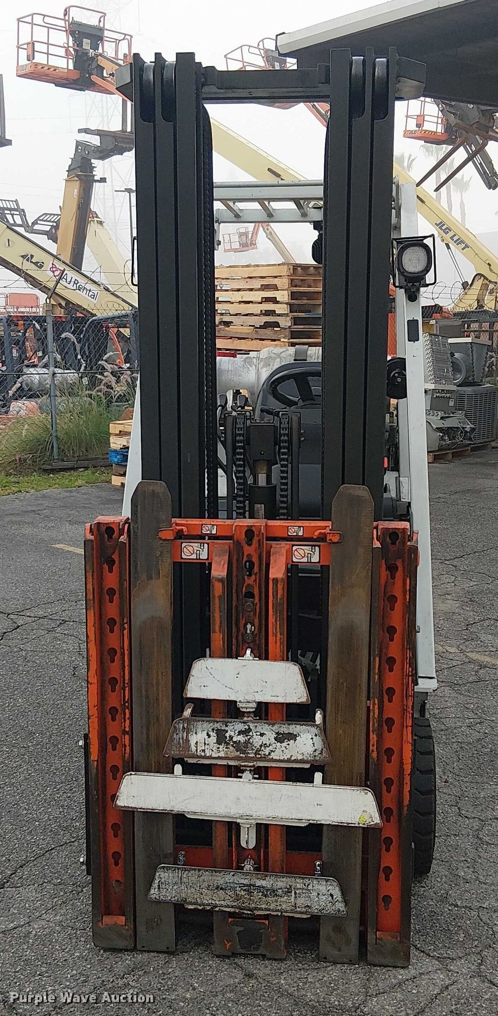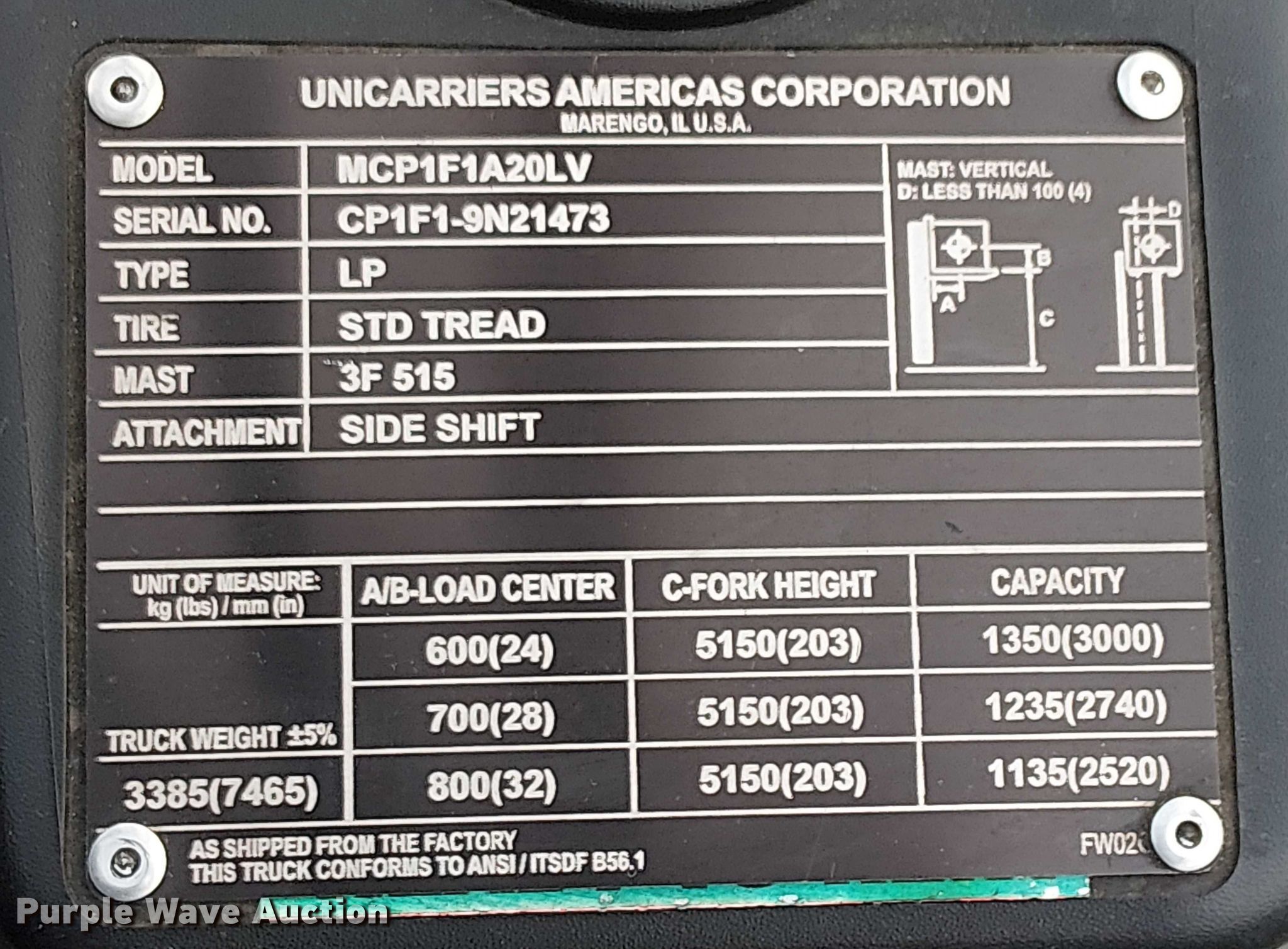 2017 UniCarriers CFS40 forklift. Hours: 1,087 on meter, Miles or hours may vary, unit still in use, Serial: CP1F1-9N21473, Unit #: SFS2807. Engine GCT K21L, Displacement: 2.1L, Cylinders: 4, Fuel type: LPG LP bottle: Not included. Transmission Automatic. Operators station OROPS. Features Maximum lift capacity: 3,000 lbs, Maximum lift height: 203", Collapsed mast height: 88", Mast stages: 3, Side shift, Mast tilt, Fork length: 48". Tires Front: 18x6x12 1/8, Rear: 14x5x10, Solid. Notes Warning indicator: Master warning. Ferguson. Azusa, CA 91702